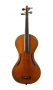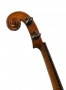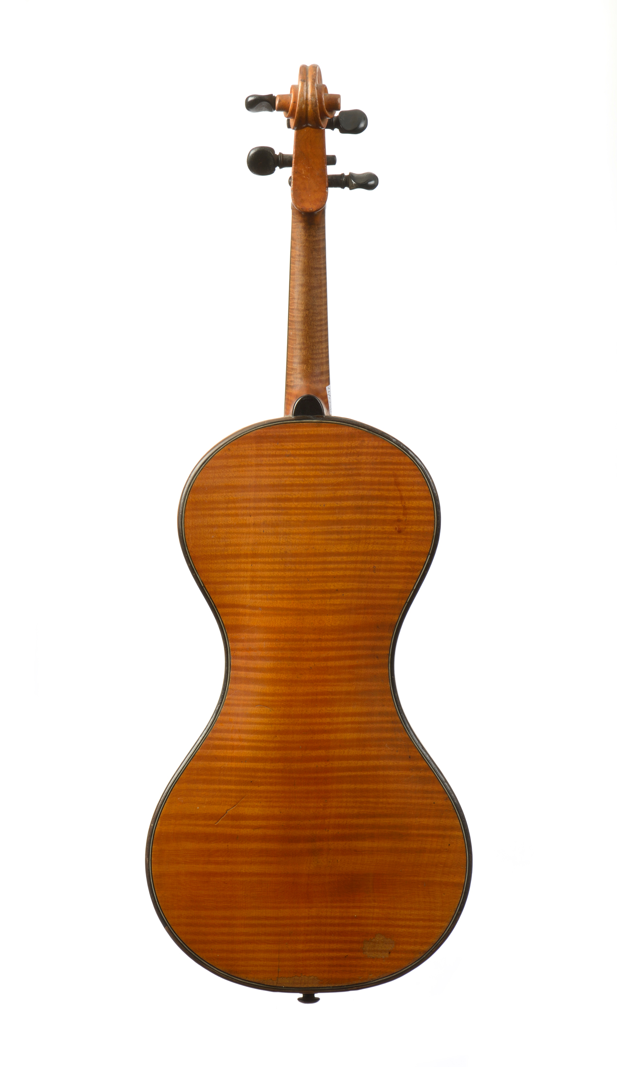 fait au XIXe par Francis Chanot à Mirecourt, modèle de recherche avec sa volute inversée, sans coins. Fond d'une pièce en érable aux ondes régulières, serrées, horizontales. Eclisses et tête du même bois. Vernis brun doré. Diverses cassures recollées sur la table. 370 mm.