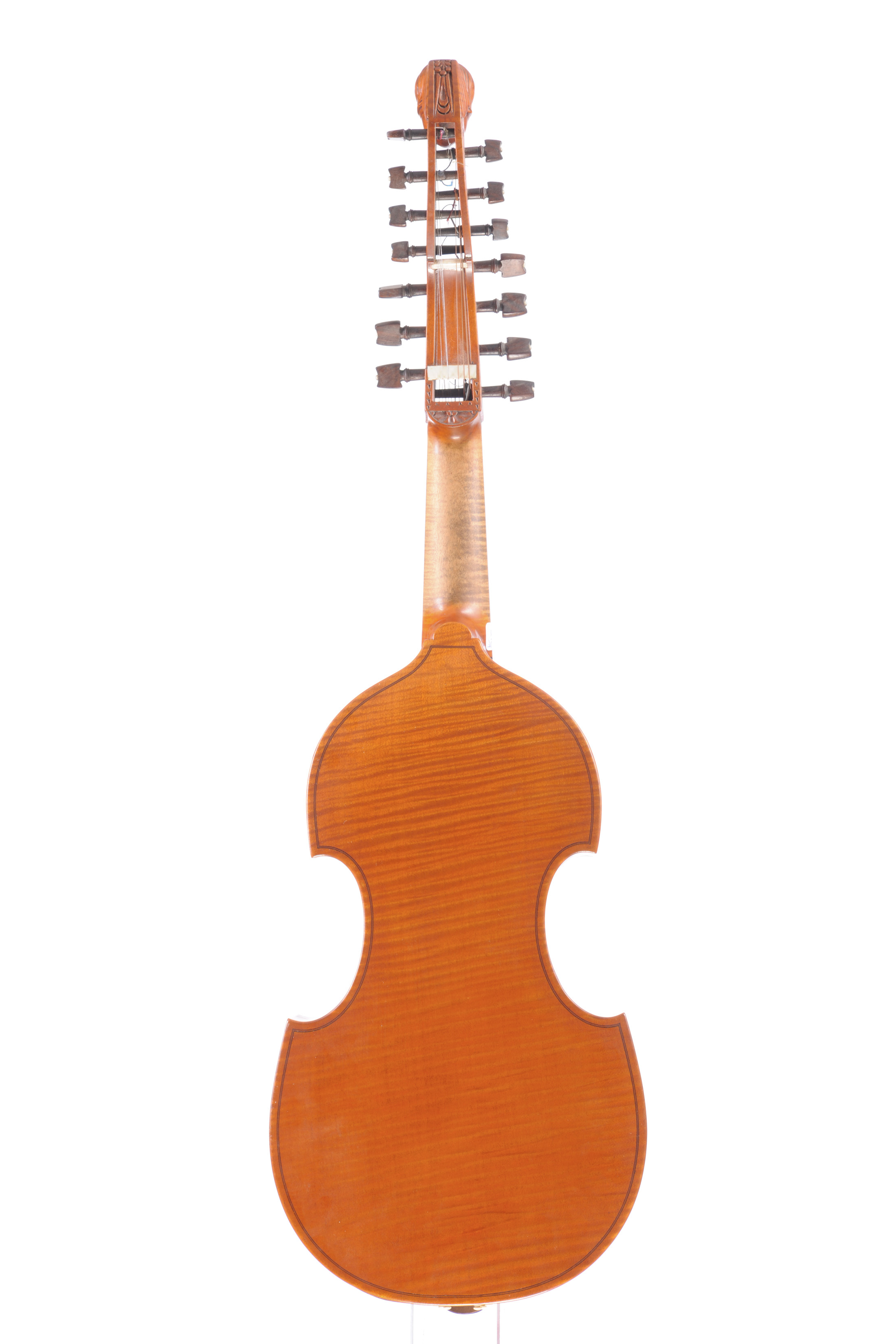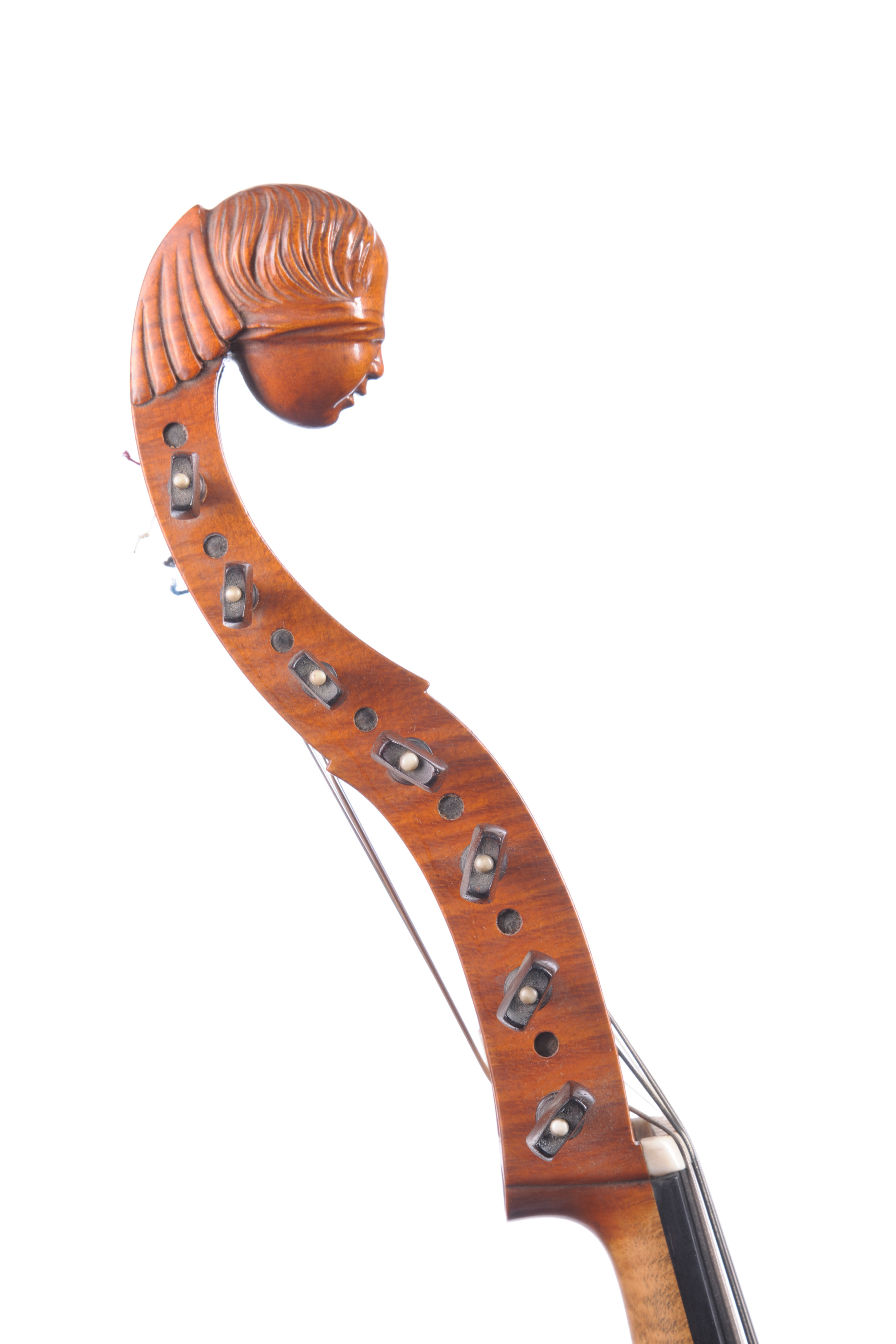 fait par Marius Didier Mattaincourt dont elle porte l'étiquette. Tête sculptée d'une femme aux yeux bandés. Table en épicéa aux pores serrés s'élargissant sur les bords. Fond plat en érable d'une pièce aux ondes régulières. Le manche et les éclisses sont du même bois. 419 mm.