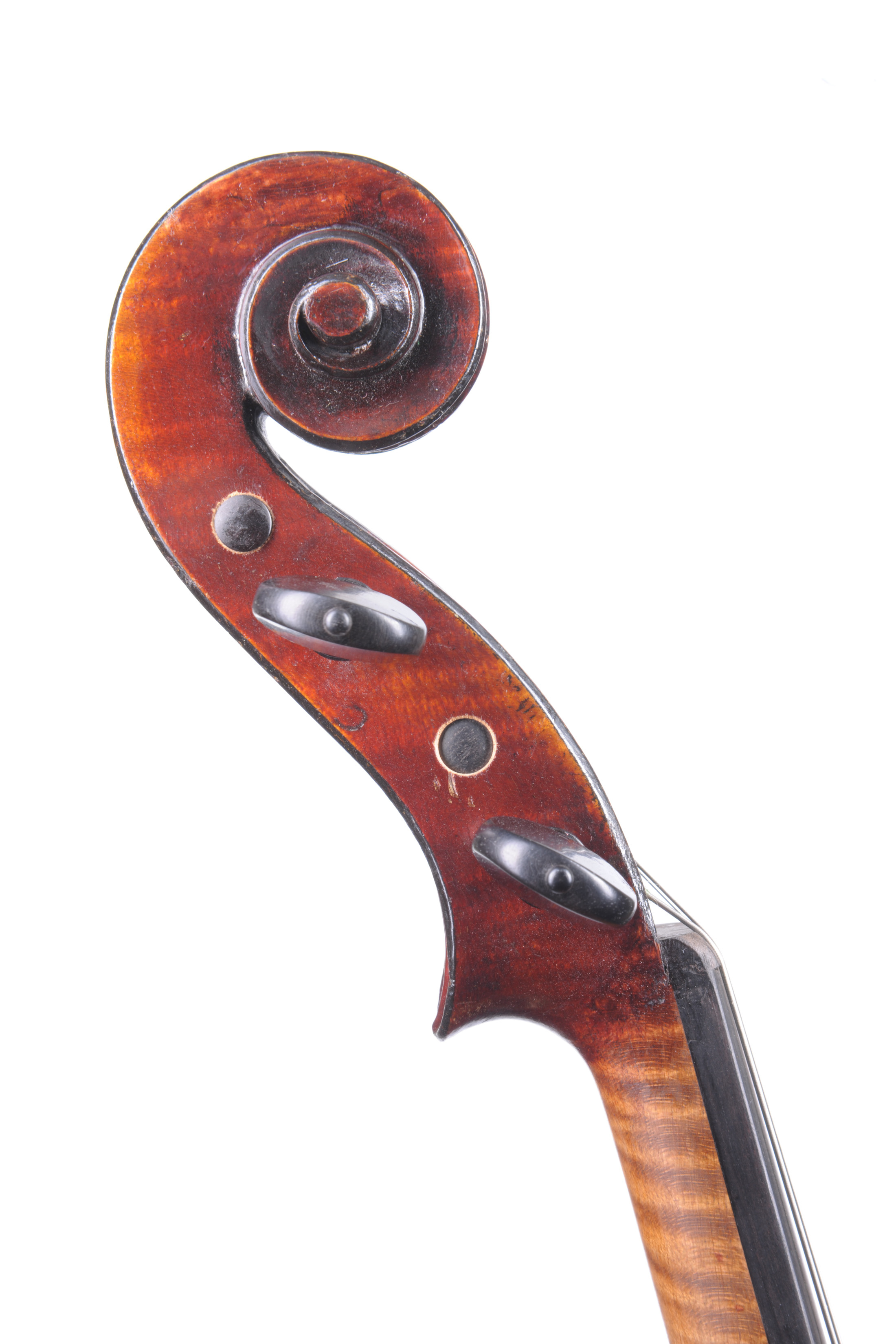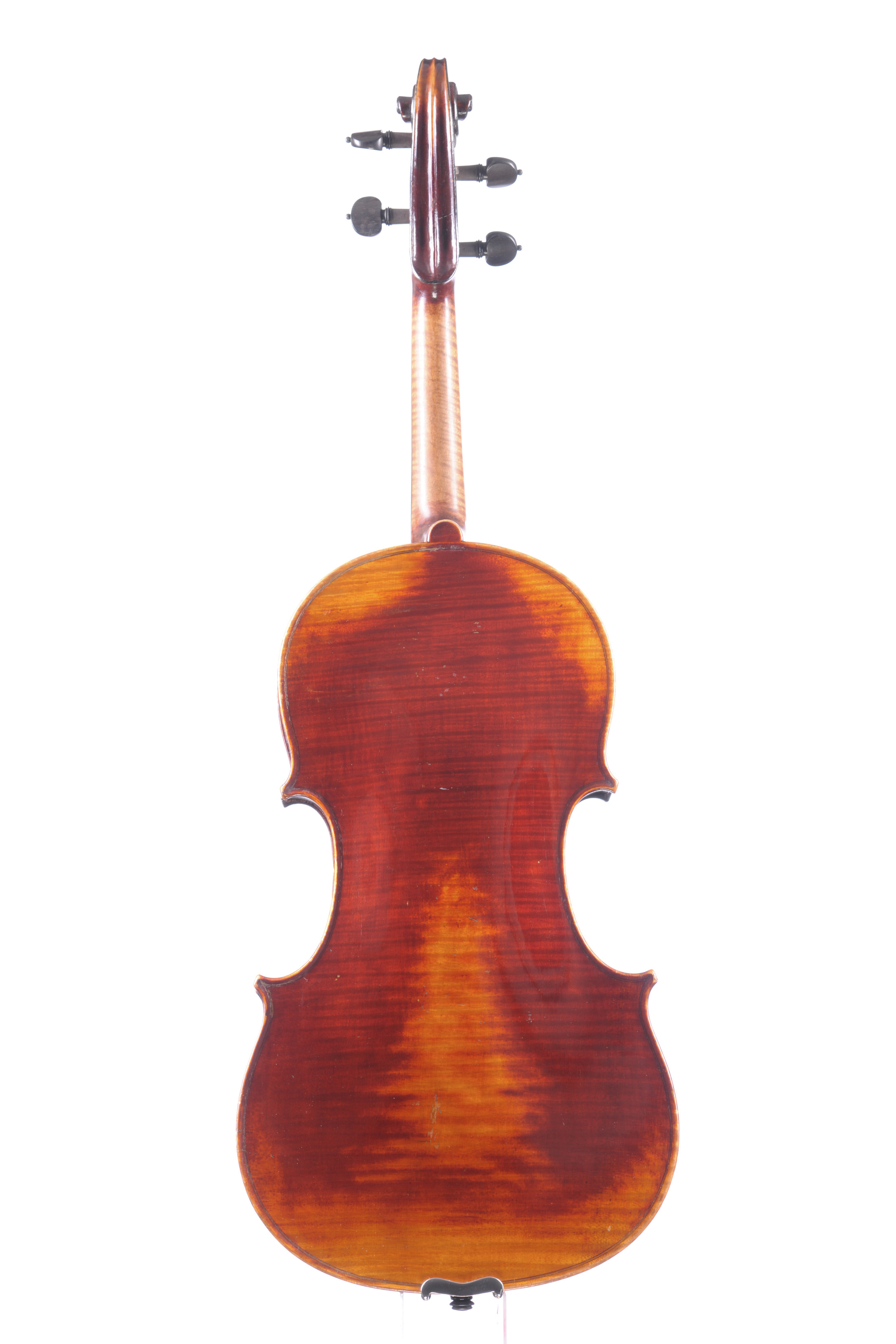 fait à Mirecourt vers 1860, par Justin Derazey dont il porte la marque au fer à l'intérieur J.D. 403 mm. Fond d'une pièce en érable. Eclisses et tête du même bois. vernis brun rouge sur fond doré. En bon état de jeu.