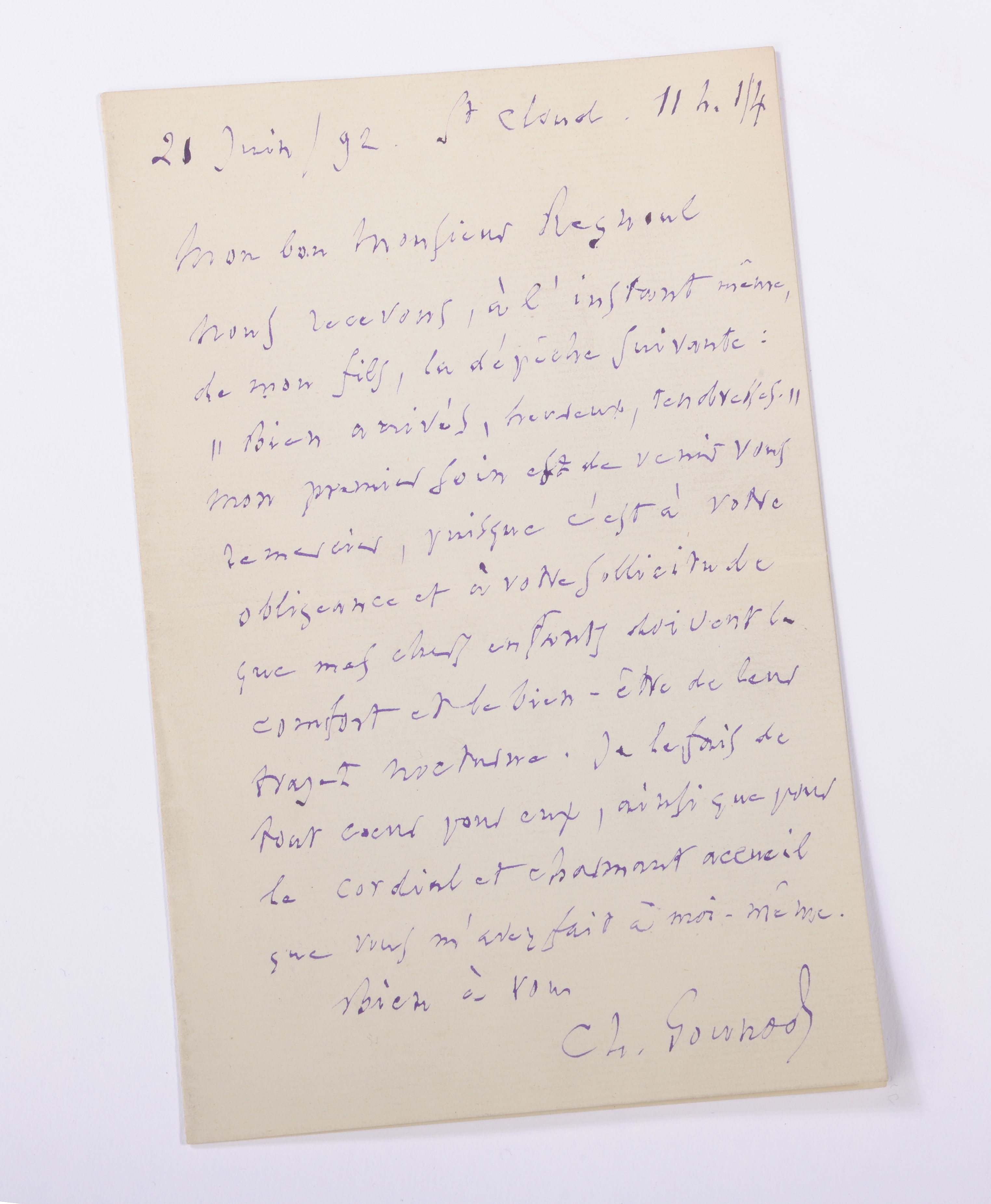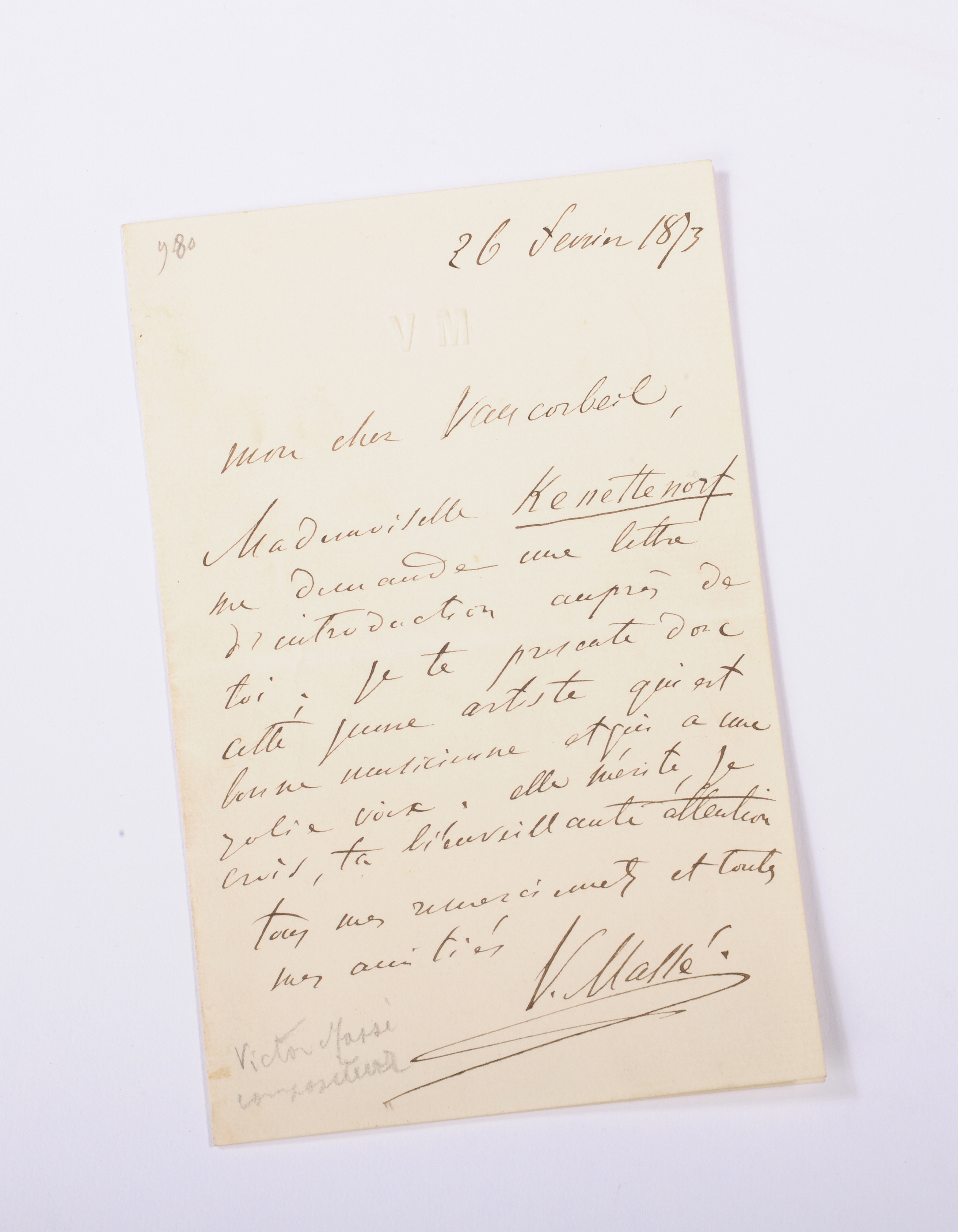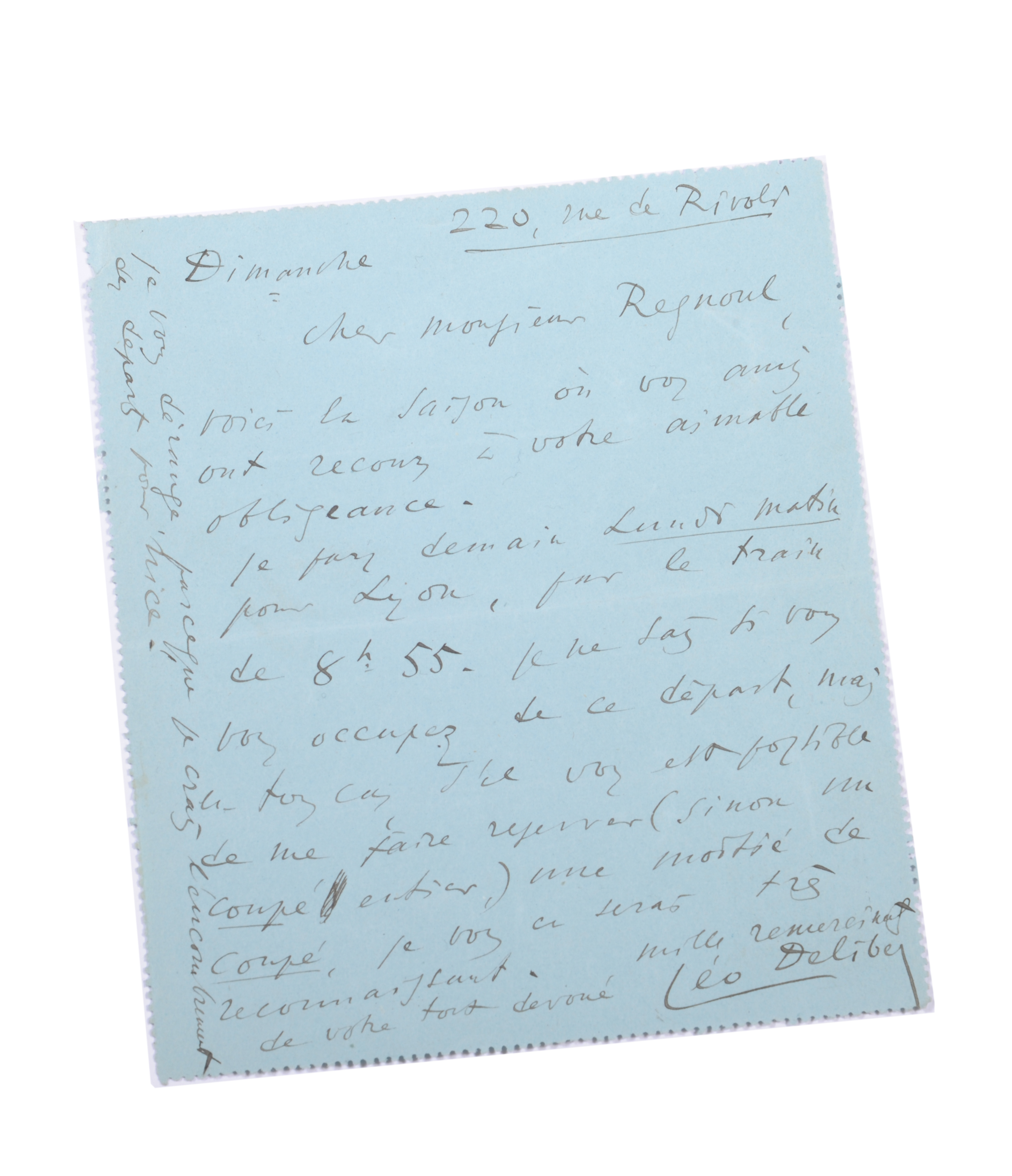 Lettres autographes signées de D.F.E. Auber (belle l.a.s. contrecollée, 1869), Henri Barraud, Gustave Charpentier (une lettre tapée et signée (1934), deux cartes a.s., traces de scotch), Camille Chevillard (2 belles l.a.s.), Alexandre Choron (1825), Edouard Colonne, Jules Danbé (1888), Louis Daussoigne-Méhul (1889), Léo Delibes, Louis Diémer (1891), Louis Drouet (flûtiste et compositeur, c. 1825), Théodore Dubois (1895), Camille Erlanger (belle l.a.s., 1904), M. de Fontaine (pianiste, l.a.s. à Fétis), Louis Ganne, André Gédalge (1903), Alexandre Georges (belle l.a.s., 1922), Benjamin Godard (1884, jointe une l.a.s. de son épouse), Charles Gounod (1892), Alexandre Guénin (violoniste et compositeur, 2 belles l.a.s., c. 1825), Ernest Guiraud (belle l.a.s. à Victorien Sardou, 2 pp.), Reynaldo Hahn (2 l.a.s., 1904, 1908), Georges Hüe (1913), Vincent d’Indy (l.a.s. de 2 pp., 1896), Edouard Lalo, Charles Lamoureux (amusante l.a.s. de recommandations domestiques, 3 pp.), Charles Levadé, Paul Lütgen (« artiste de l’Académie Royale de Musique », belle l.a.s. à Adolphe Adam, 1835), Aimé Maillard (compositeur, 1861), Victor Massé (1893), André Messager, Olivier Métra (2 l.a.s., 1880), Gustave Nadaud (2 l.a.s., 1860 et 1866), Emile Paladilhe (1889), Jules Pasdeloup (2 l.a.s., 1884), Georges Pfeiffer (pianiste et compositeur, 1874), Gabriel Pierné (1904), Robert Planquette (1892), Camille Saint-Saëns, Florent Schmitt (2 l.a.s., une carte postale a.s. à P. Coppola, 1924, trous de classement), Julien Tiersot (une c.a.s. et une l.a.s., 1906), Ambroise Thomas (3 l.a.s., 1887-1892), G.M. Witkowski (compositeur lyonnais, très belle l.a.s., 7 pp., 1900).