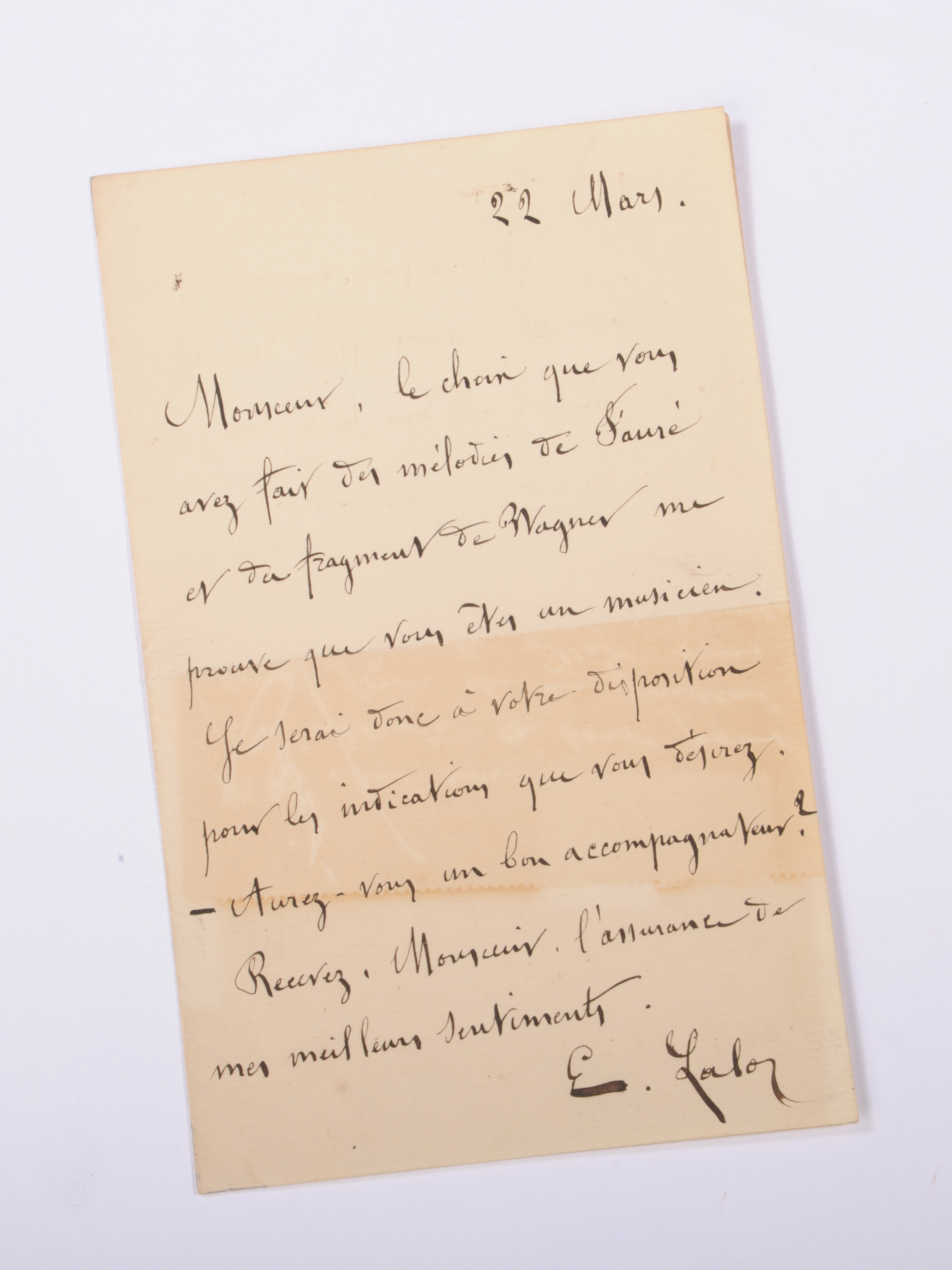 Très bel ensemble couvrant plus d’un siècle d’activités de composition, de concerts, de rendez-vous musicaux en France, avec de grandes signatures et d’autres moins connues mais qui ont contribué au dynamisme musical du pays. Excellent état général sauf mention explicite, les dates des lettres étant celles indiquées par le musicien :
