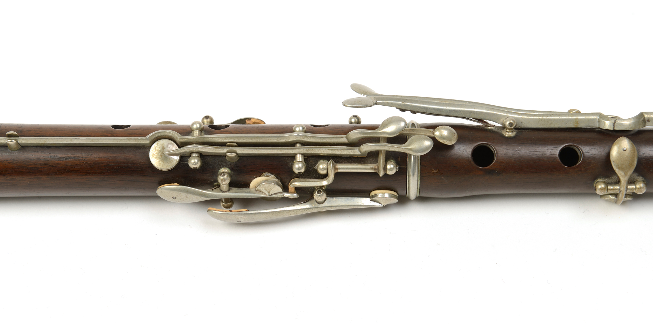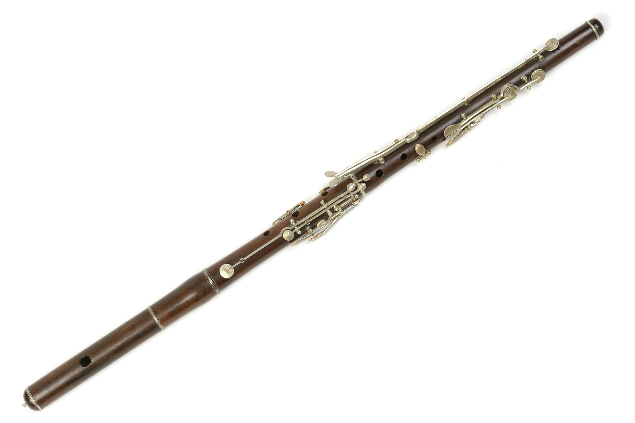 Belle flute traversière en bois de palissandre, en 4 pièces, 15 clés en maillechort. Tampons, ressors et lièges en bon état.
