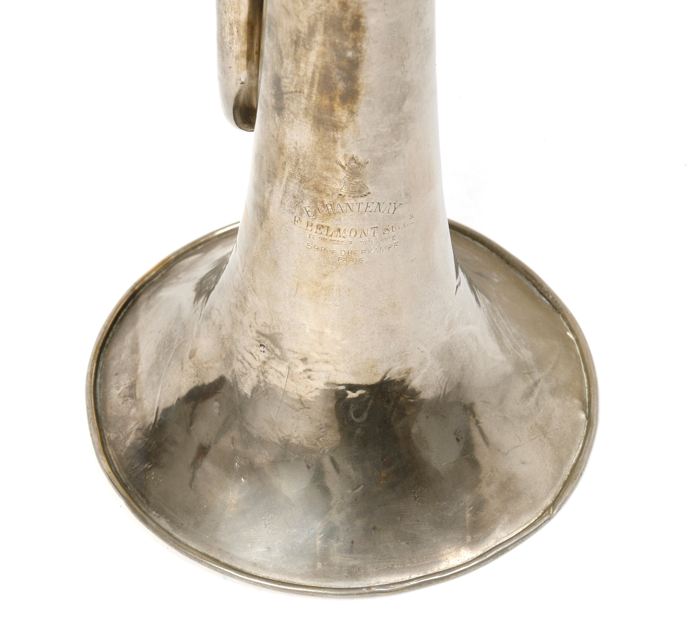 dont il porte la marque E.Chantenay, F.BELMONT successeur 59 rue oberkampf Paris en métal Nickelé. Bossué et rayé. Si bémol. 2 pistons. Embouchure en argent d'un autre instrument.