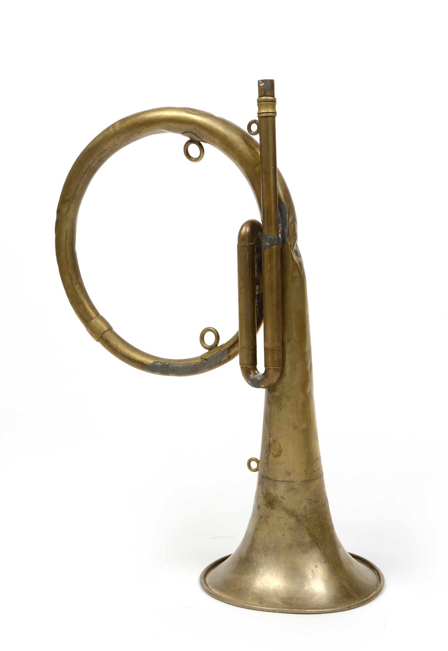 En laiton. de forme cor de marche. Bossué et rayé. Vendu en l'état.