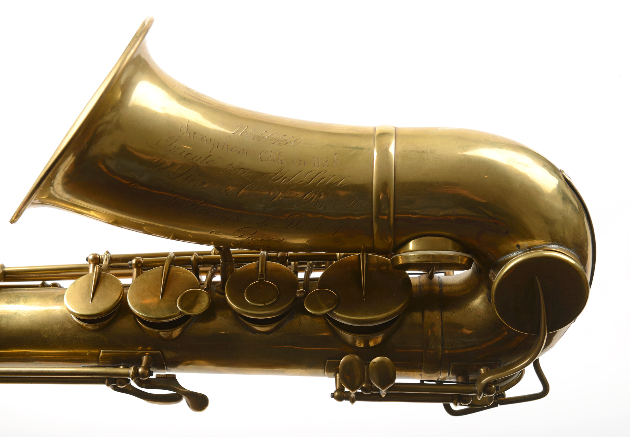 Exceptionnel saxophone alto fait par Adolf Sax en Laiton. Il est estampillé "Seul Grand Prix 1867". Laiton. N°40150. L'ensemble est retamponné, ressors et lièges changés. Une clé cassée et manquante.