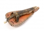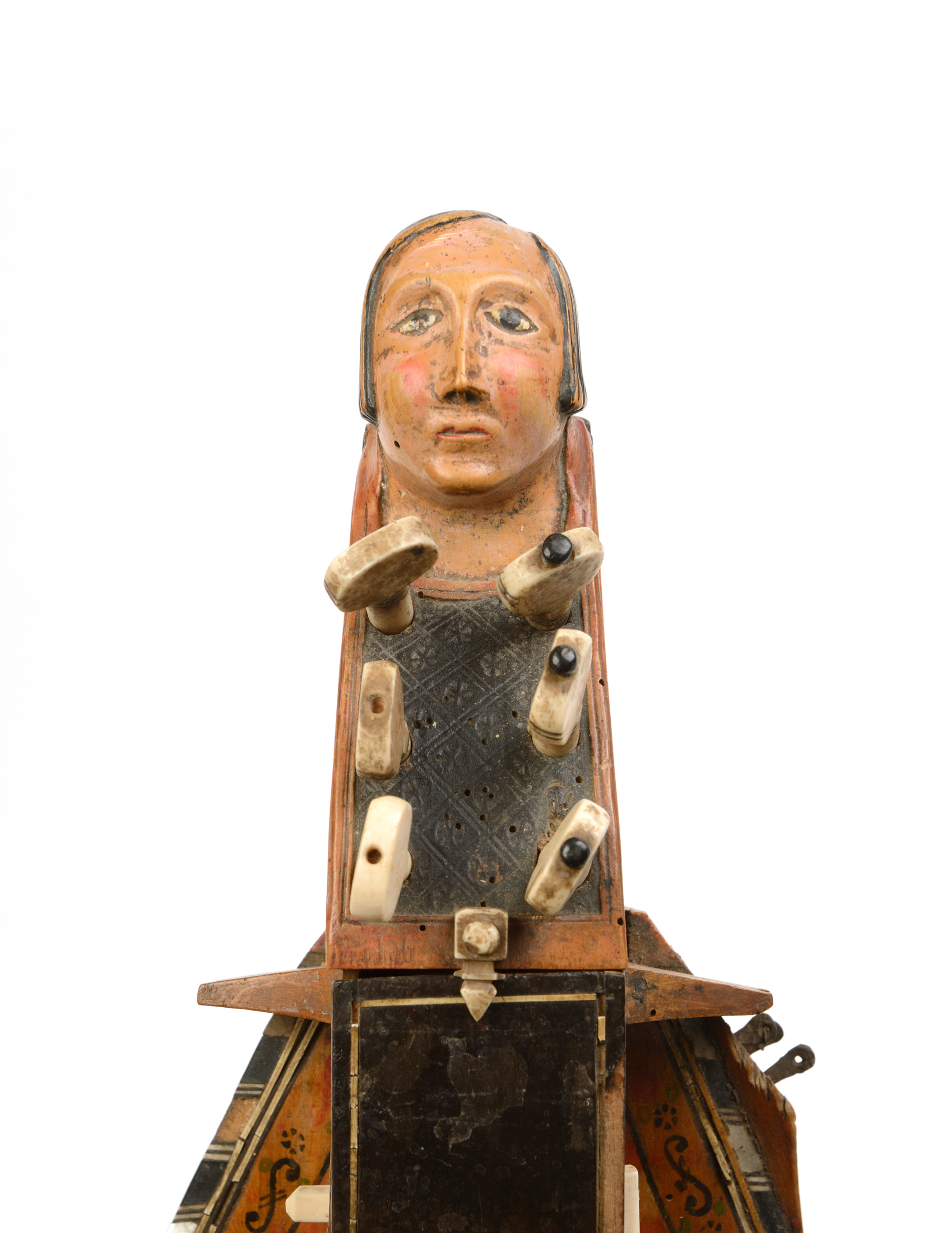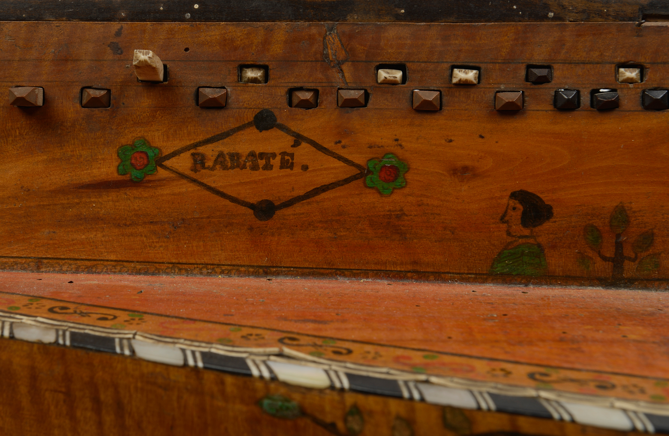 Intéressante Vièle à roue à restaurer, de forme bateau, portant la marque de Rabate et une étiquette illisible. Table peinte. Cassures et traces de vers. Tête sculptée d'un homme. Vielle faite dans le Berry, dans le style de Pouget. 730 mm.