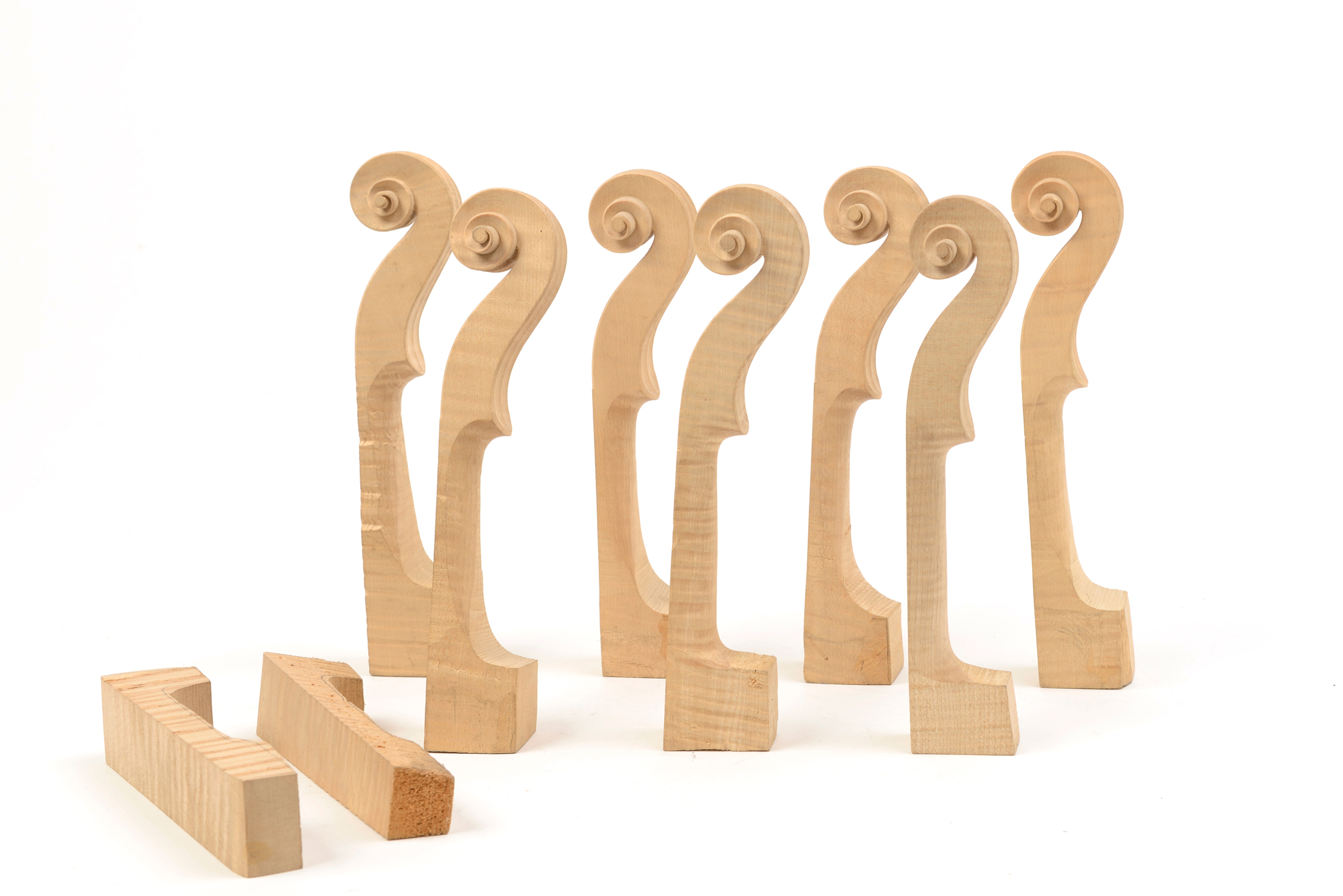 7 manches de violon ébauchées en érable ondé, et deux blocs à enture. Bois ancien de plus d'un siècle.