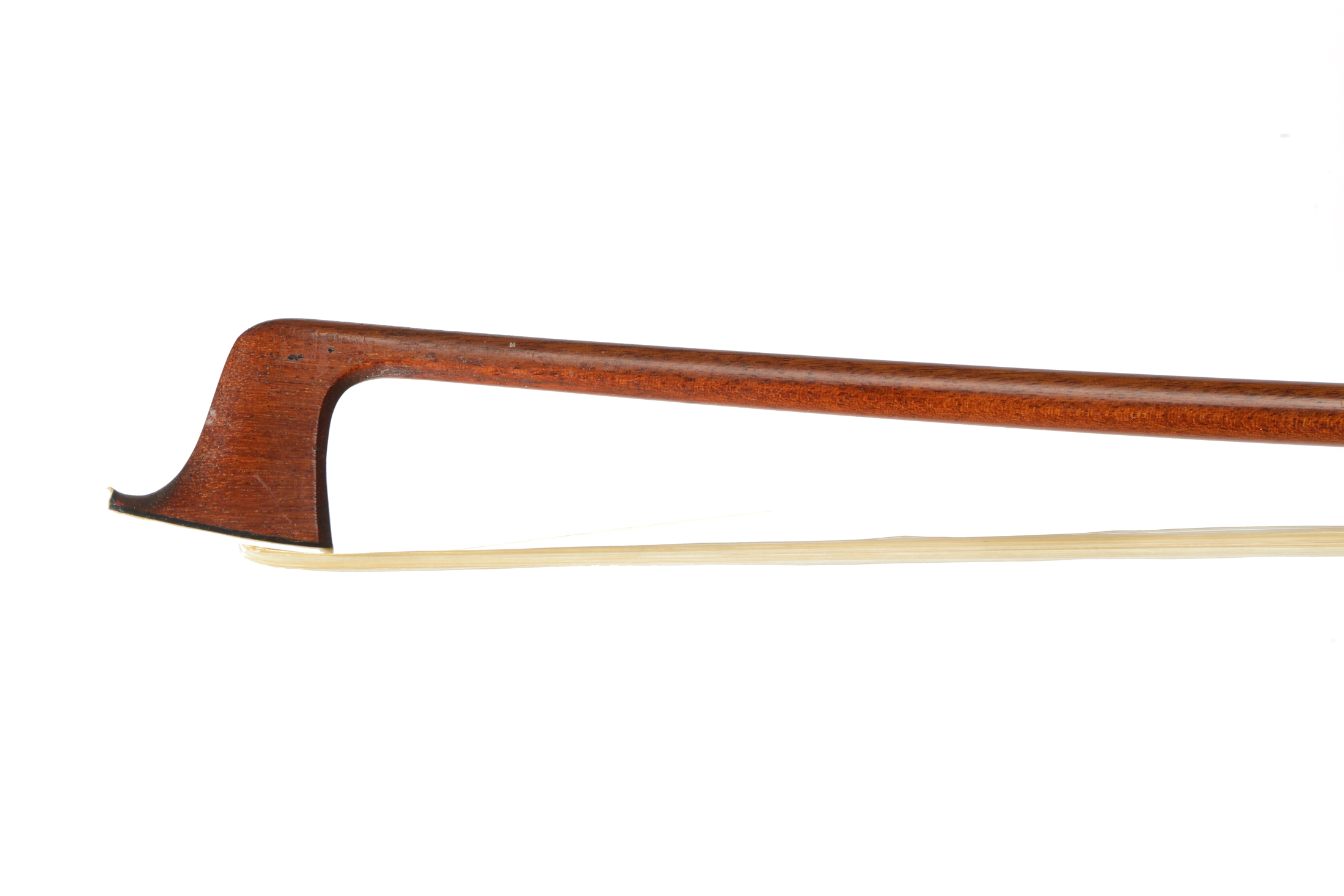 fait dans les ateliers de Morizot. Baguette en bois de pernambouc. Hausse ébène à talon rond, montée maillechort. Il porte une marque apocryphe de Lafleur. Bouton plein.