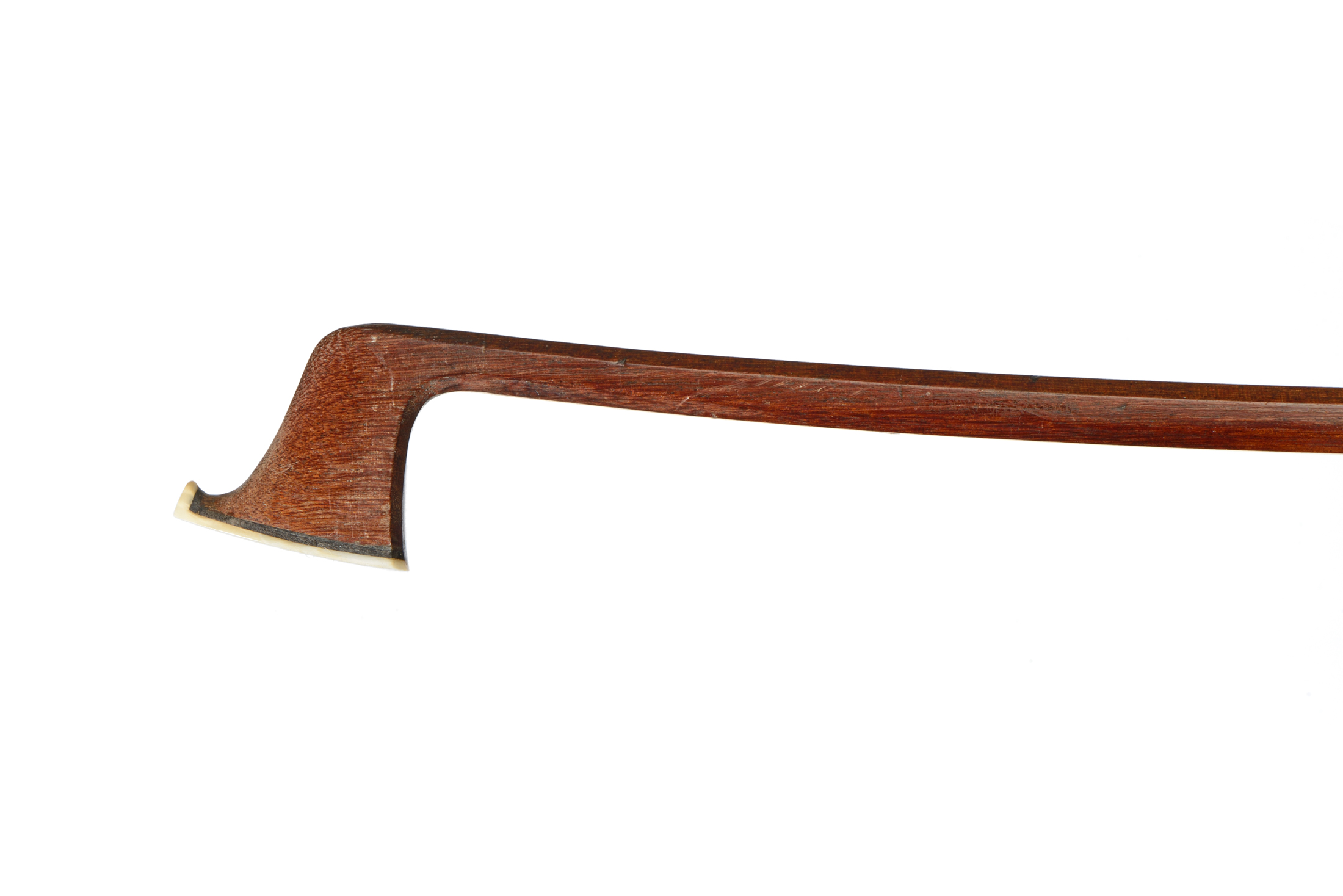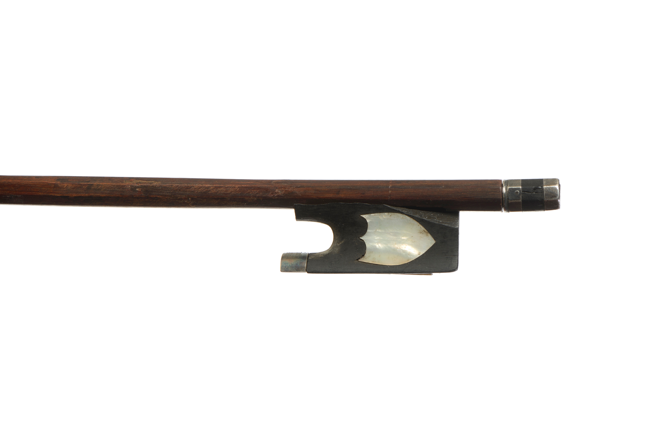 fait au début du XIXe. Baguette octogonale en pernambouc. Hausse de la même période en ébène, burgauté d'une nacre de forme blason. L'archet est monté argent . 45 g sans mèche ni garniture. Hausse à restaurer.