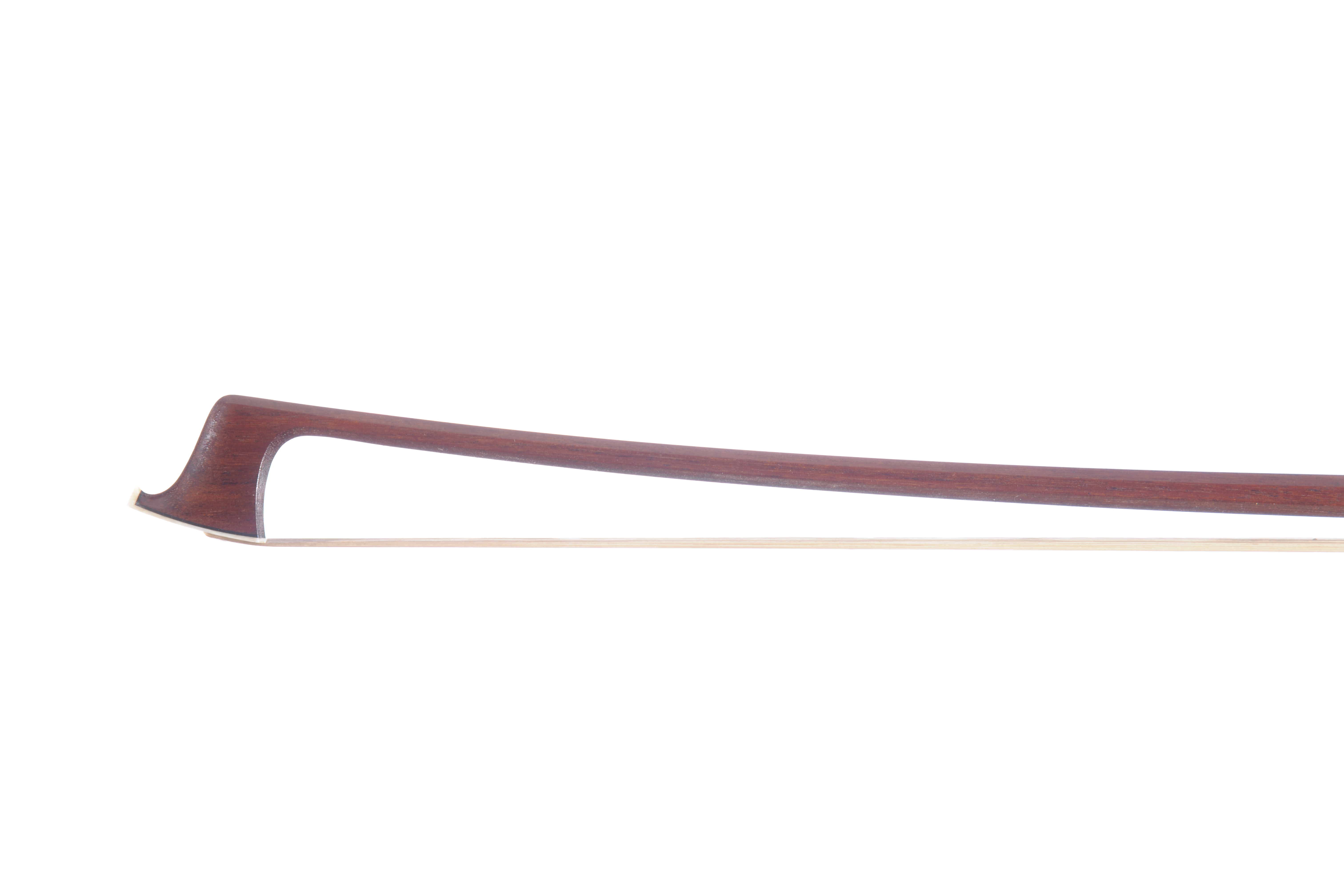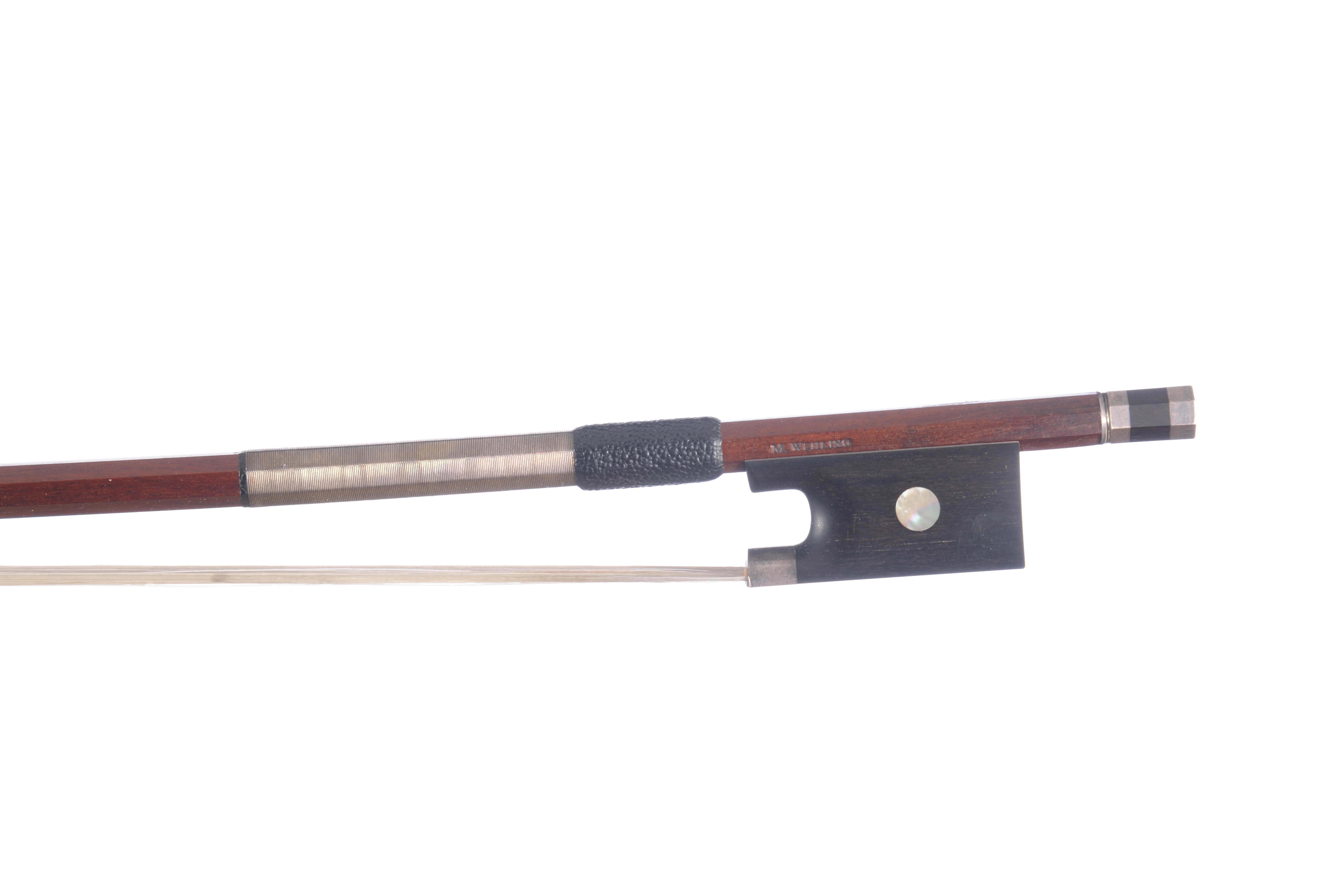 Archet d'alto, Matthew Wehling. Baguette en beau bois de pernambouc, baguette octogonale. Hausse ébène montée argent aves grain. Bouton deux viroles, argent ébène. 71,8g. 727 mm.