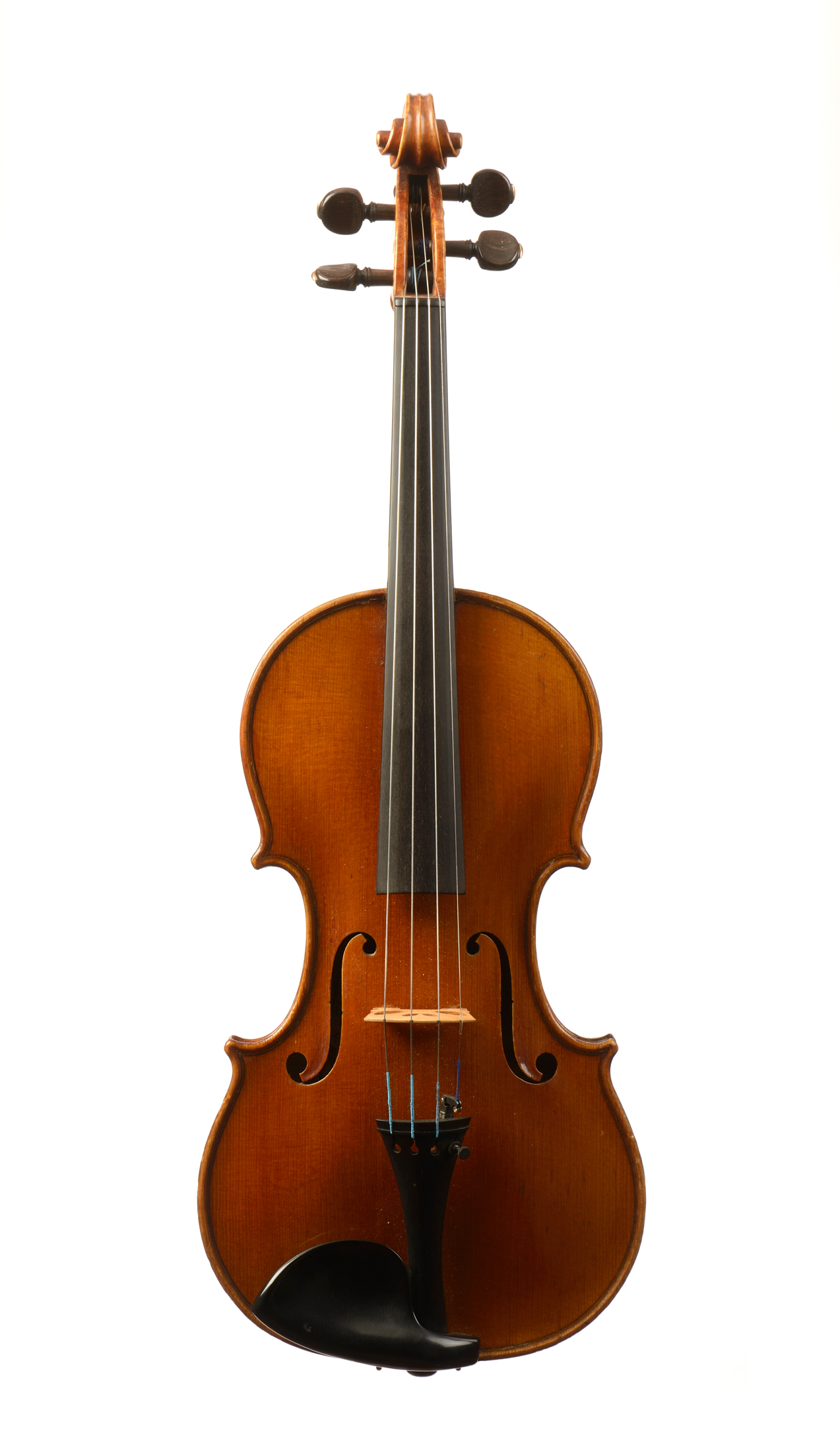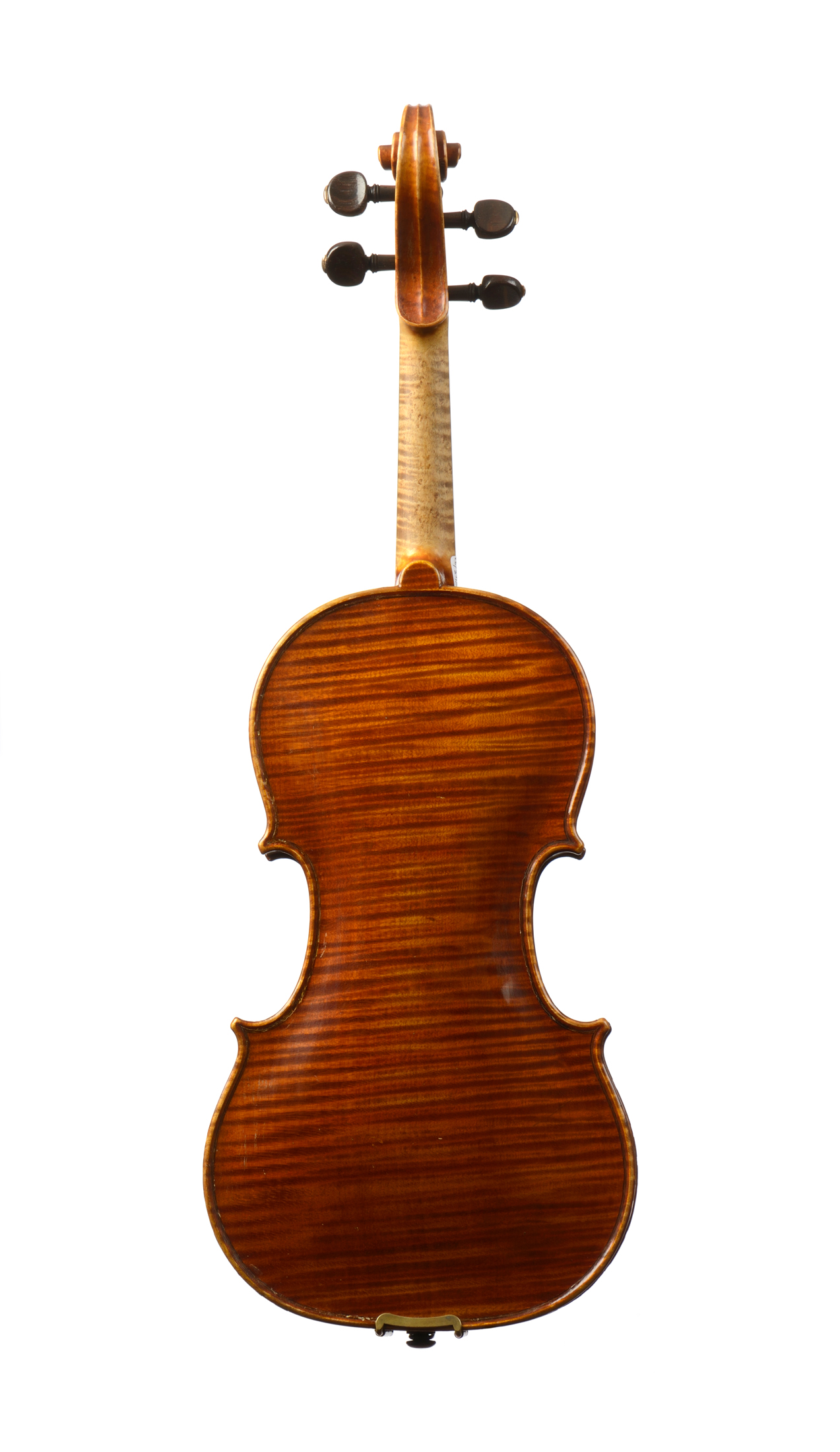 dont il porte l'étiquette originale. Fait à Marseille, en 1935. Fond d'une pièce en érable aux ondes régulières horizontales. Eclisses et tête du même bois. Table en épicéa aux pores réguliers. Vernis brun sur don doré. 357 mm.