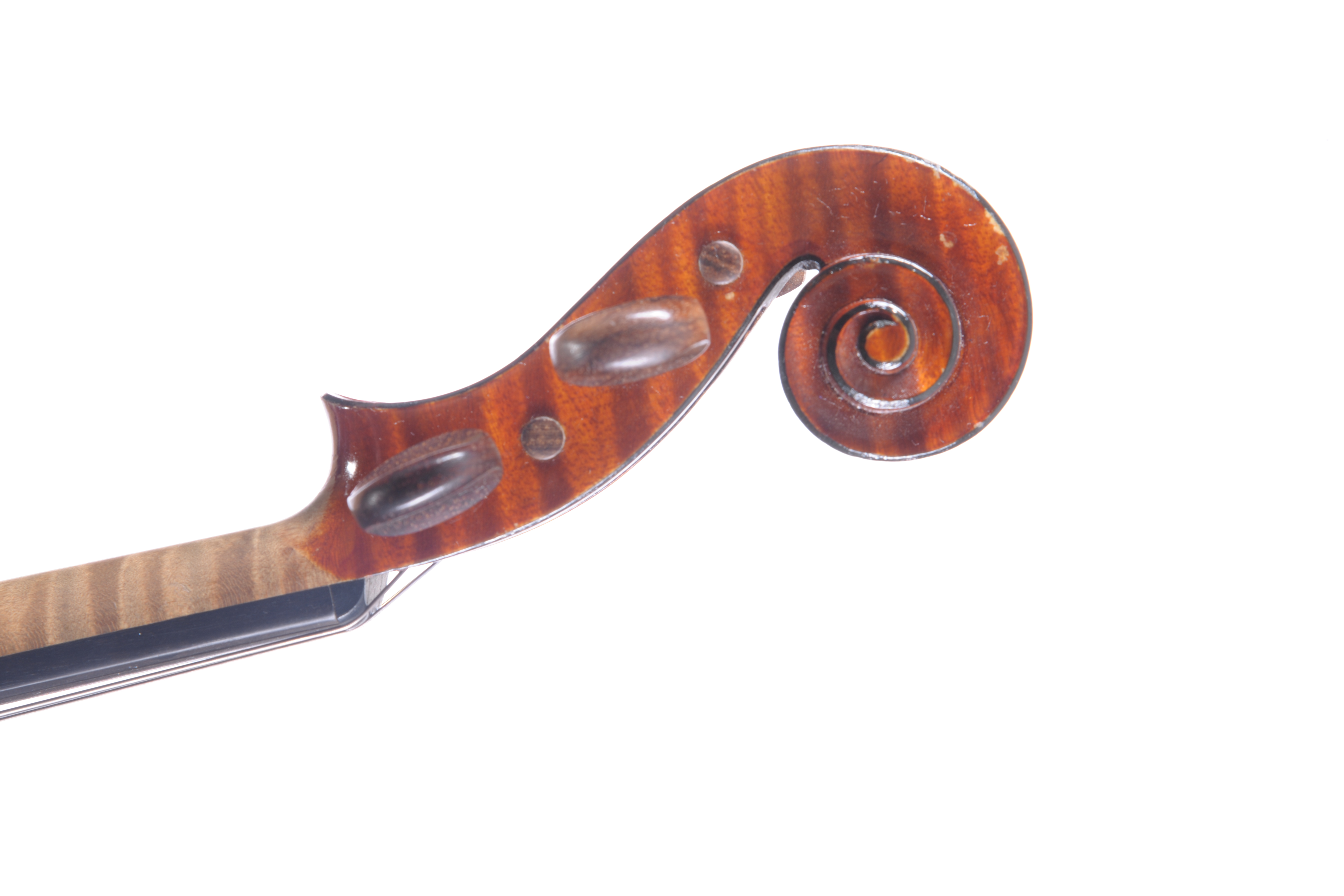 fait à Cremona en 1995. Fond de deux pièces, aux ondes larges flammées, descendantes sur les bords. Vernis orangé sur fond doré. 356 mm.