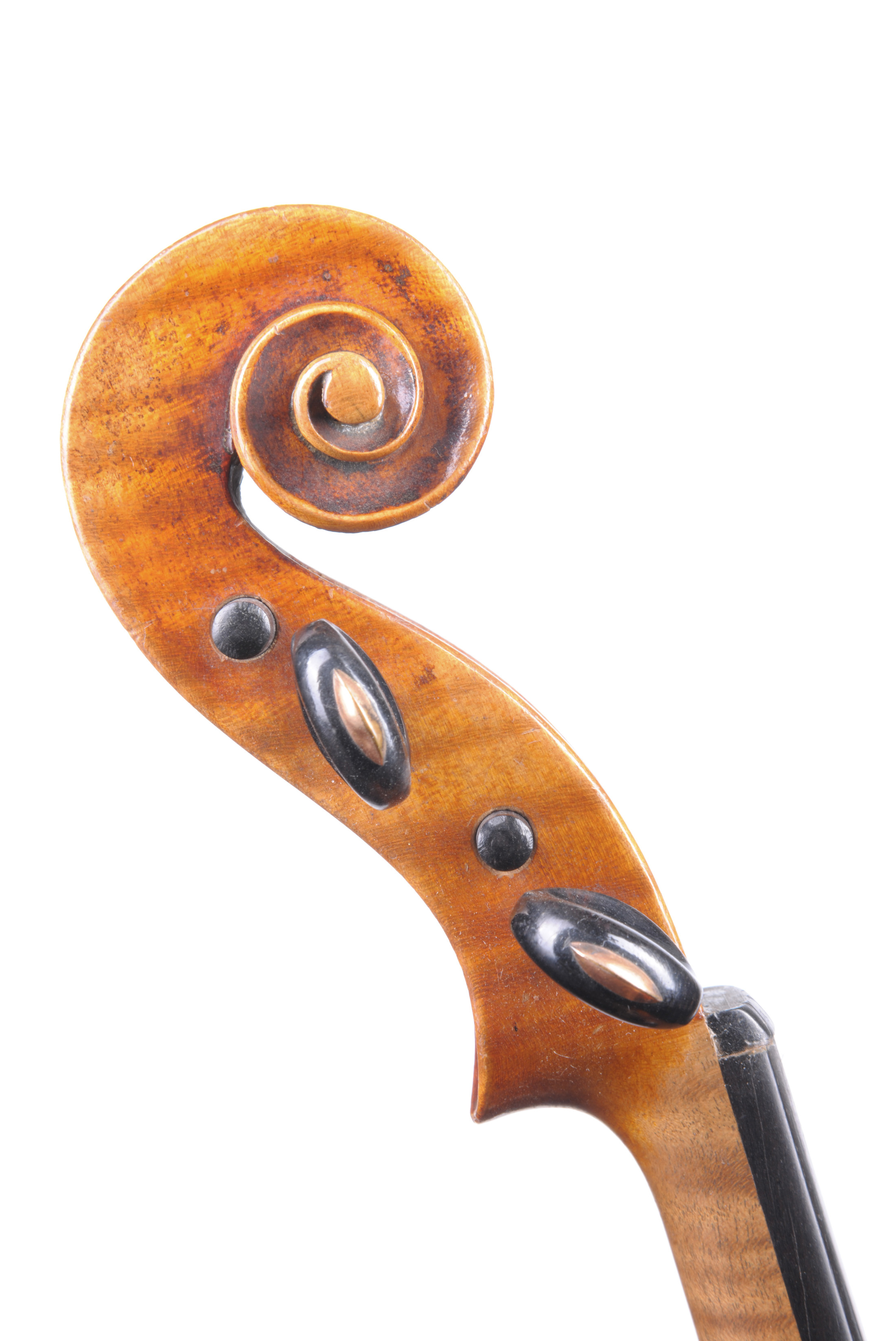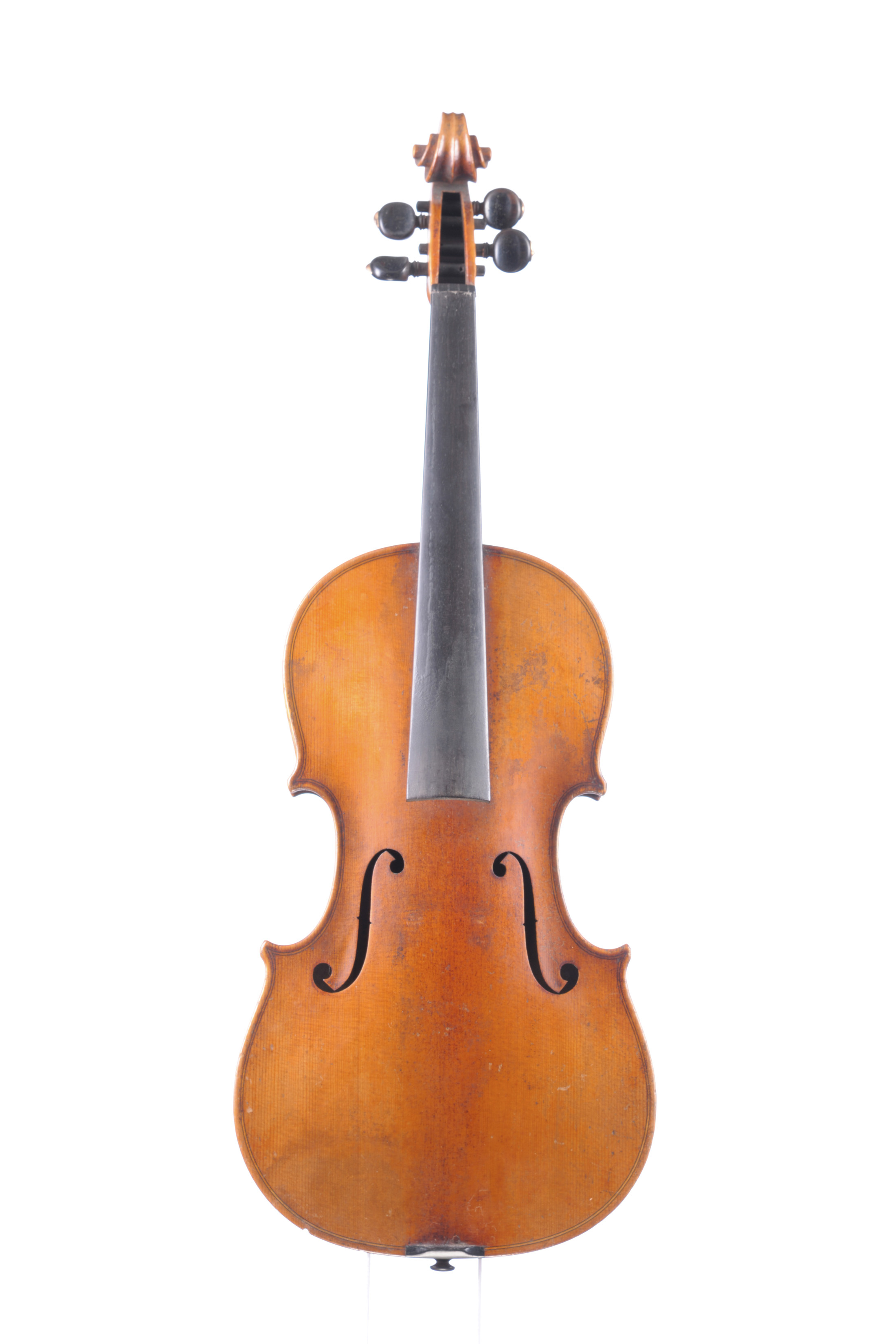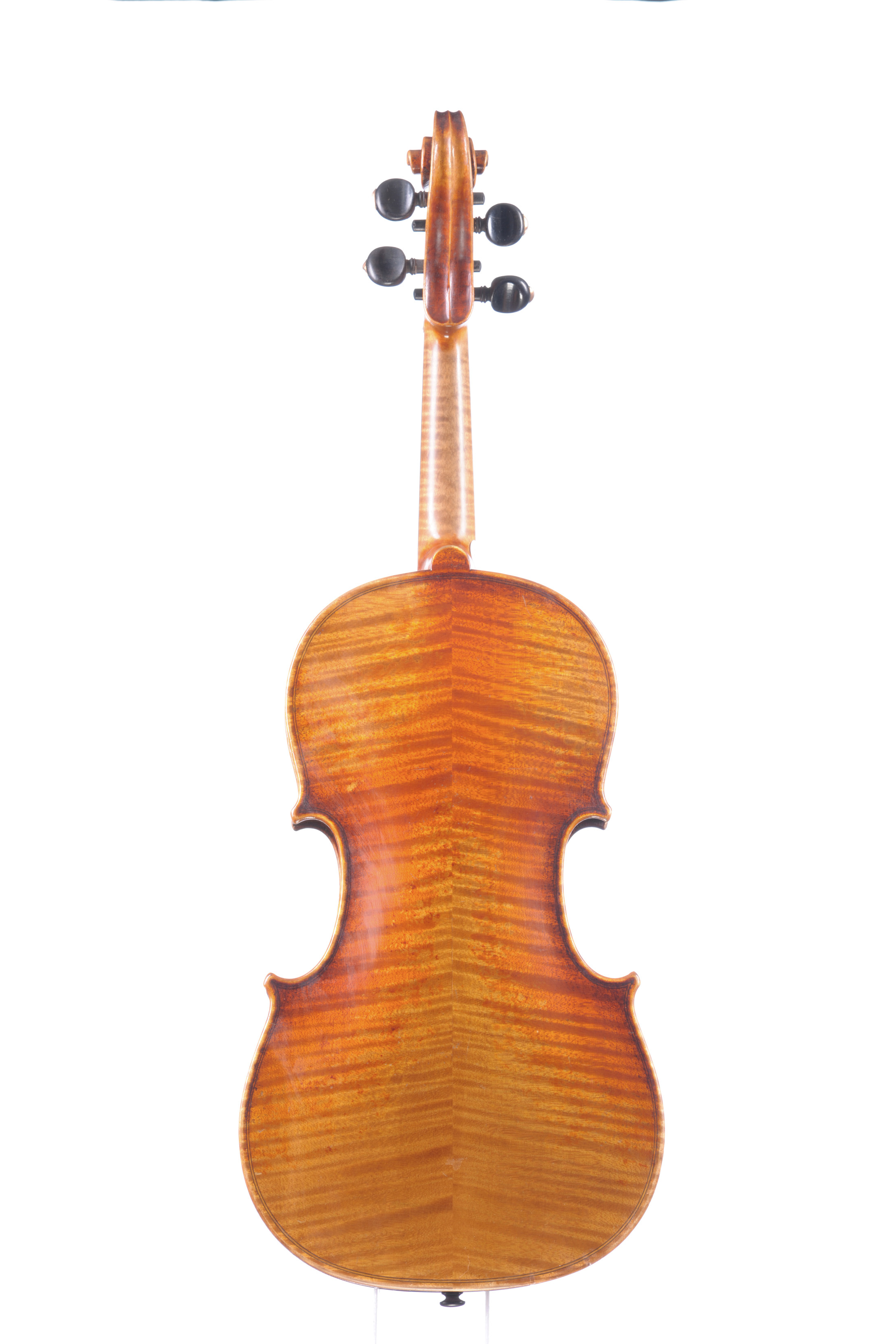 fait au début du XXe portant une étiquette de Lupot. Cassure sur l'éclisse du bas. Fond de deux pièces en bel érable aux ondes régulières descendantes. Eclisses et tête du même bois. Table en épicéa aux pores réguliers s'élargissant sur les bords. Vernis brun orangé sur fond doré. 358 mm.