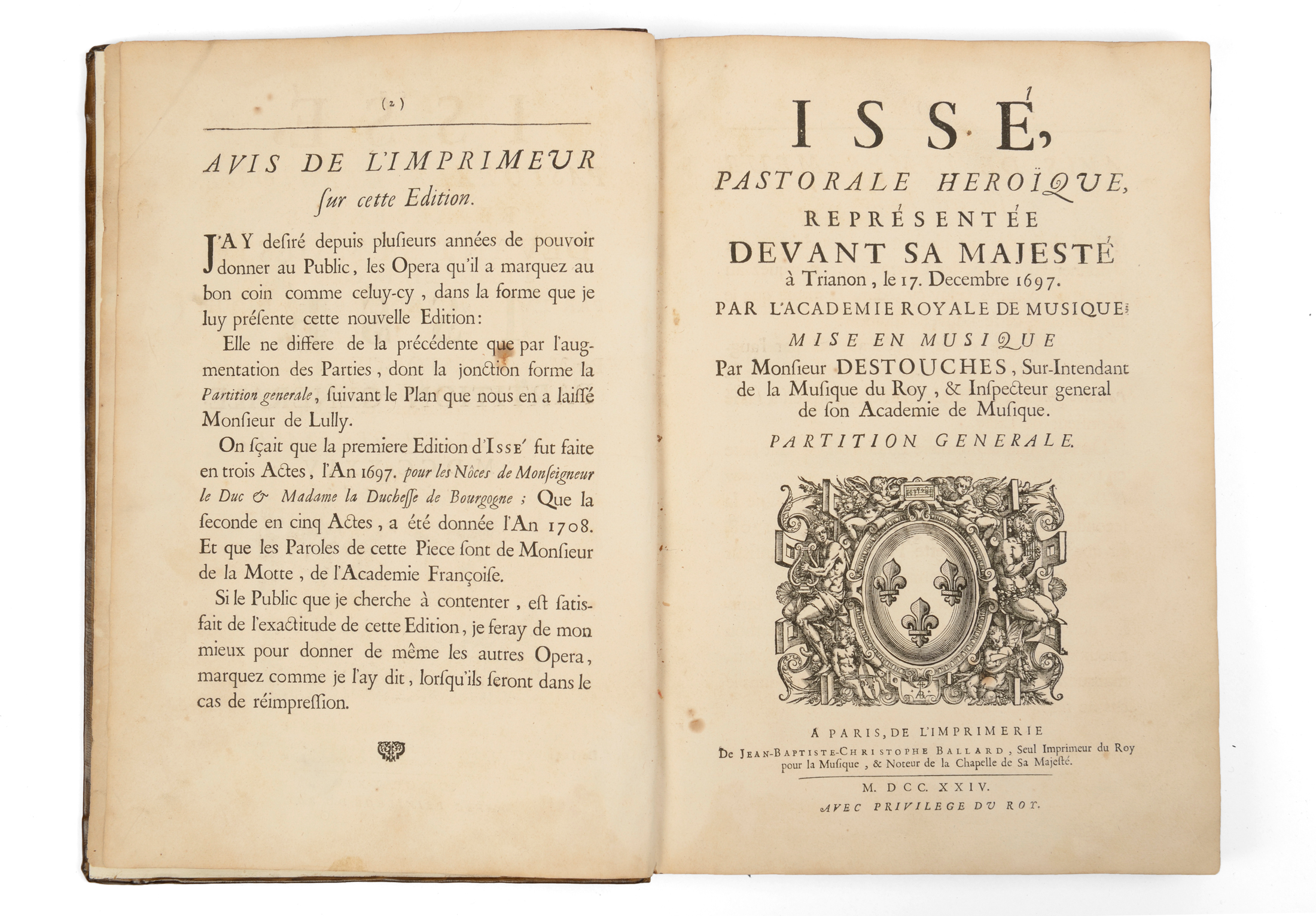 Très rare partition d'orchestre complète faisant suite à la première édition en "petite partition" l'année de la création (1697) et à la 2ème édition conforme à celle de 1724 "sauf par augmentation des Parties, dont la jonction forme la Partition générale suivant le Plan que nous en a laissé Monsieur de Lully" ("Avis de l'imprimeur" relié en début de volume), ce qui n'est pas rien. Très bel exemplaire à bonnes marges, très propre intérieurement, dans une reliure pastiche très réussie.