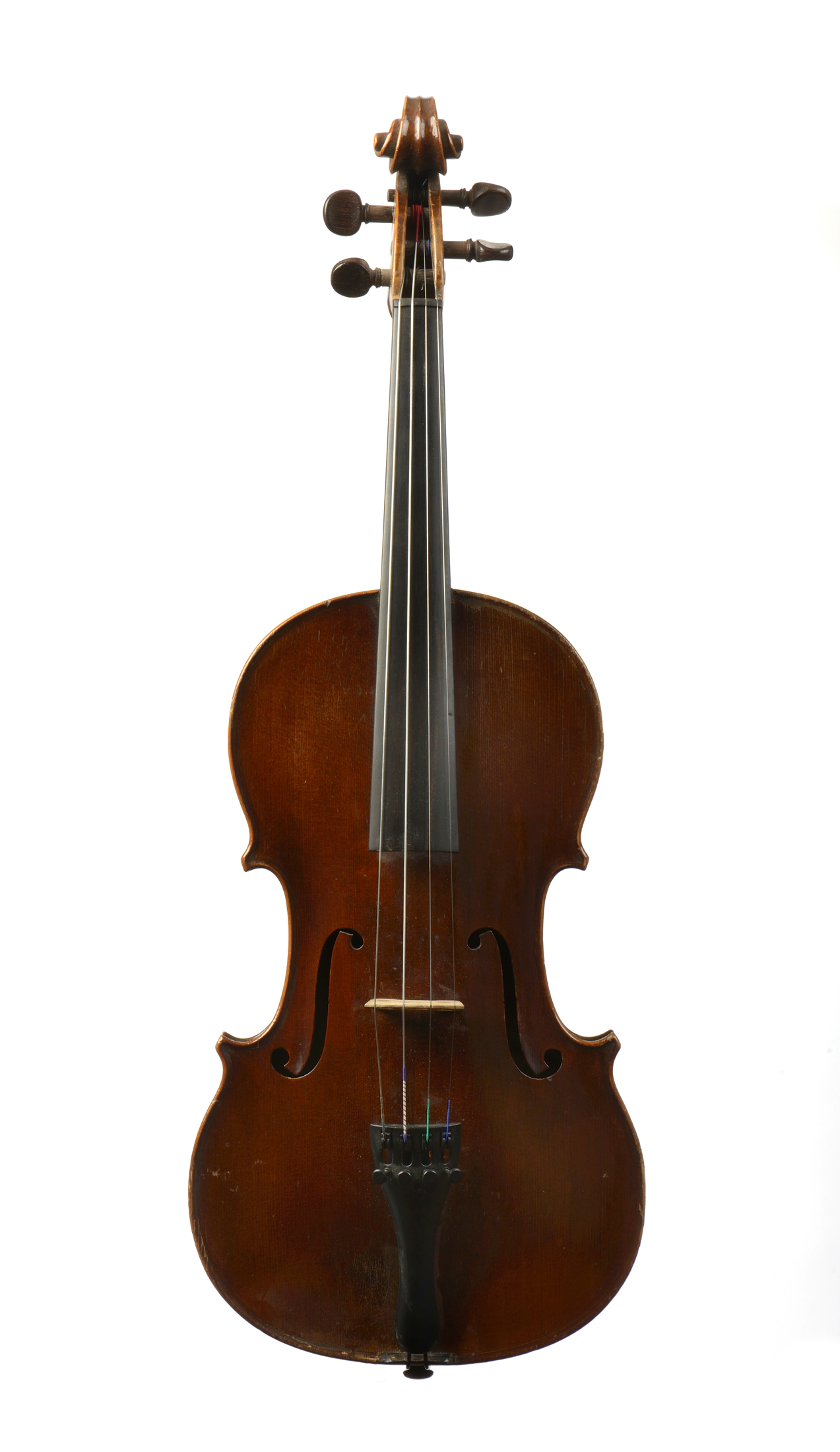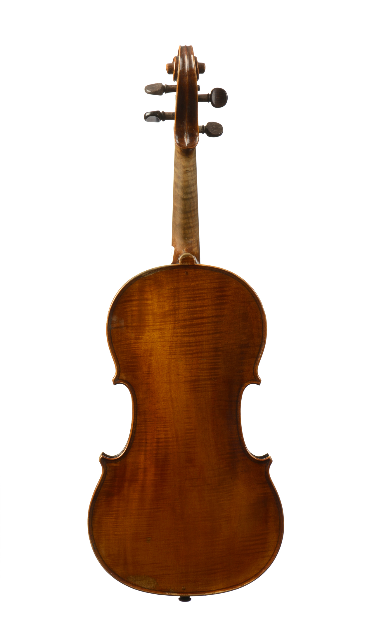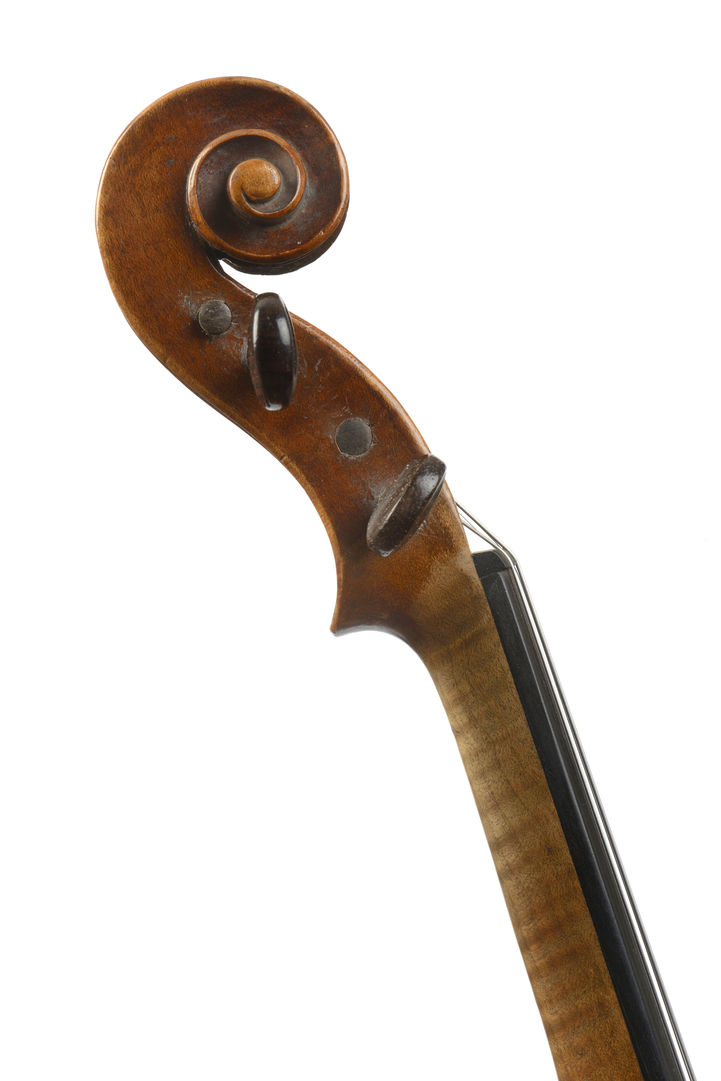 dont il porte la marque au fer "A la ville de Cremone, Nicolas Morlot." Fond d'une pièce en érable Vosgiens aux fines ondes. Table en épicéa aux pores serrés au centre s'élargissant sur les bords. 364mm. Vernis brun sur fond doré. En parfait état de conservation. Avec boite et deux archets.
