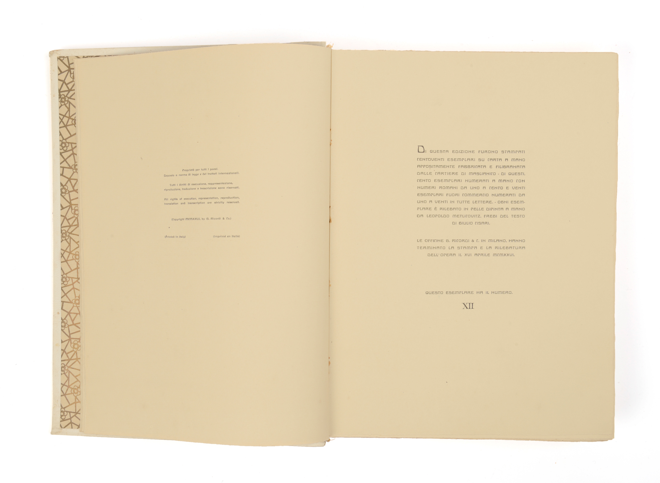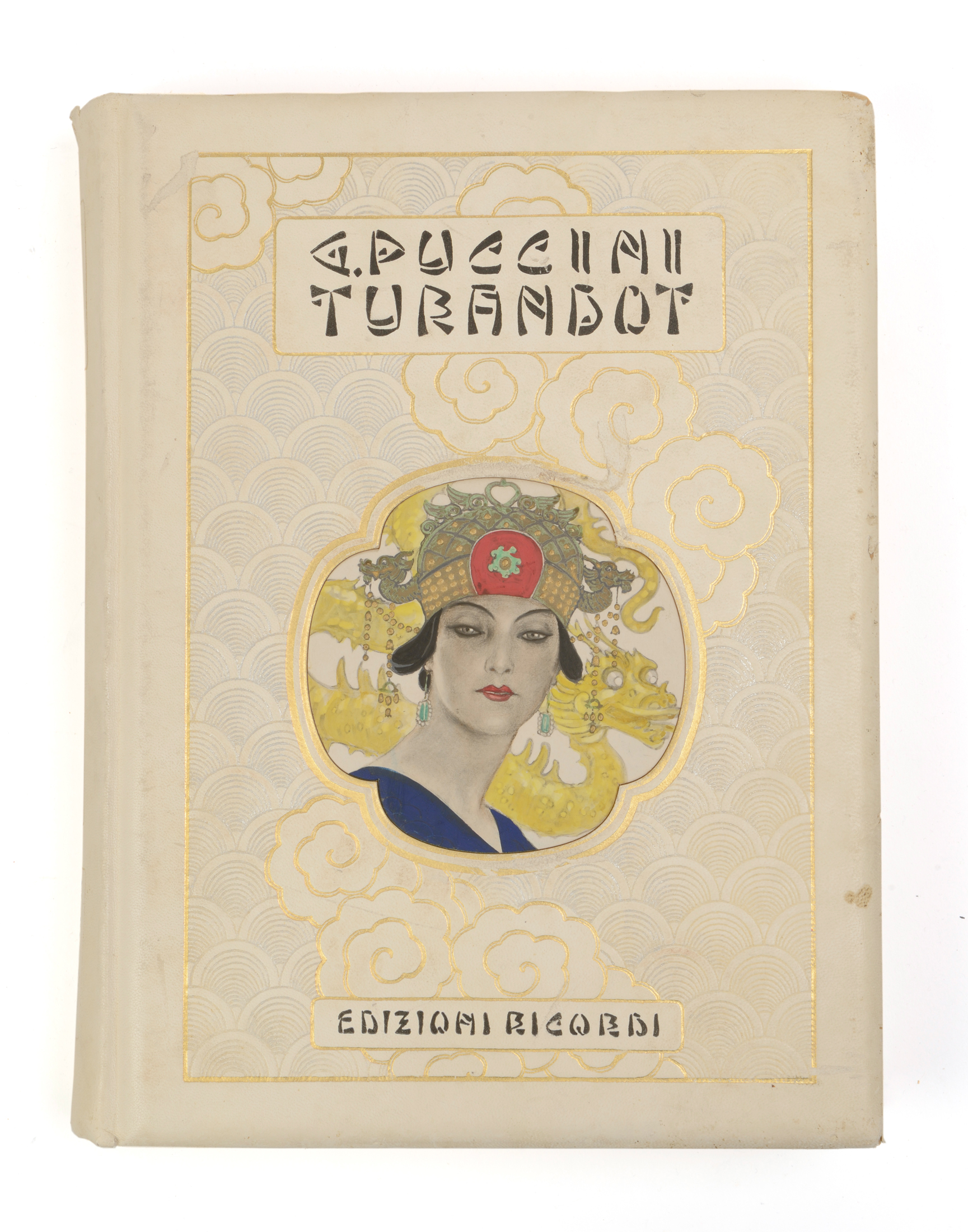 Edition originale de l’ultime opéra de Puccini, en réduction piano et chant par Zuccoli. Un des 120 exemplaires de grand luxe numéroté à la main sur vergé teinté, avec le sublime portrait de la Princesse Turandot peinte par Leopold Metlicovitz en premier plat de la reliure. Une réalisation hors norme pour un opéra de la démesure. Hopkinson 12 A (a). Coiffes lég. déf.