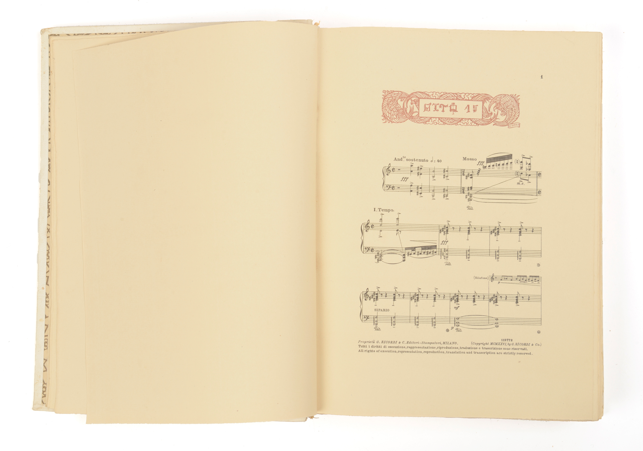 Milano, G. Ricordi, 16 avril 1926, in folio, pleine reliure décorée de l’éditeur, calf crème aux décors japonisants en reliefs, filets dorés, avec incrustation au premier plat d’une composition originale peinte sur carton fort, gardes japonisantes, 398 pp. non rognées.