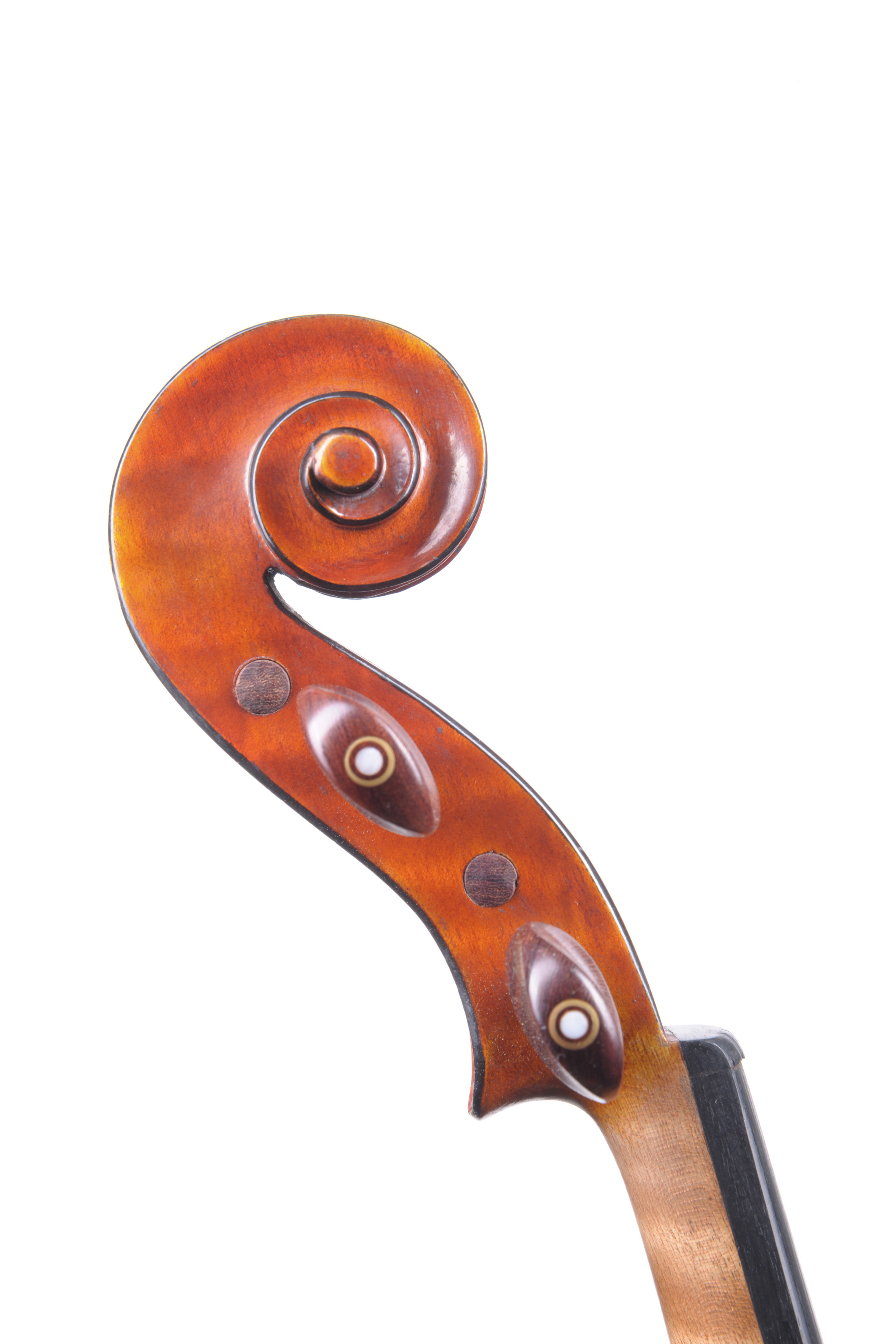 portant une étiquette "Fait dans l'atelier de Georges Coné, 1947" Fond de deux pièces en bel érable aux ondes régulières descendantes. Vernis orangé sur fond doré. 354 mm.