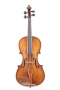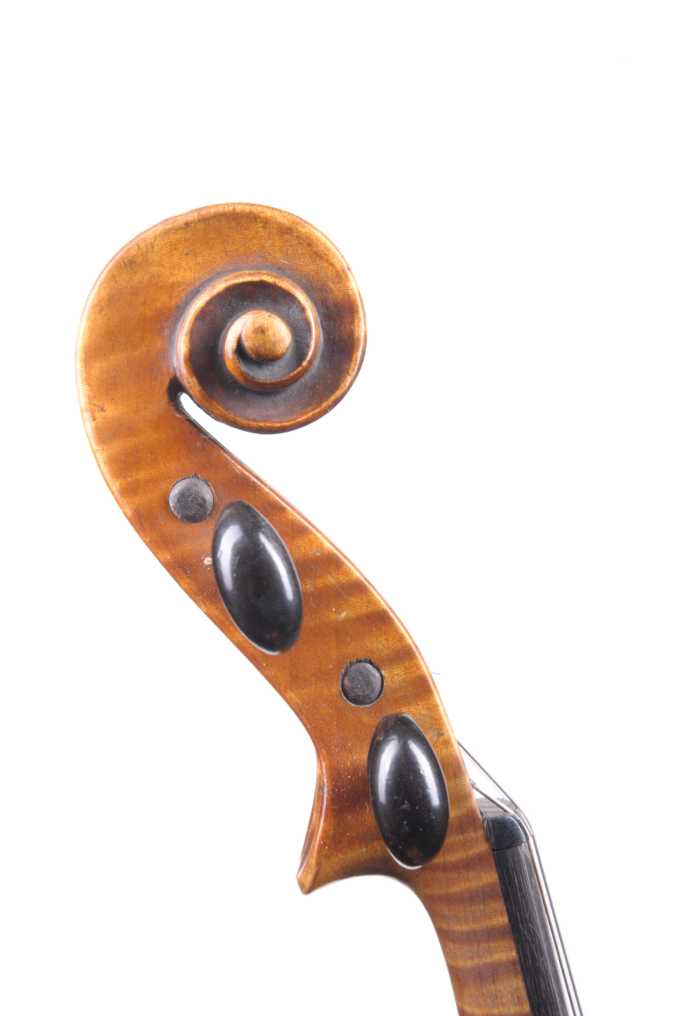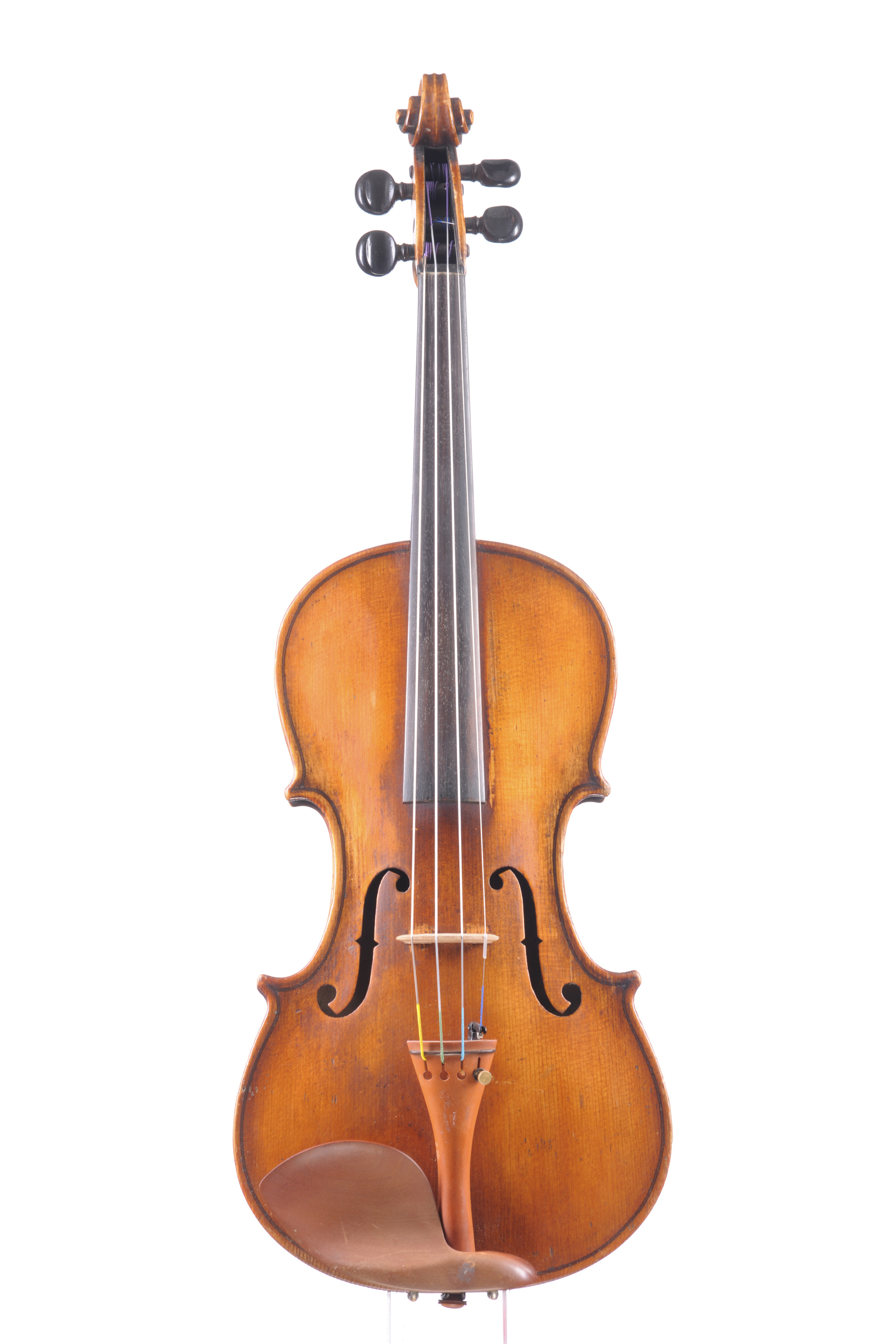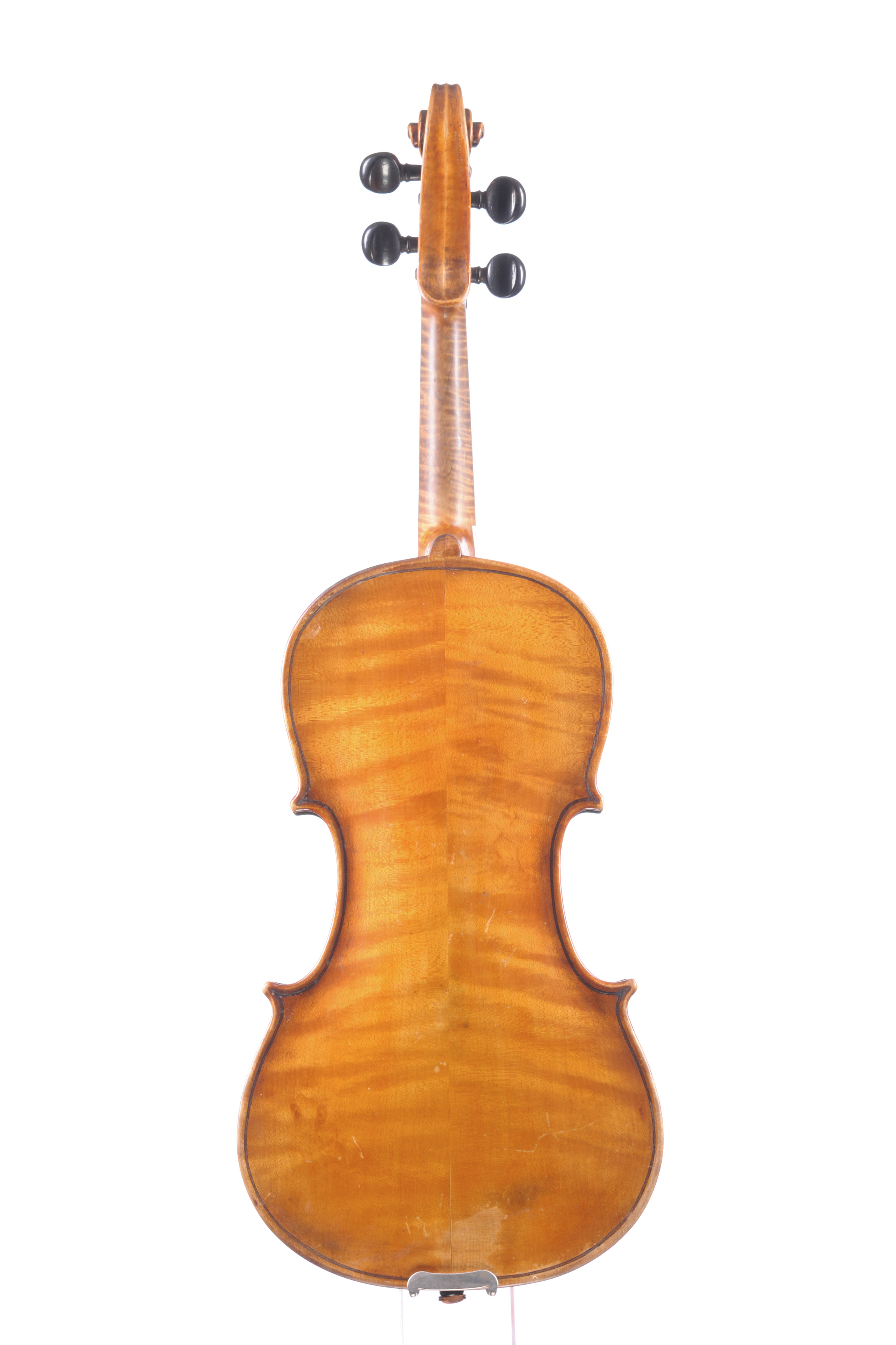 Fond de deux pièces en bel érable flammé aux ondes larges. Eclisse et tête du même bois. Table en épicéa aux pores larges et réguliers. Fait vers 1900. Vernis brun doré. Bon état de restauration. 359 mm. Prêt à jouer.