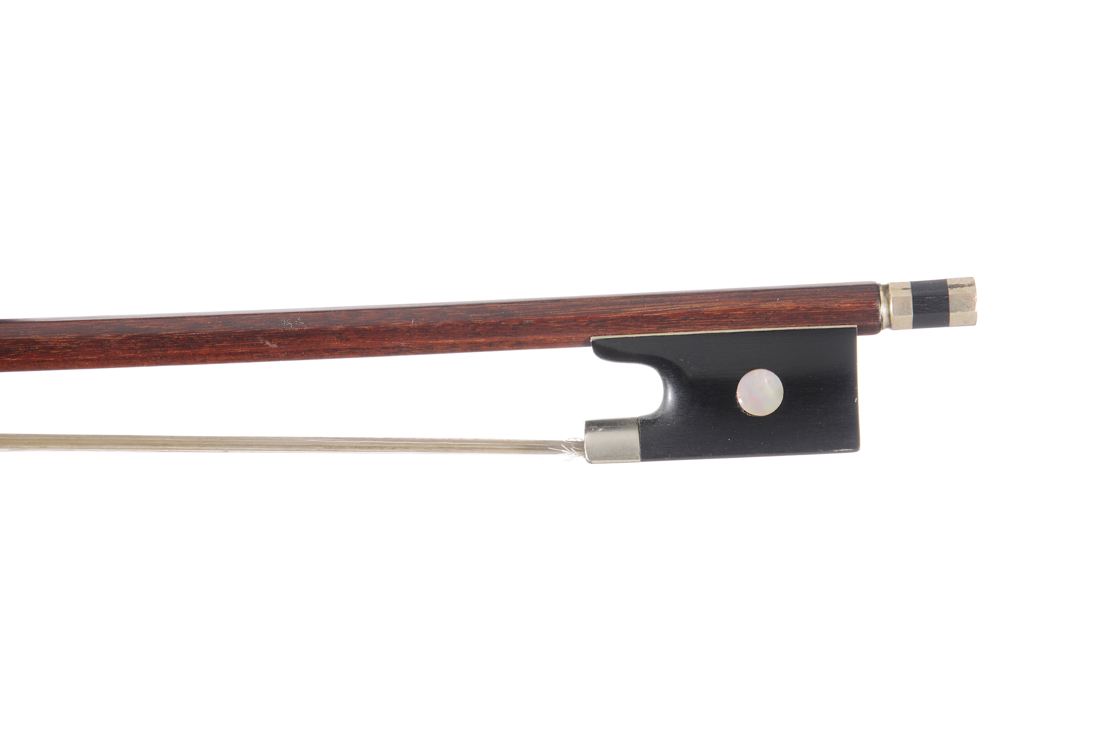 Archet de violon Allemand. Baguette en pernambouc. Hausse ébène avec grain, montée maillechort. 726 mm. Sans garniture.