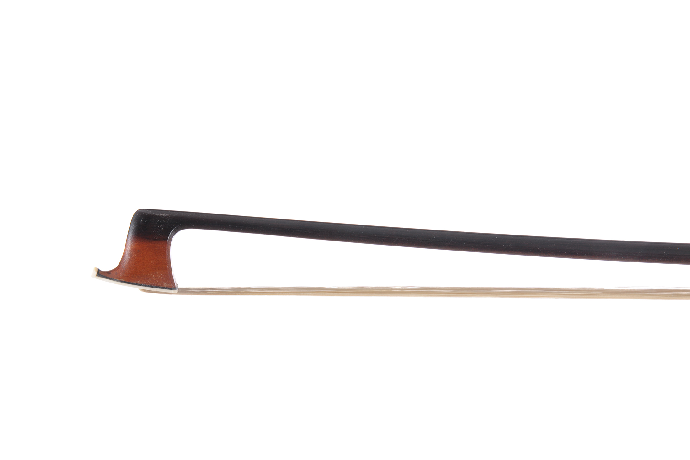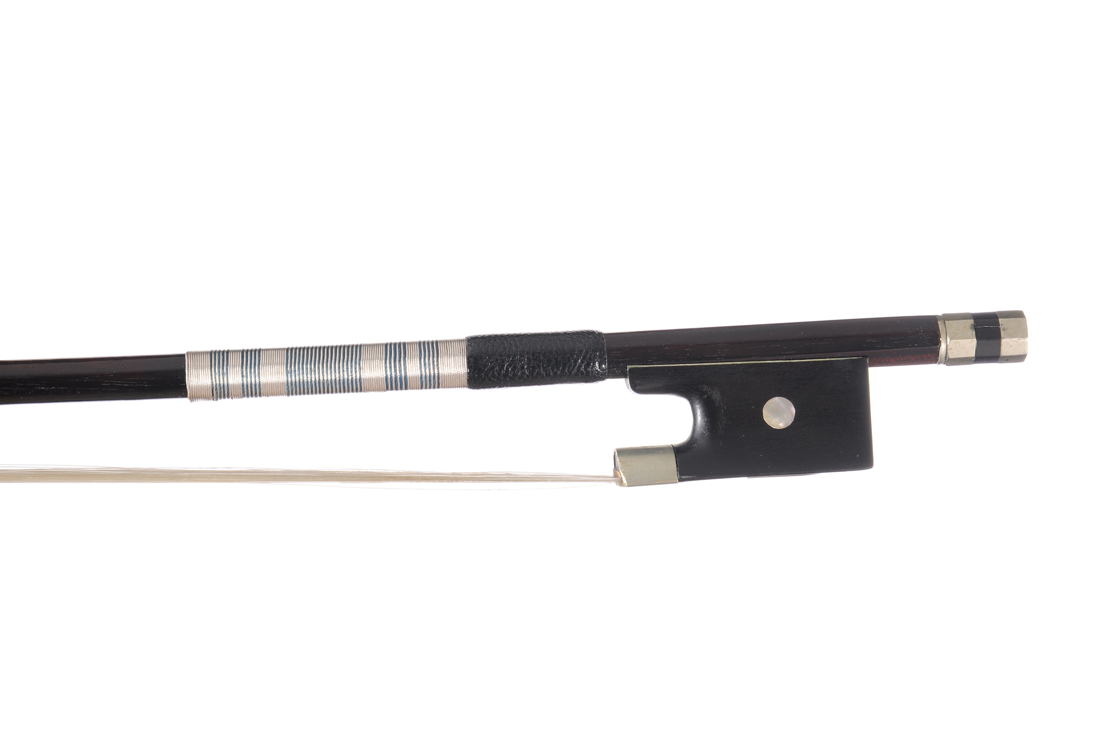 Archet de violon XIXe. Baguette en bois des iles. Hausse ébène montée maillechort. 723 mm.