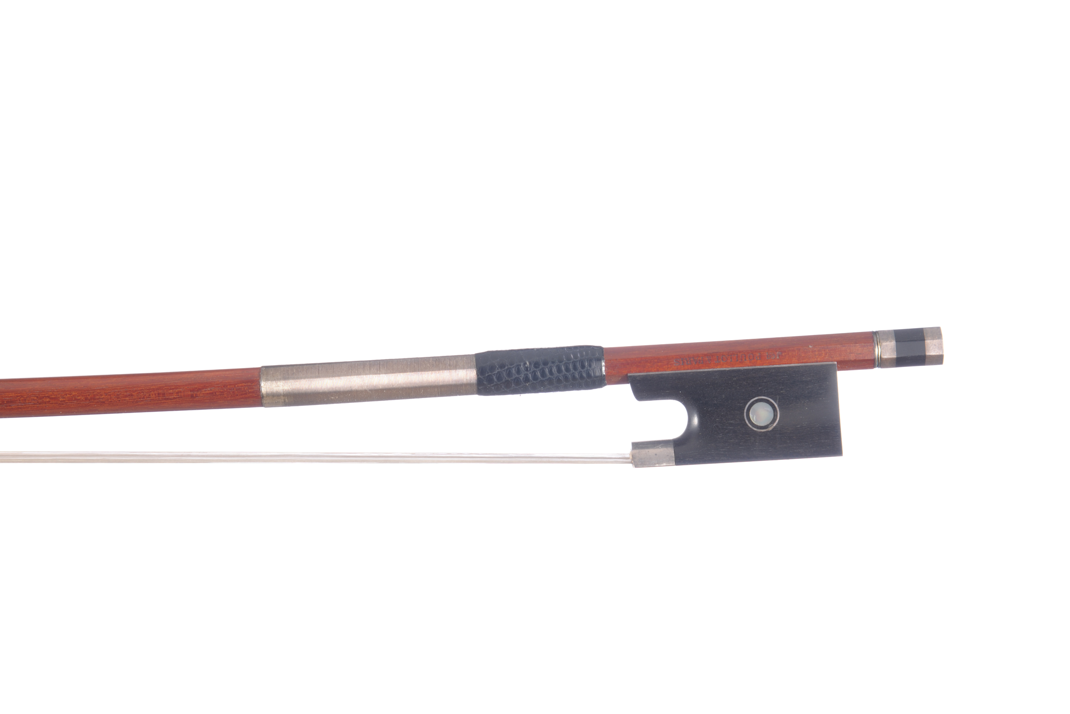 Archet de violon de Jacques Poullot à Paris. Baguette en pernambouc. Hausse ébène, montée argent avec grain cerclé. 725 mm. 61g.
