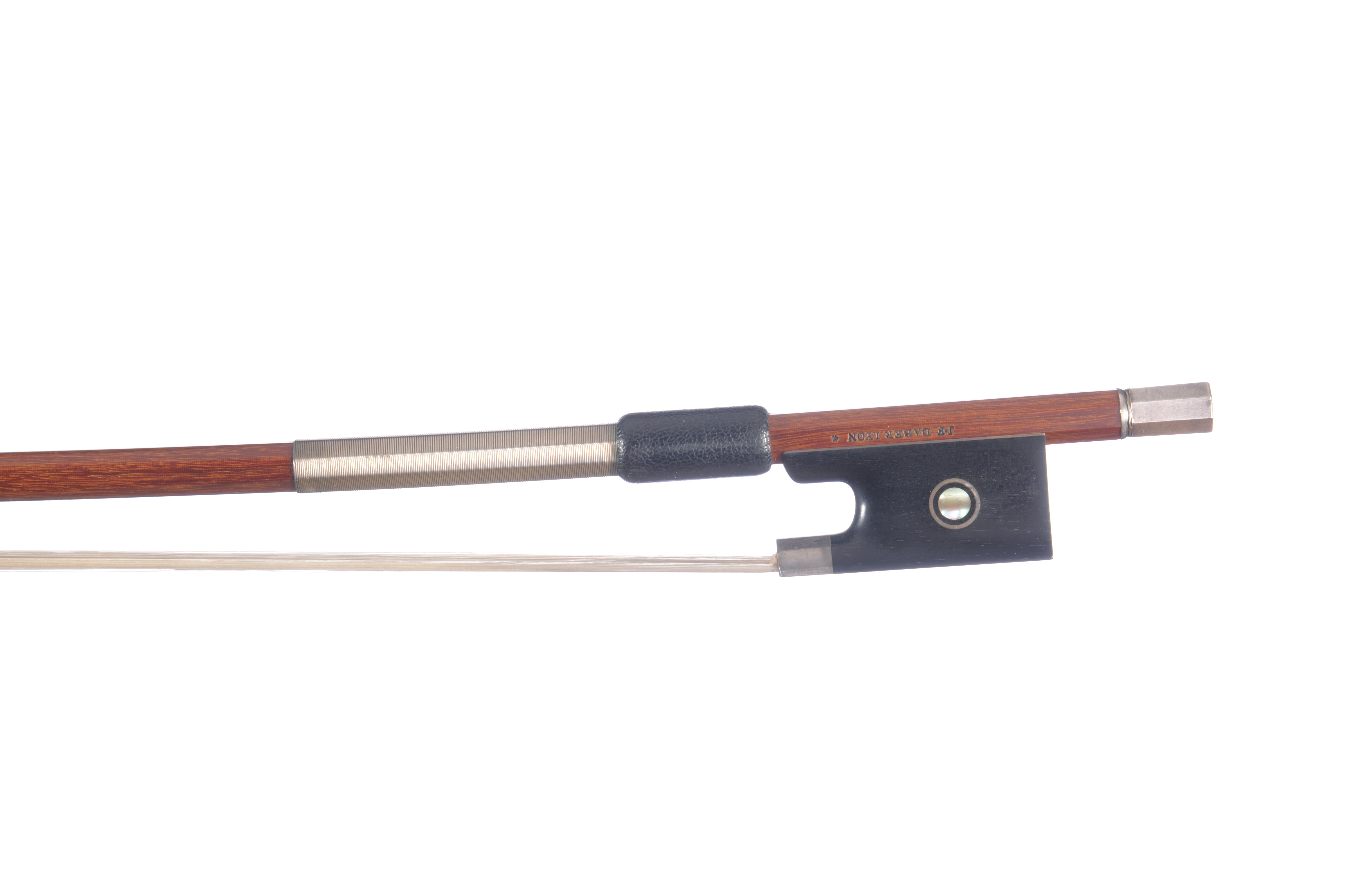 Archet d'alto, J.F DABER. Baguette ronde en beau bois de pernambouc. Hausse ébène montée argent. Grain cerclé, bouton en argent plein. 724 mm. 70 g