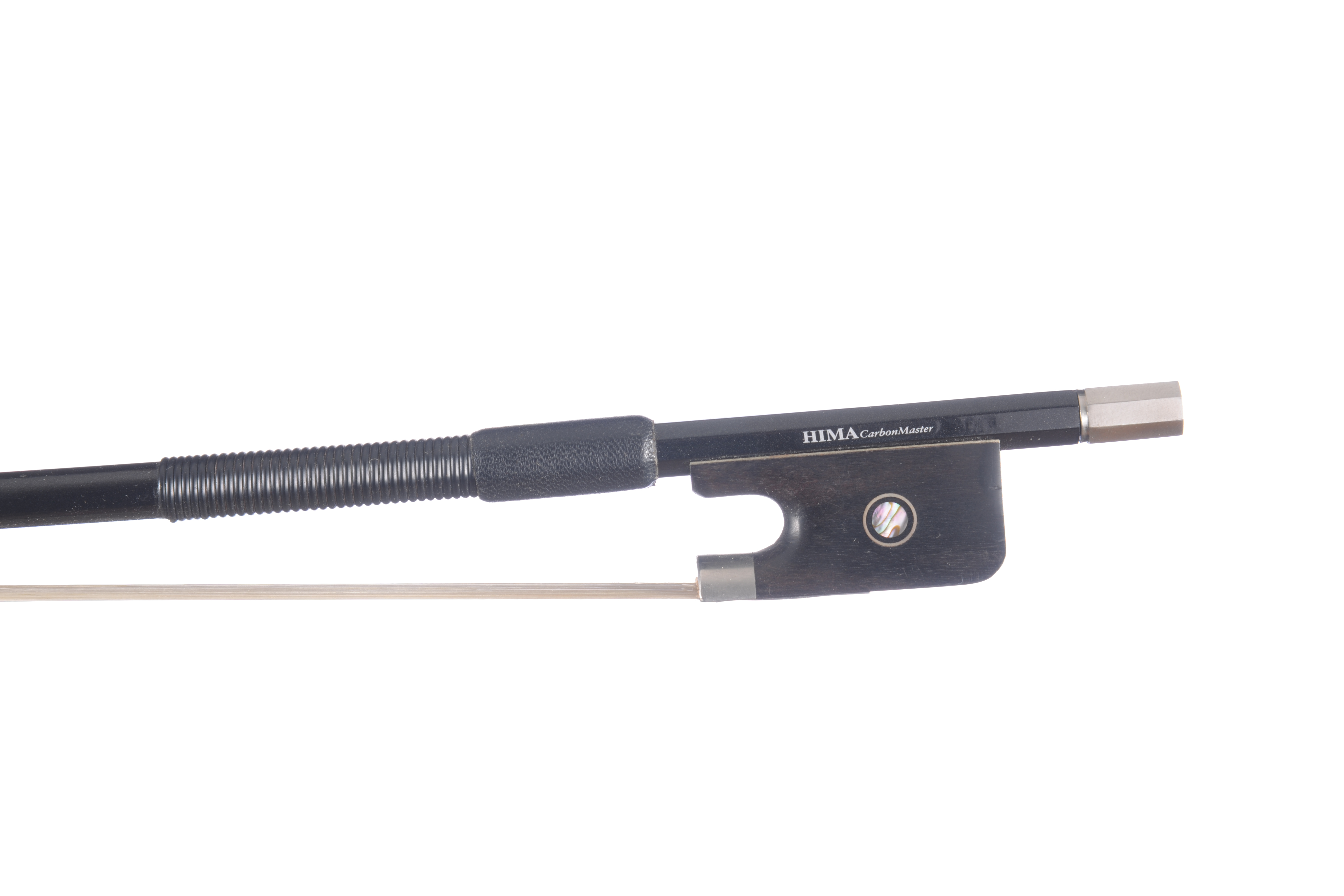 Archet de violoncelle, HIMA "Carbone master". Baguette en carbone. 701 mm. Hausse ébène à talon rond, grain cerclé, montée maillechort. Bouton en maillechort plein. 78,5 g.