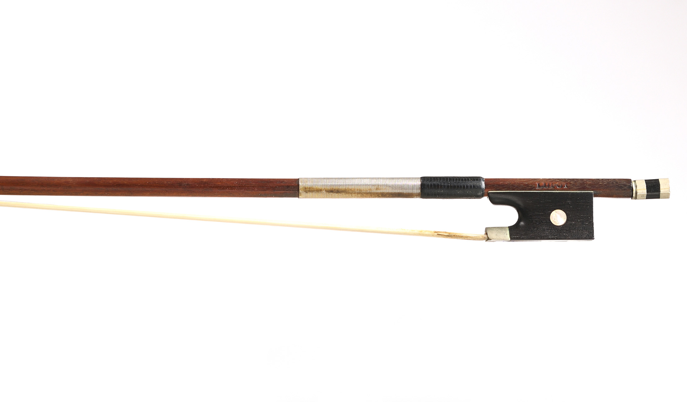portant une marque au fer "LUPOT". Belle baguette ronde en bois de pernambouc. Hausse ébène montée maillechort. 732 mm. 60, 5 g avec mèche et garniture.