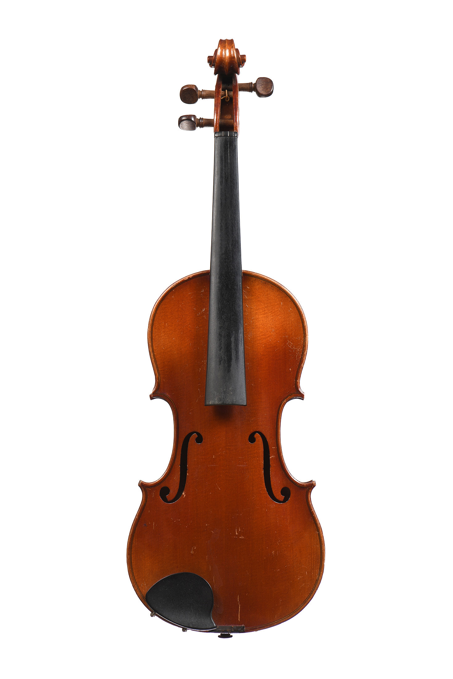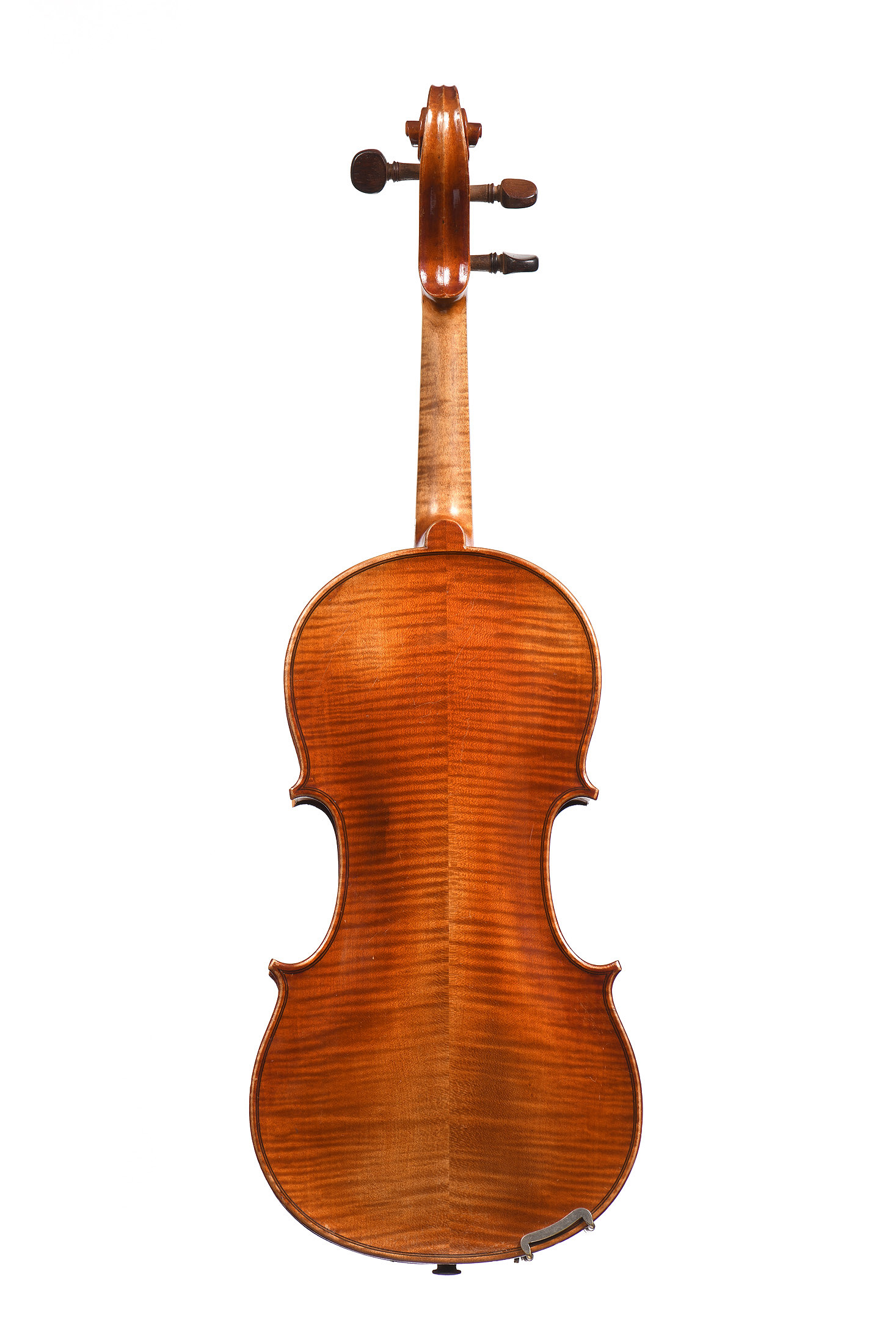 portant une étiquette "Modèle d'après Jacobus Stainer...165". Fond de deux pièces en érable. Eclisses et tête du même bois. Vernis brun orangé sur fond doré. Usures dont un coin abîmé. 358 mm.