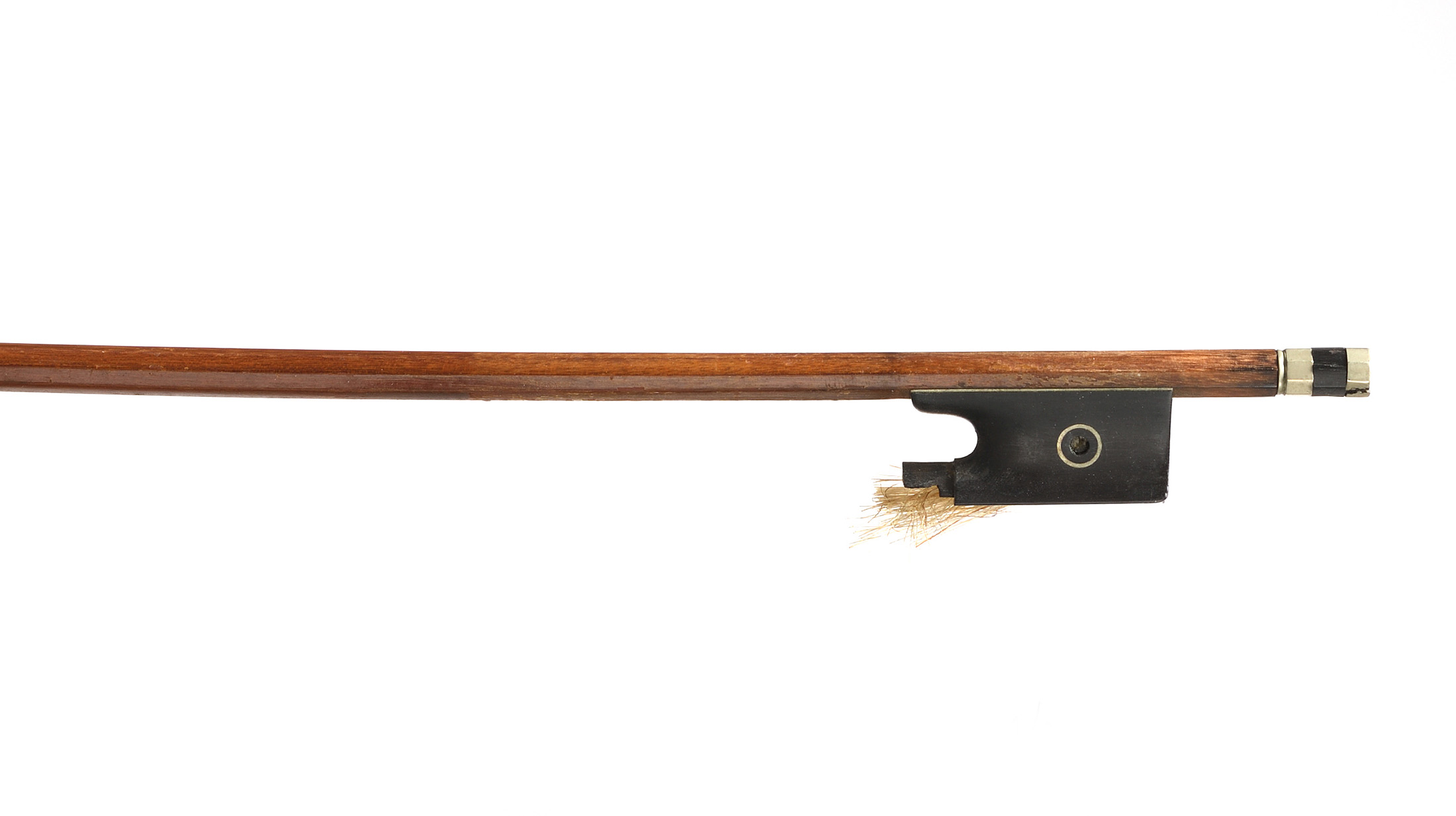 - Un archet d'étude en pernambouc. Hausse ébène montée maillechort. Grain Cerclé. 732 mm.