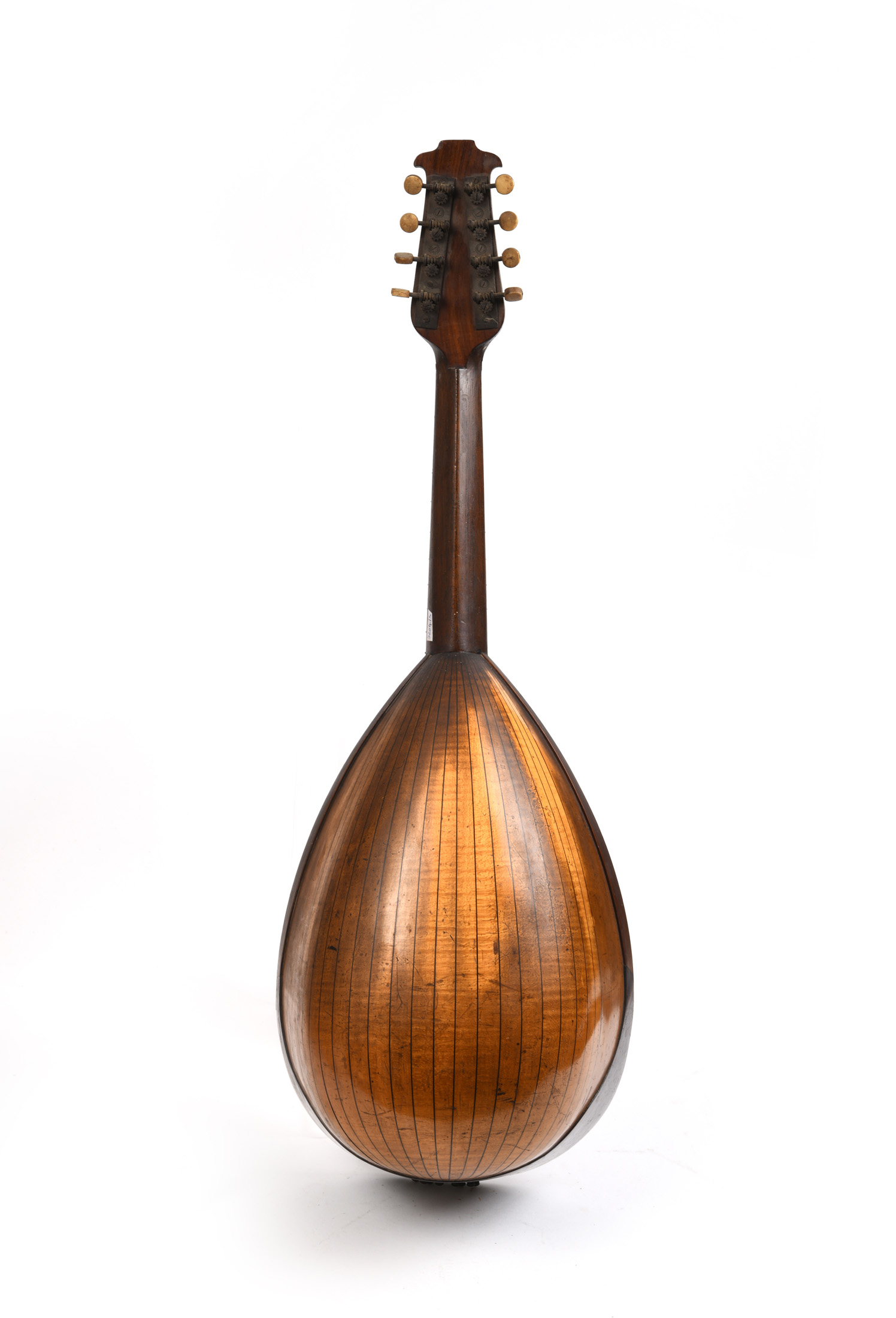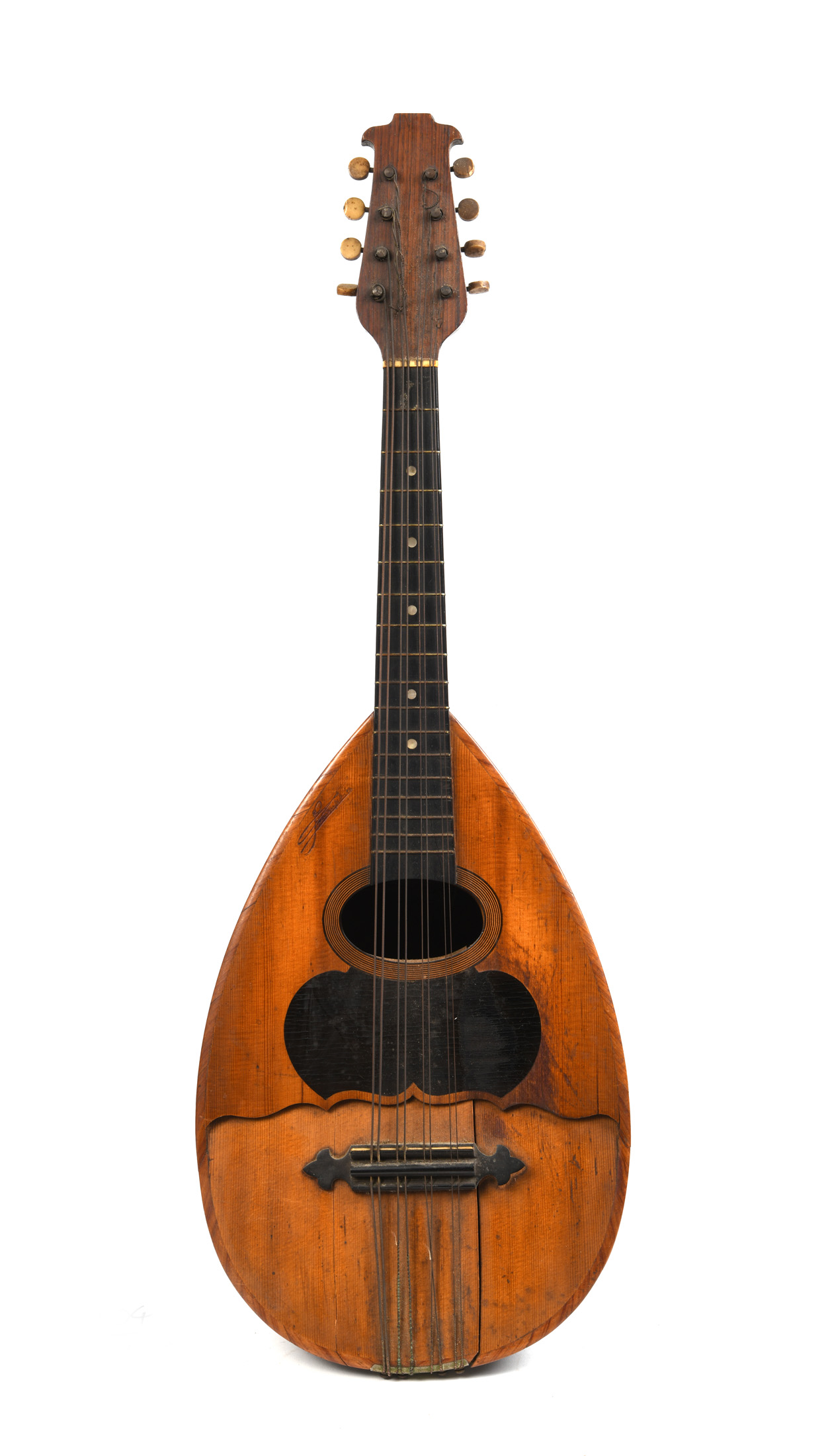 fait par GELAS, dont elle porte l'étiquette "MANDOLE GELAS. Breveté SGDG. En France et à L'étranger.E.G. N°/52 1911. Marque au fer et signature. Fond bombé à Dix-neuf cotes. Importantes cassures et décollages, l'ensemble est à restaurer.