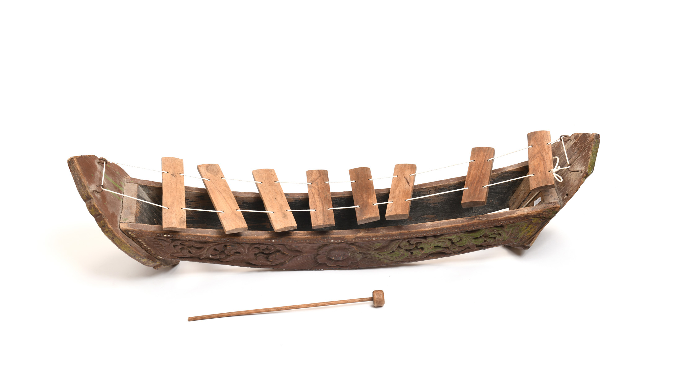 Xylophone en forme de barque. En bois peint sculpté de fleurs et éléments naturels. Manque le socle de l'instrument, ainsi que des lames en bois. L'ensemble est à restaurer.