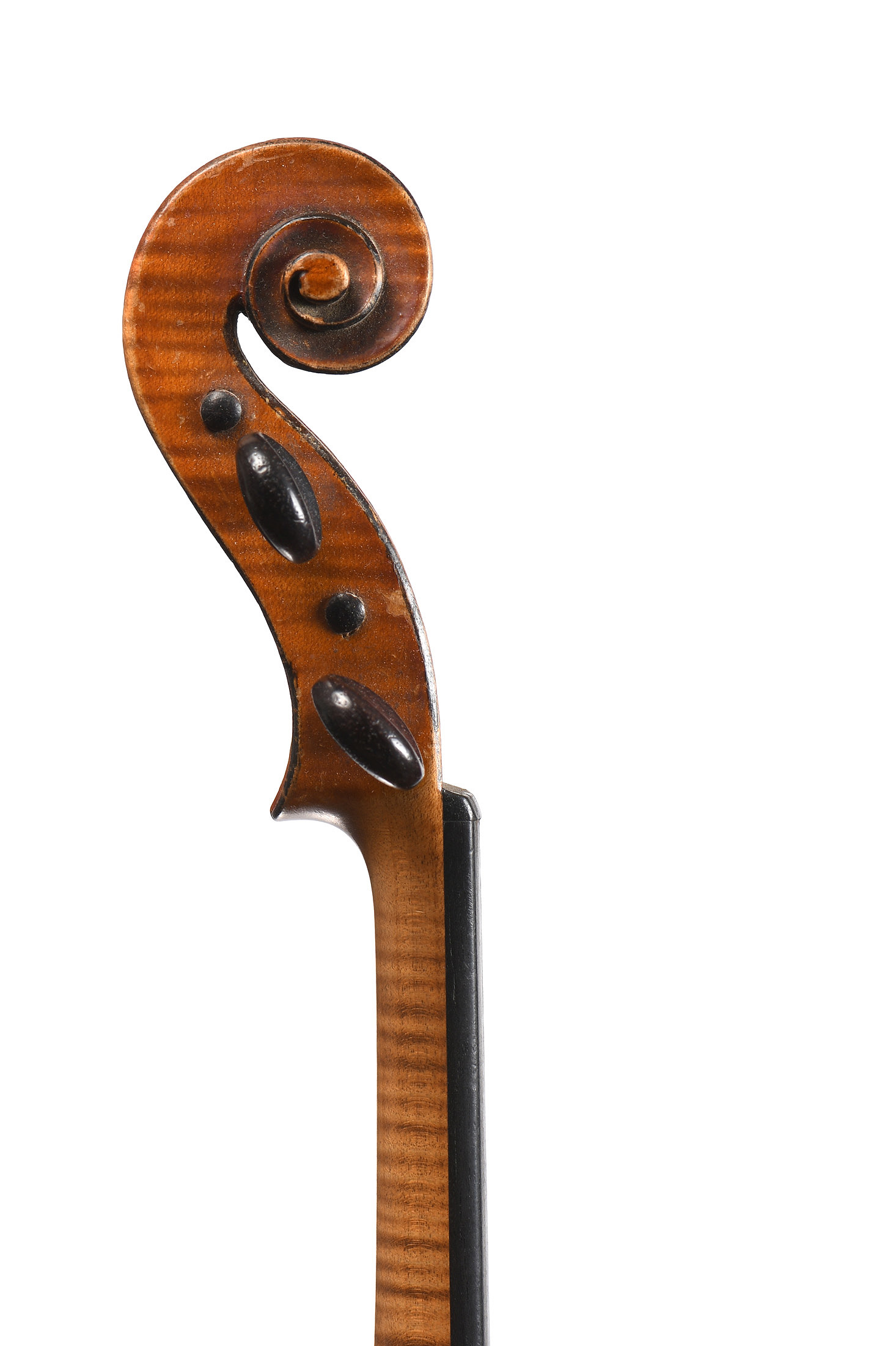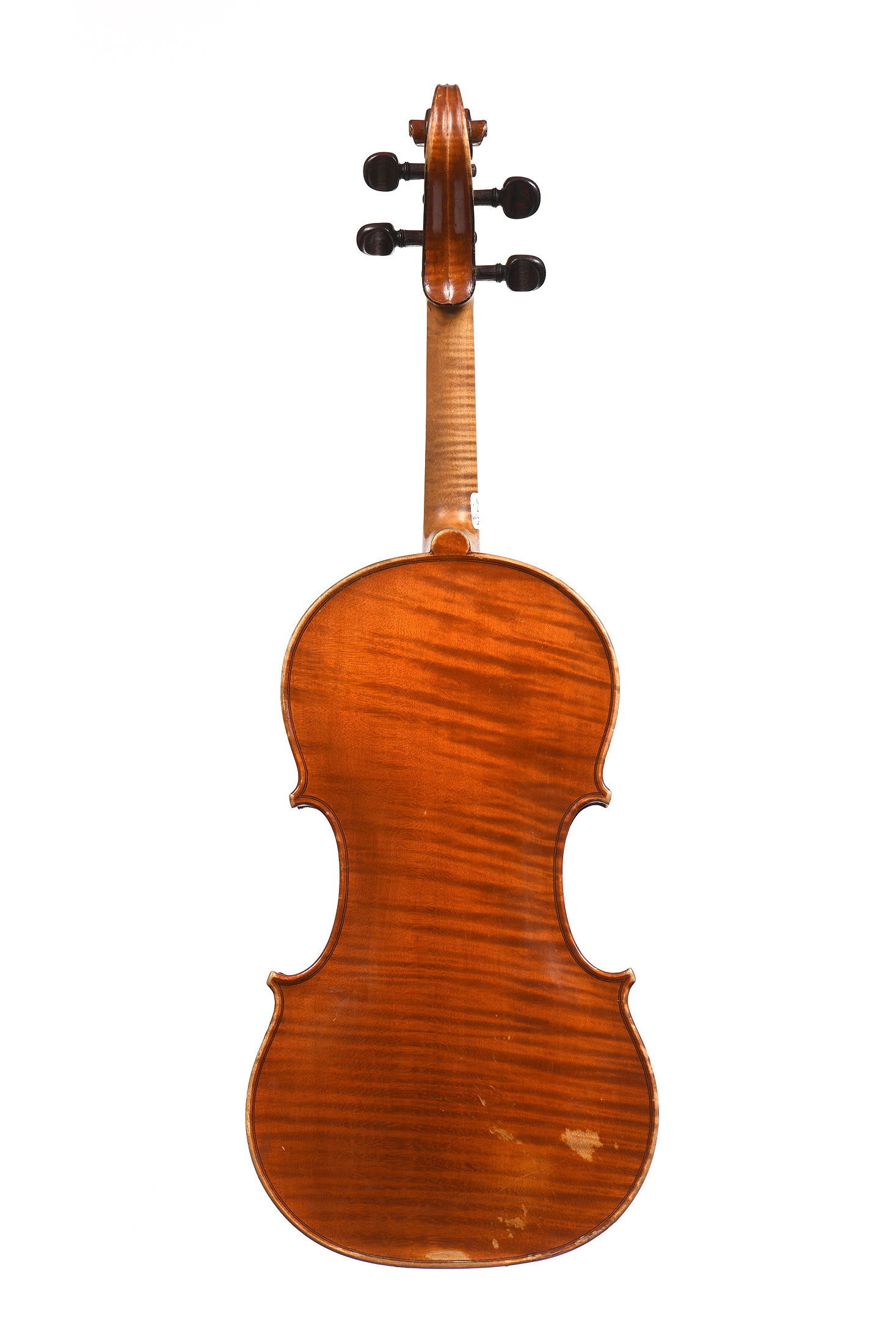 Beau fond d'une pièce en érable. Table en épicéa aux pores larges et irréguliers. Eclisses et tête du même bois. Vernis brun orangé sur fond doré. Bon état général.