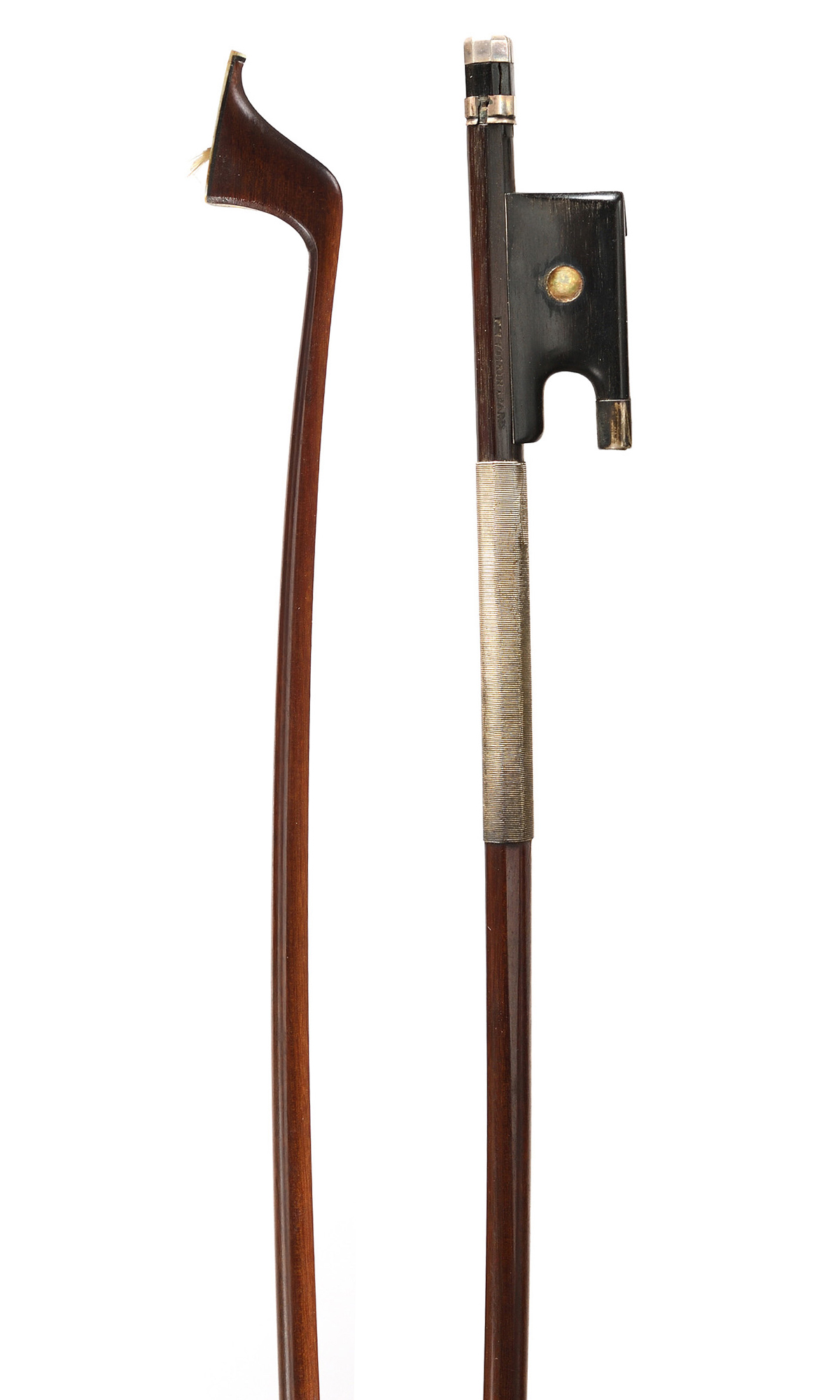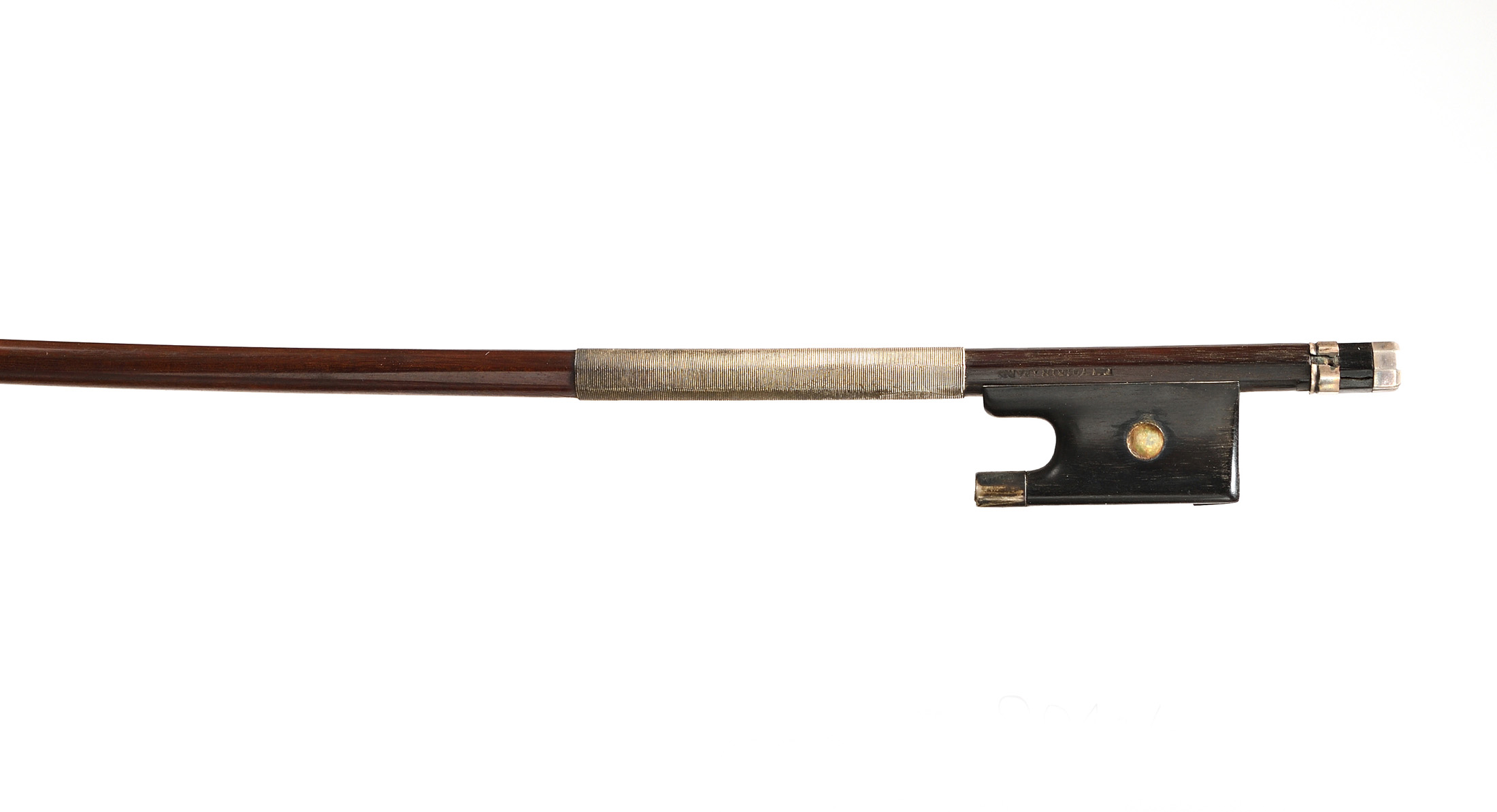 dont il porte la marque au fer "F.N. VOIRIN A PARIS". Baguette ronde en pernambouc. Hausse ébène, modèle Vuillaume, montée argent. Bouton à restaurer.