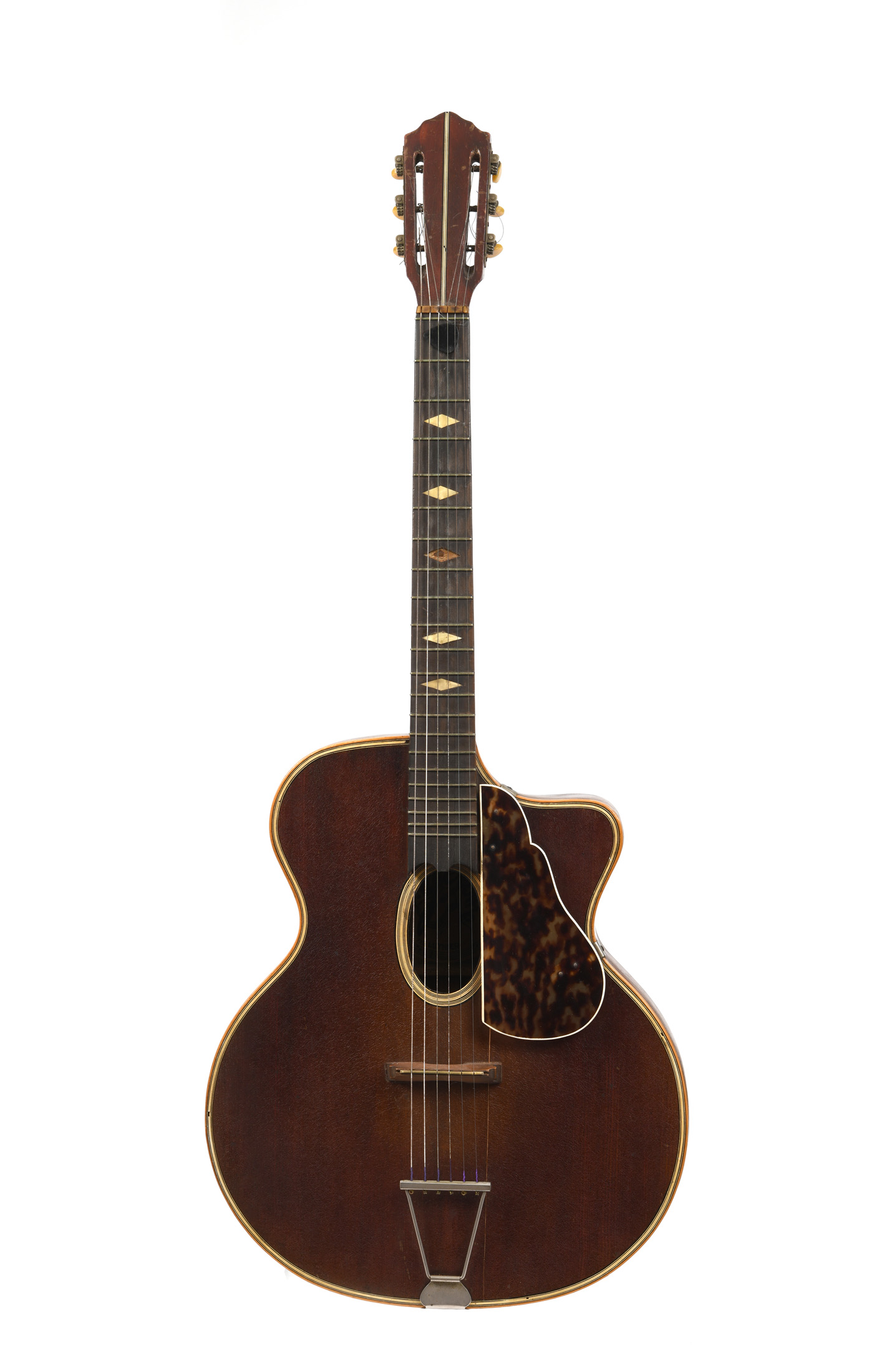 Portant une étiquette "Fabrique de guitare R. Gérome, 1951, Artisan R.M.738".