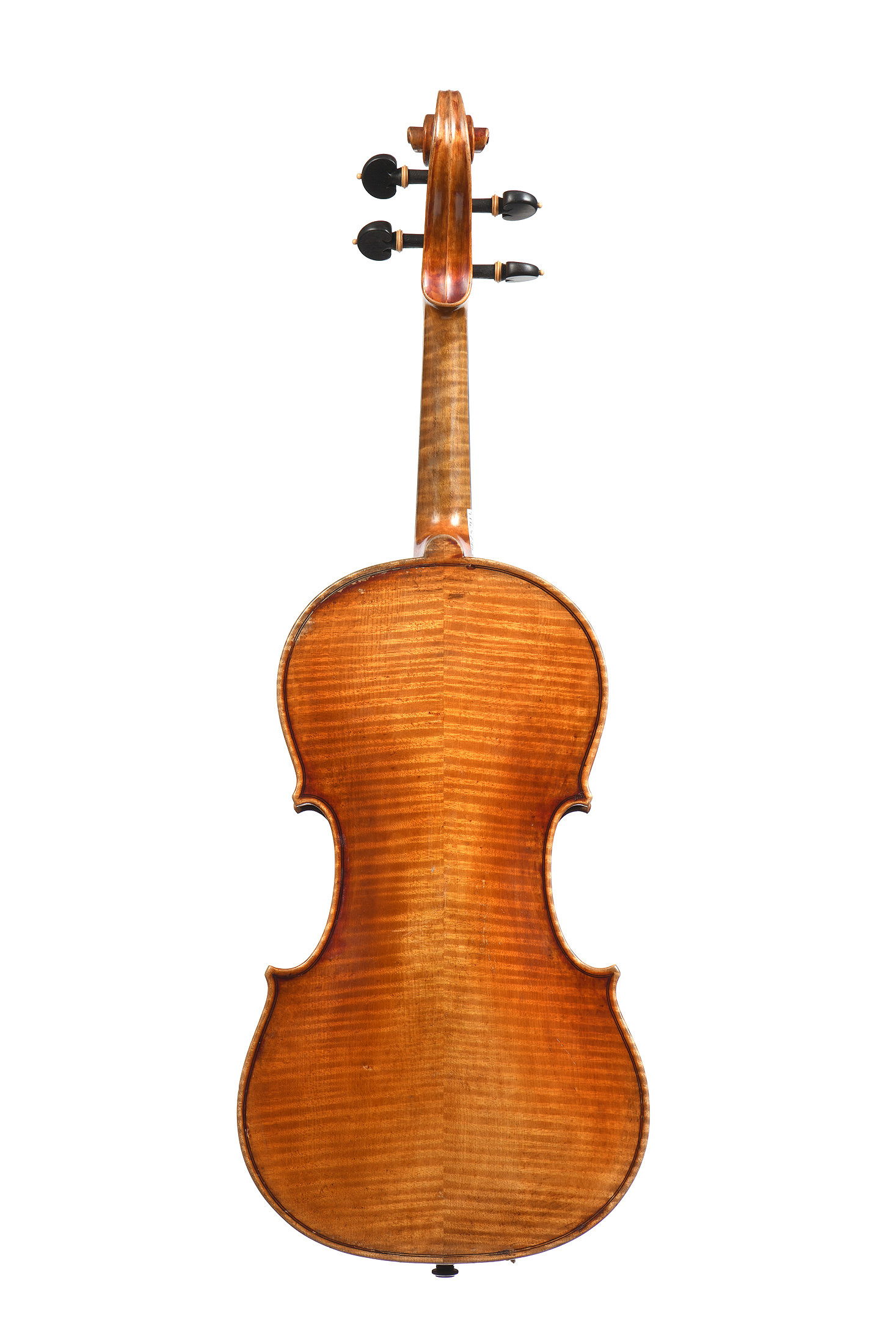 portant une étiquette apocryphe "n° 1181, Paul BAILLY, luthier... année 1902". Fond de deux pièces en érable. Eclisses et tête du même bois. Vernis brun orangé sur fond doré. Parfait état. 356 mm.