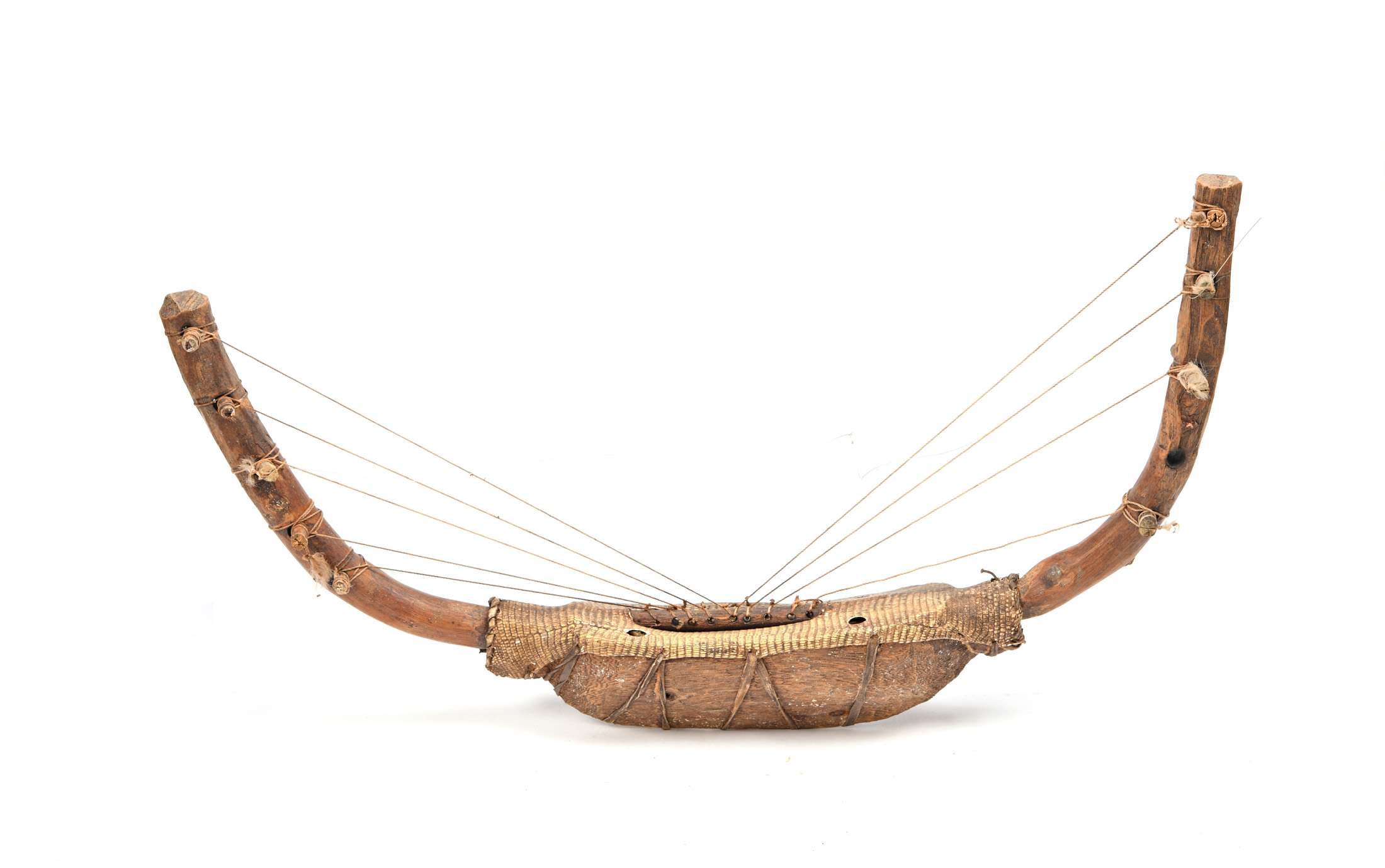 Intéressante petite Harpe, probablement de Tanzanie, à deux manches. Peau de reptile. L 40 cm. L'ensemble est à restaurer.