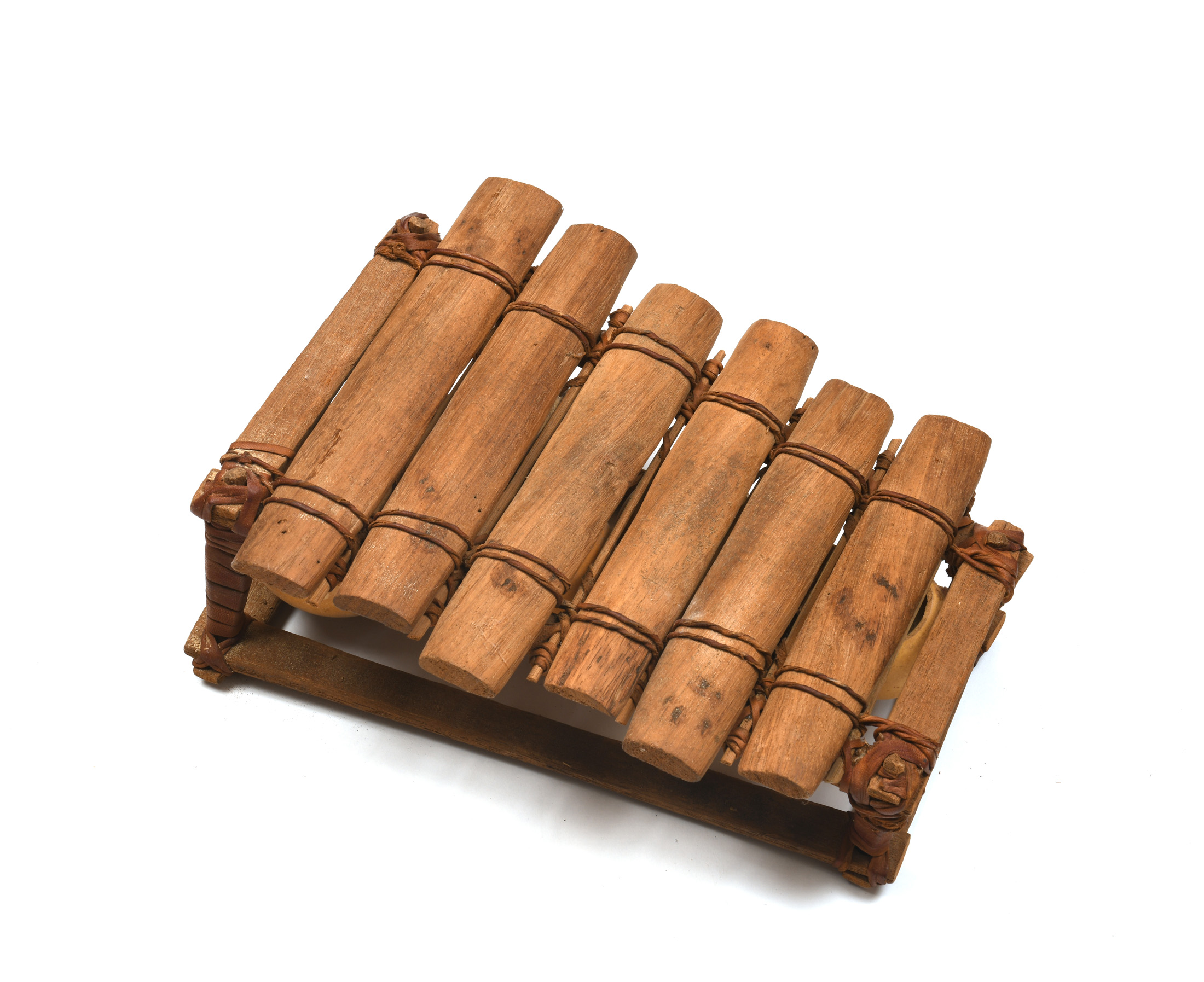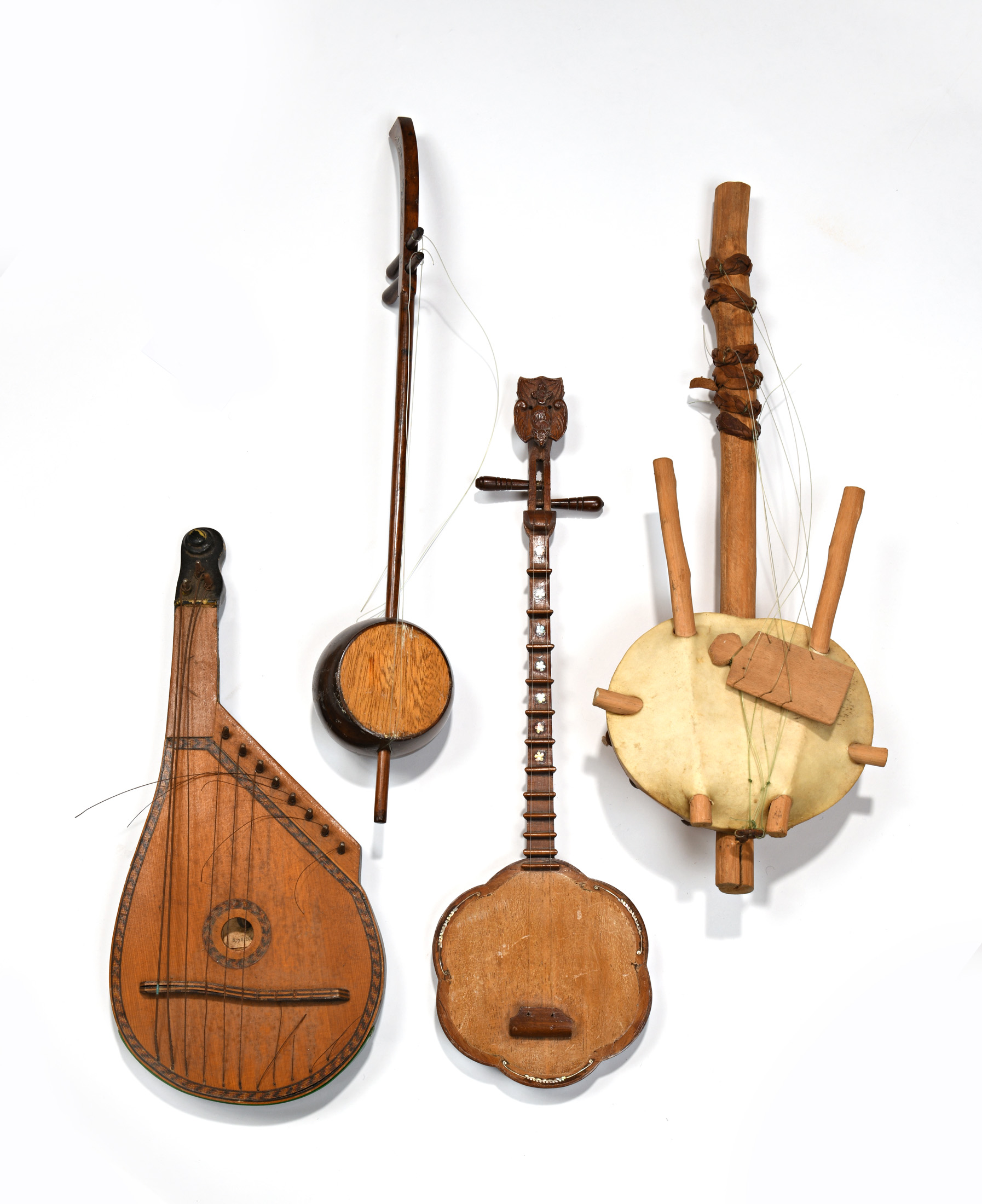 Cinq miniatures : une coré sénégalaise, une miniature de Erhu, une cithare miniature, résonateur à calebasse d'origine africaine, et autre.