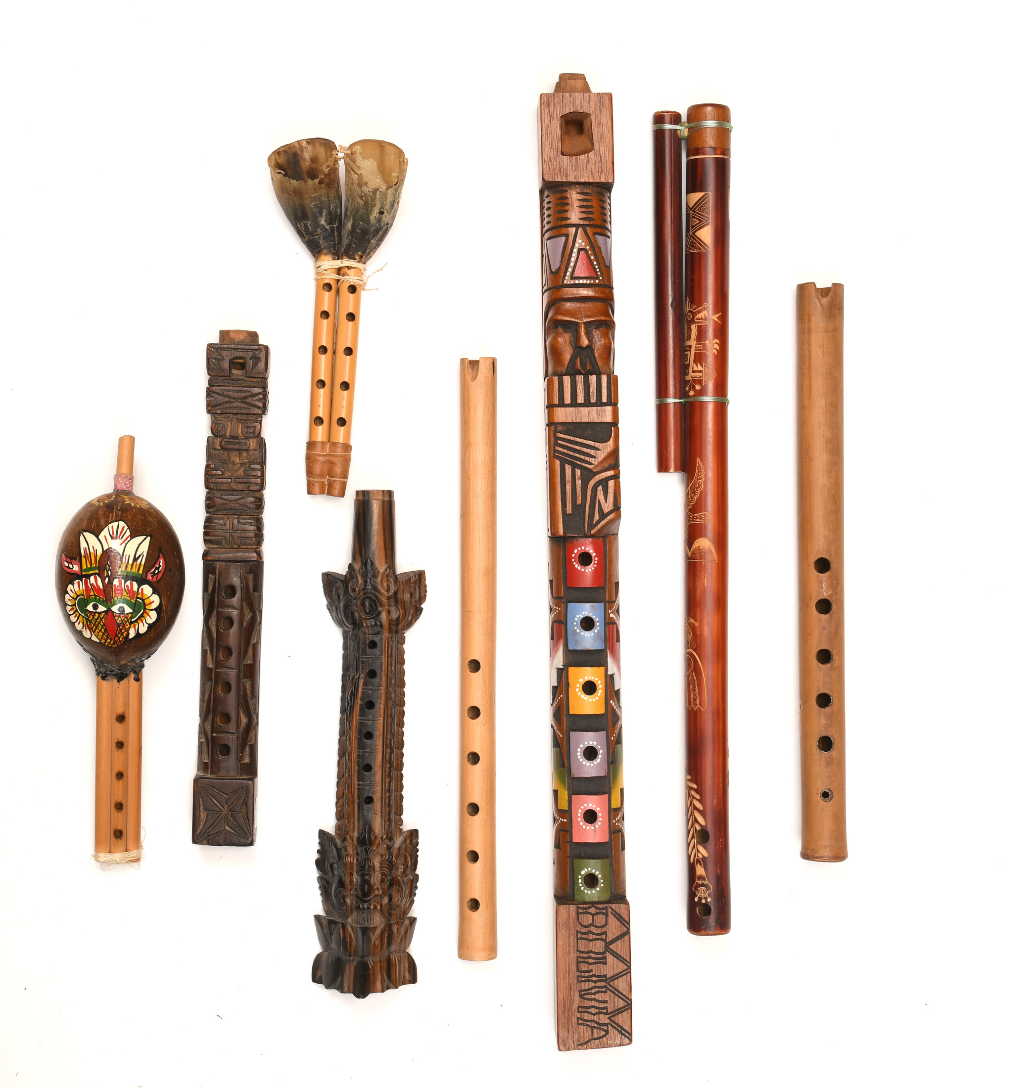 Lot de six flûtes dont deux Kéna, et trois Tarka. Deux flûtes double supplémentaires.
