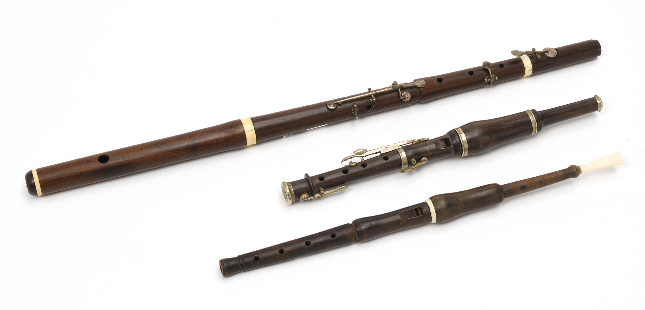 - une flûte traversière en palissandre, cerclée ivoire (manque des cerclages), à 5 clés.