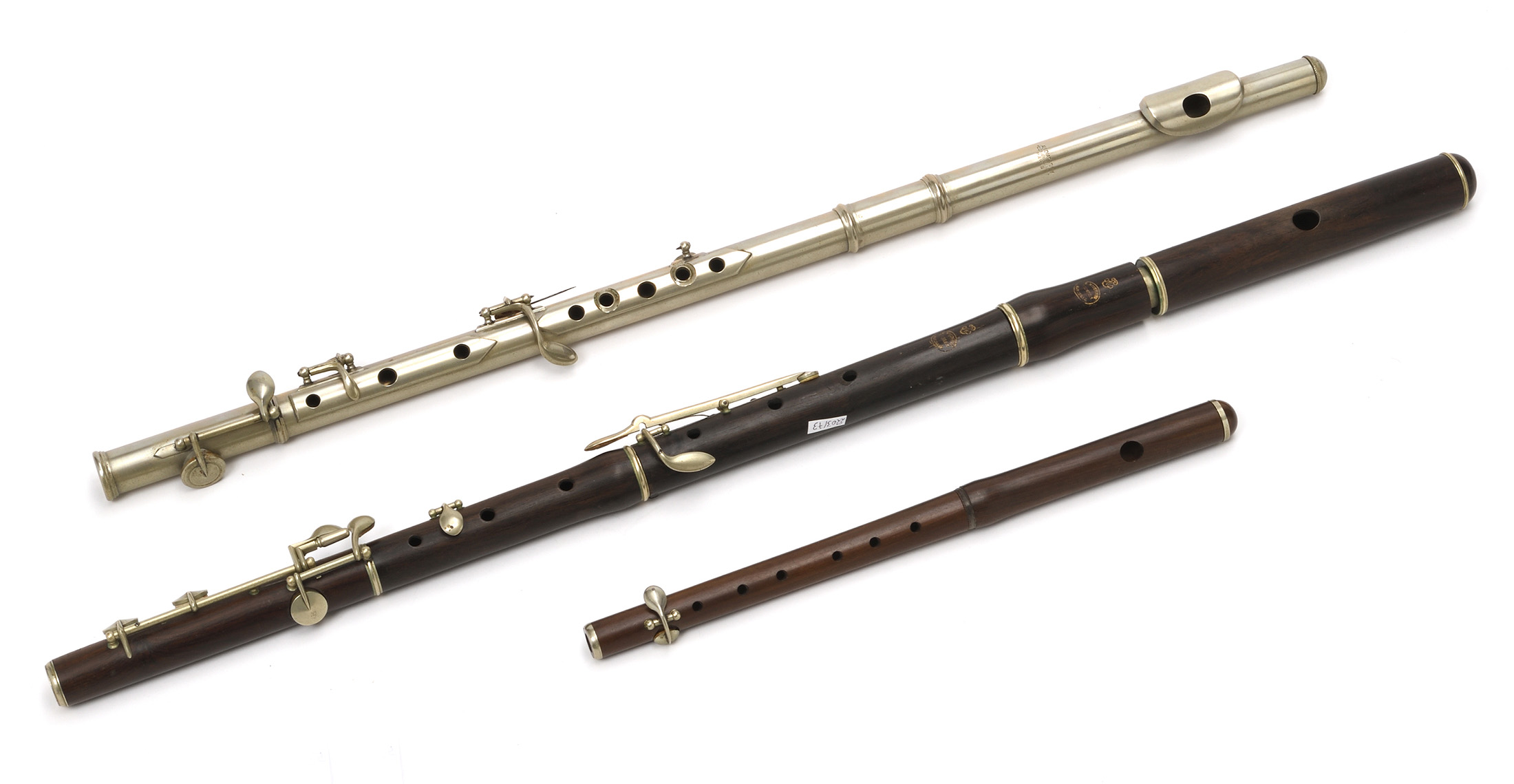 Avec une flûte piccolo anonyme en palissandre, cerclée (manque un cercle), à 1 clé en maillechort.