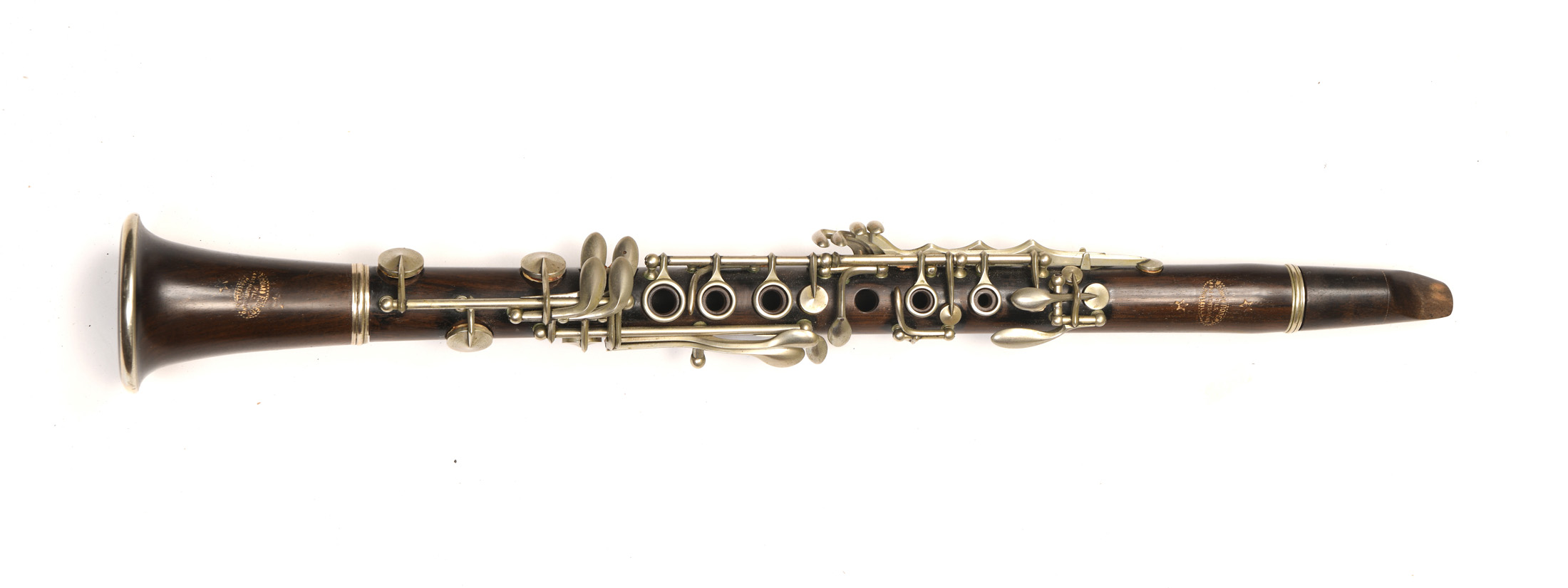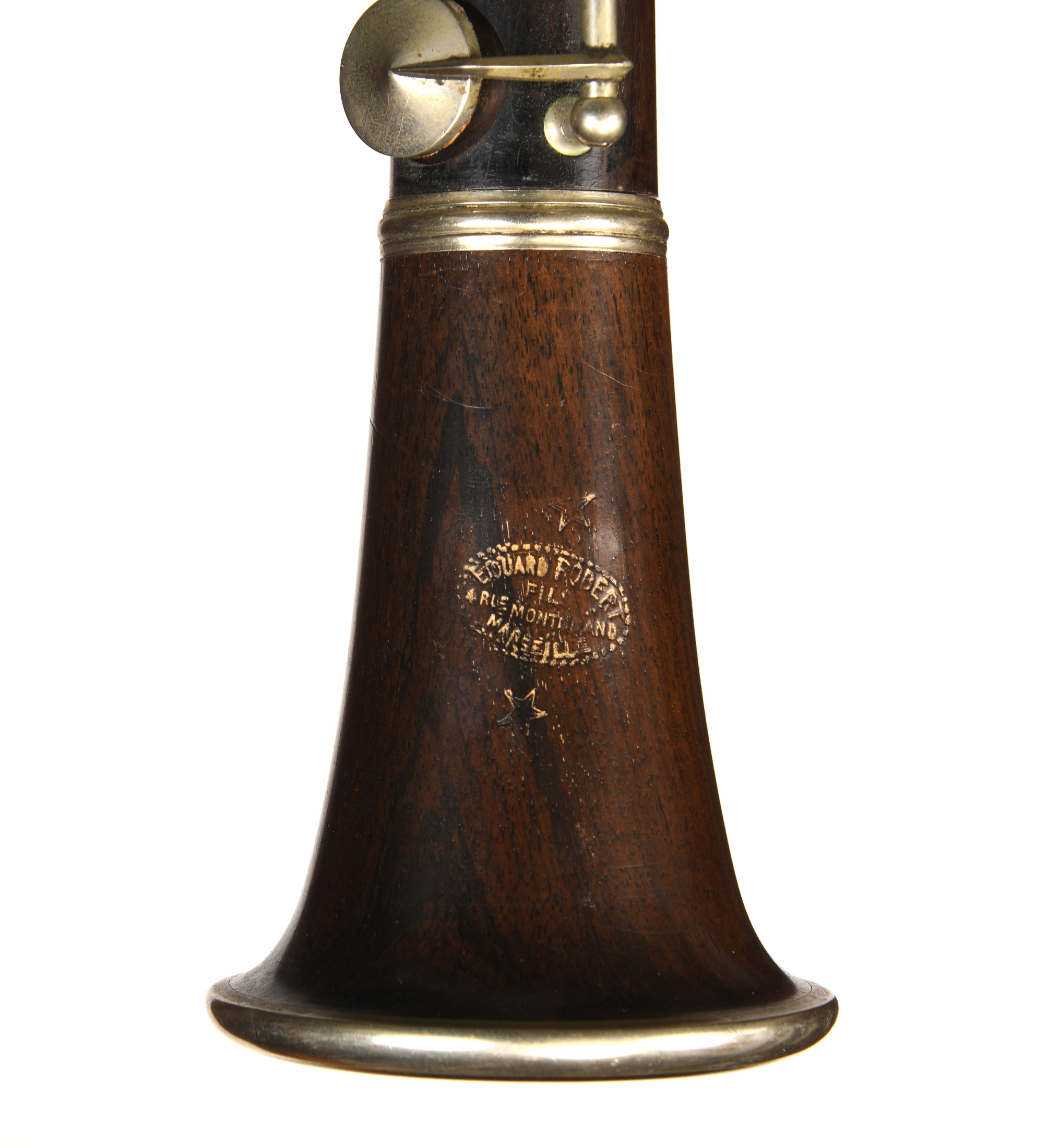 Une clarinette en mi bémol, de marque Edouard ROBERT, à Marseille. En ébène. Montée maillechort.