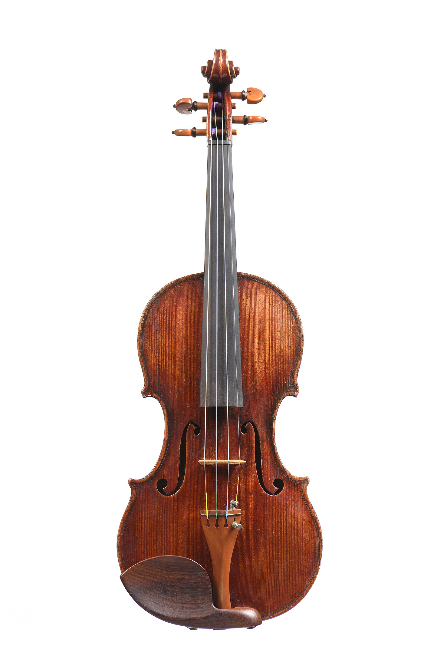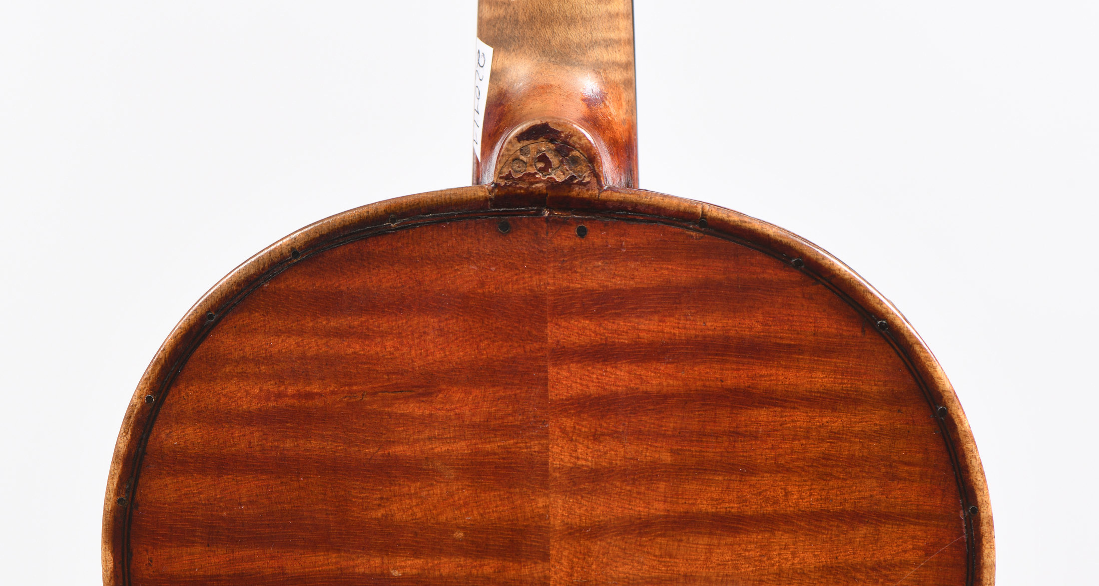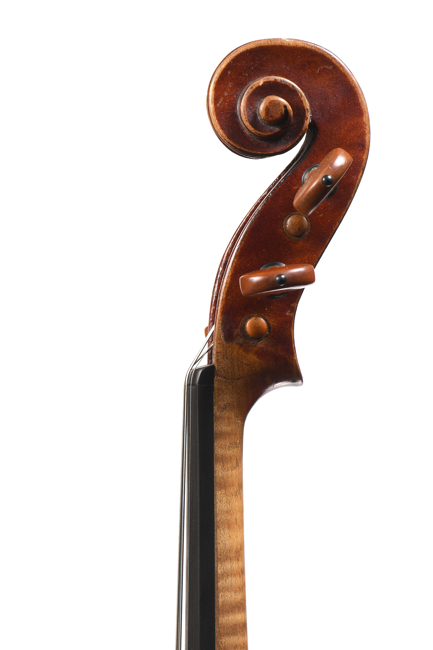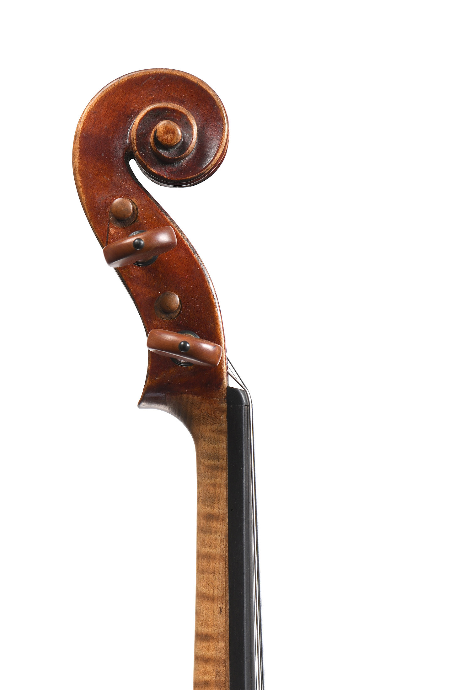 Fond de deux pièces en érable. Vernis brun rouge sur fond doré. Eclisses et tête du même bois. Table en épicéa aux pores larges et irréguliers. 358 mm. Bon état de conservation : violon agrandi (visible au talon du manche).