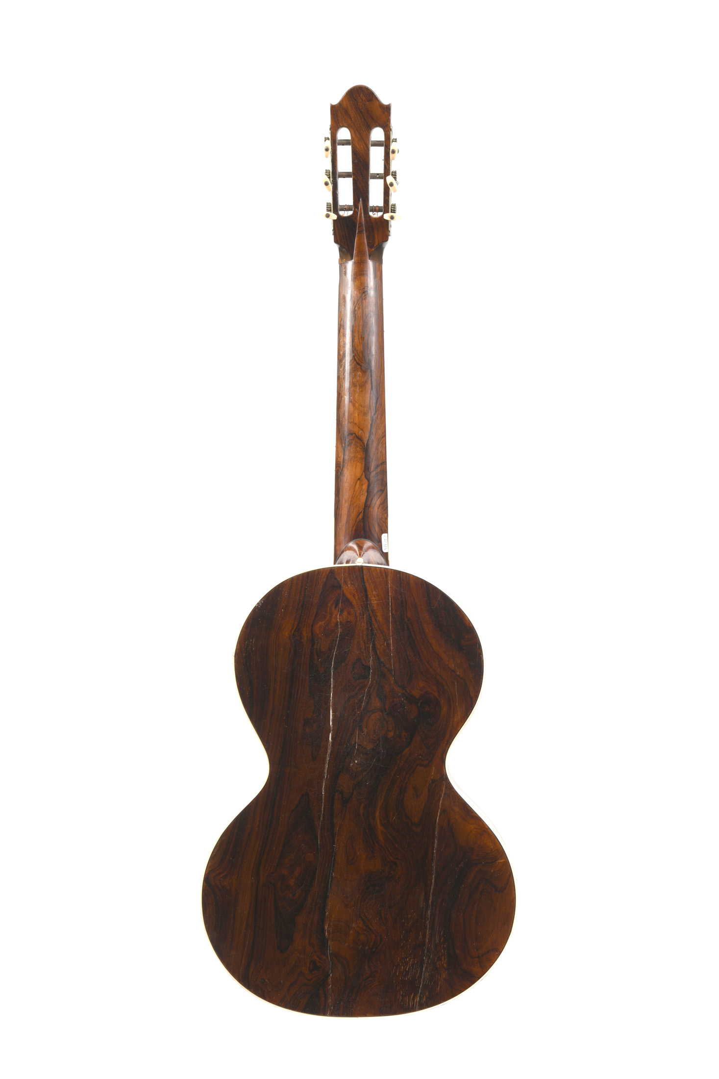Intéressante guitare romantique. Incrustations de nacre. L'ensemble est à restaurer: diverses cassures.