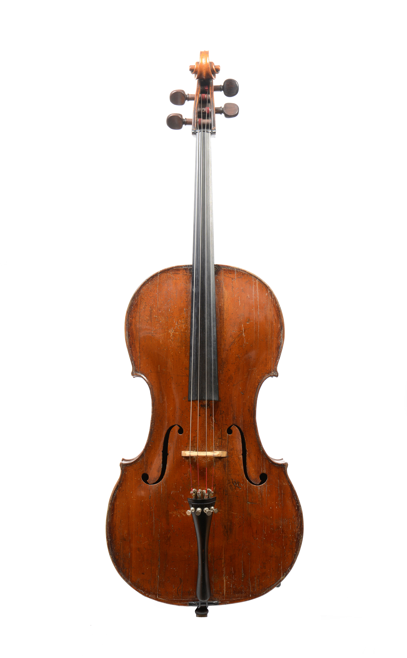 Intéressant violoncelle aux dames, fait au XVIIIe en France. Table en sapin. 705 mm. Diapason moderne. Fond de deux pièces en érable. Cassé, et restauré au talon du manche. Diverses cassures réparées à la table, aux éclisses. L'ensemble à restaurer.