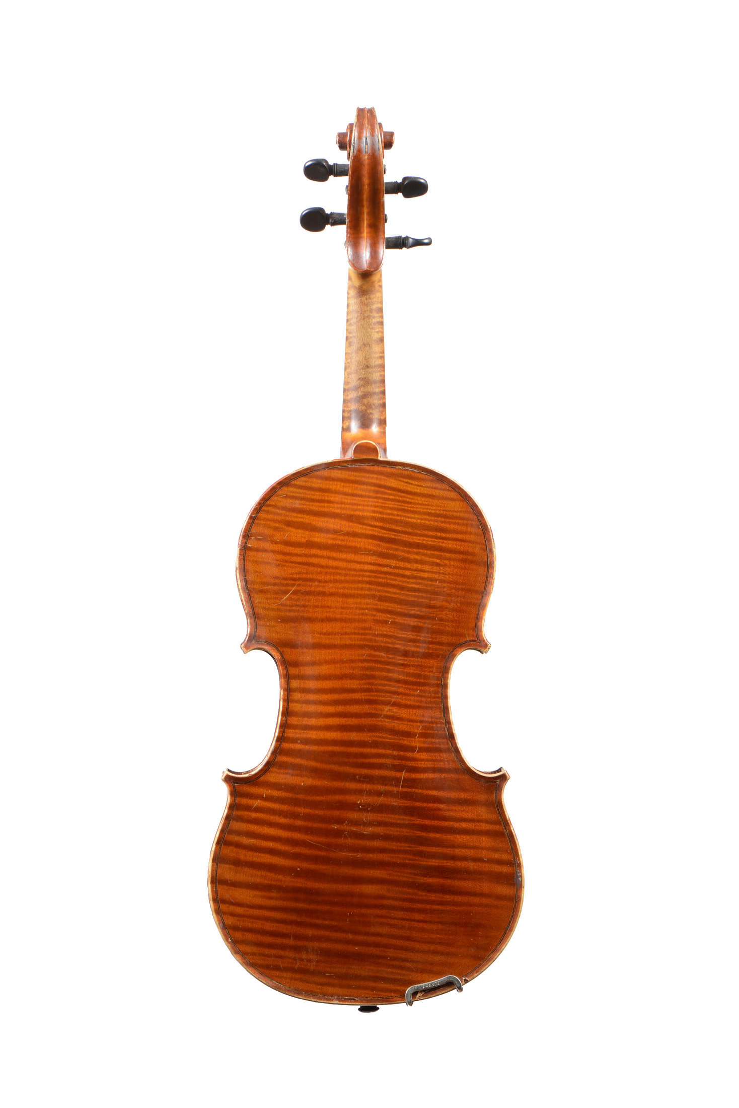 portant une étiquette "Carlo Bergonzi 1729". Fait à Mirecourt vers 1920, en modèle de Bergonzi. Fond d'une pièce. Vernis brun rouge sur fond doré. 347 mm. Avec boite et archet d'étude. Bon état général. Traces d'usures aux éclisses.
