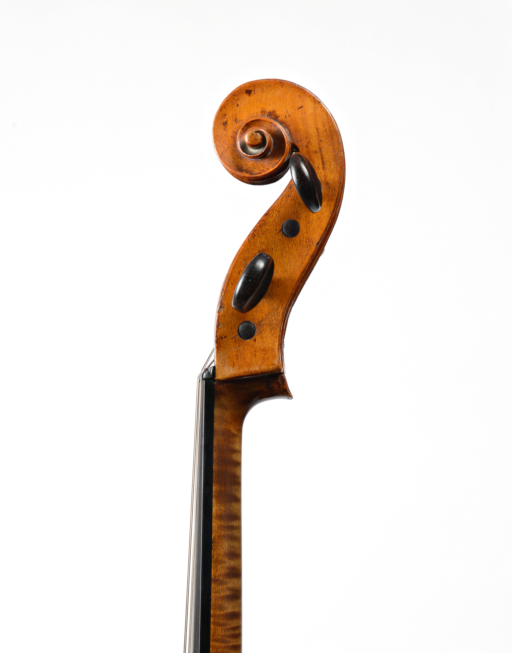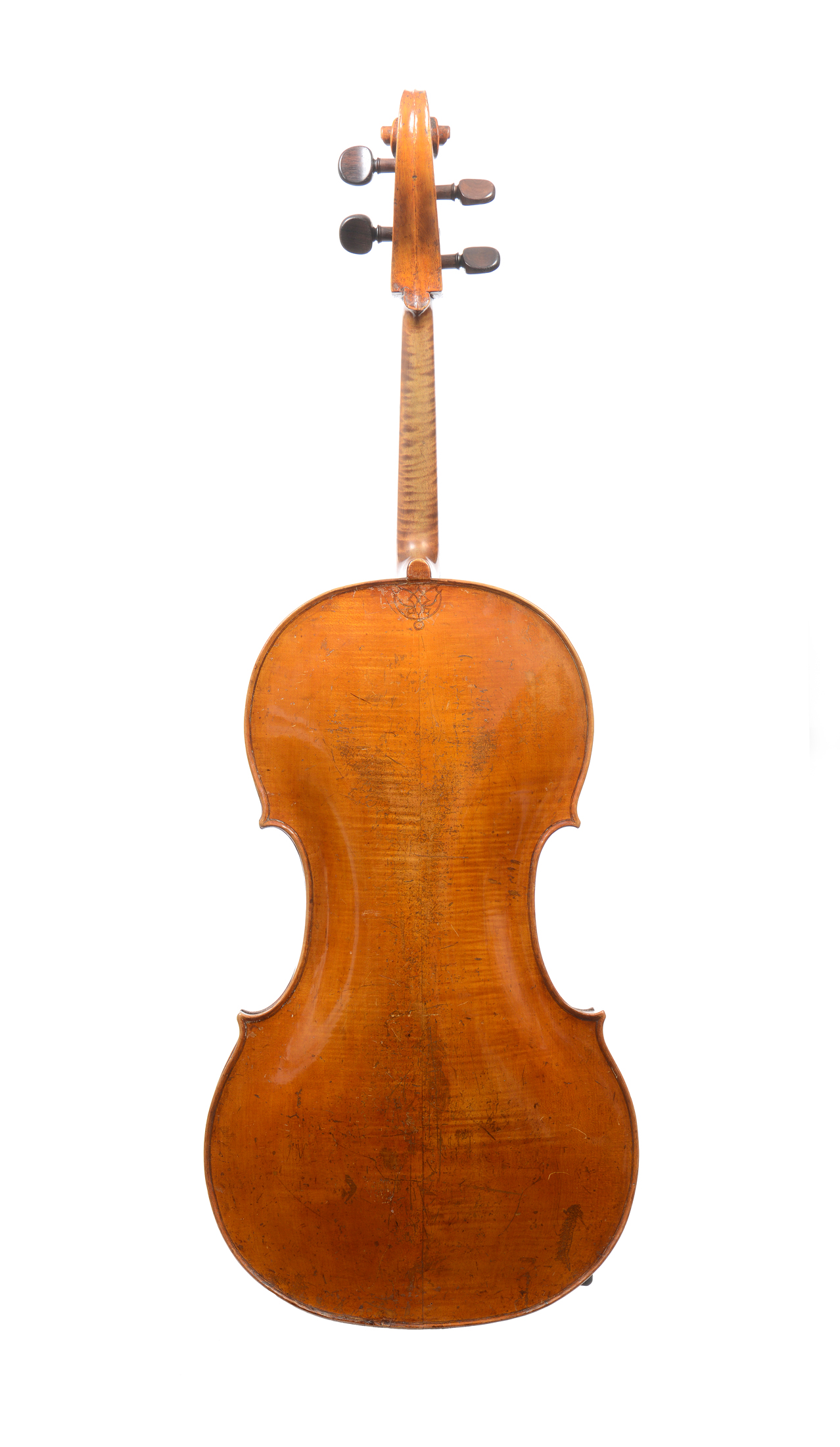 Intéressant violoncelle aux dames, fait au XVIIIe en France. Table en sapin. 705 mm. Diapason moderne. Fond de deux pièces en érable. Cassé, et restauré au talon du manche. Diverses cassures réparées à la table, aux éclisses. L'ensemble à restaurer.