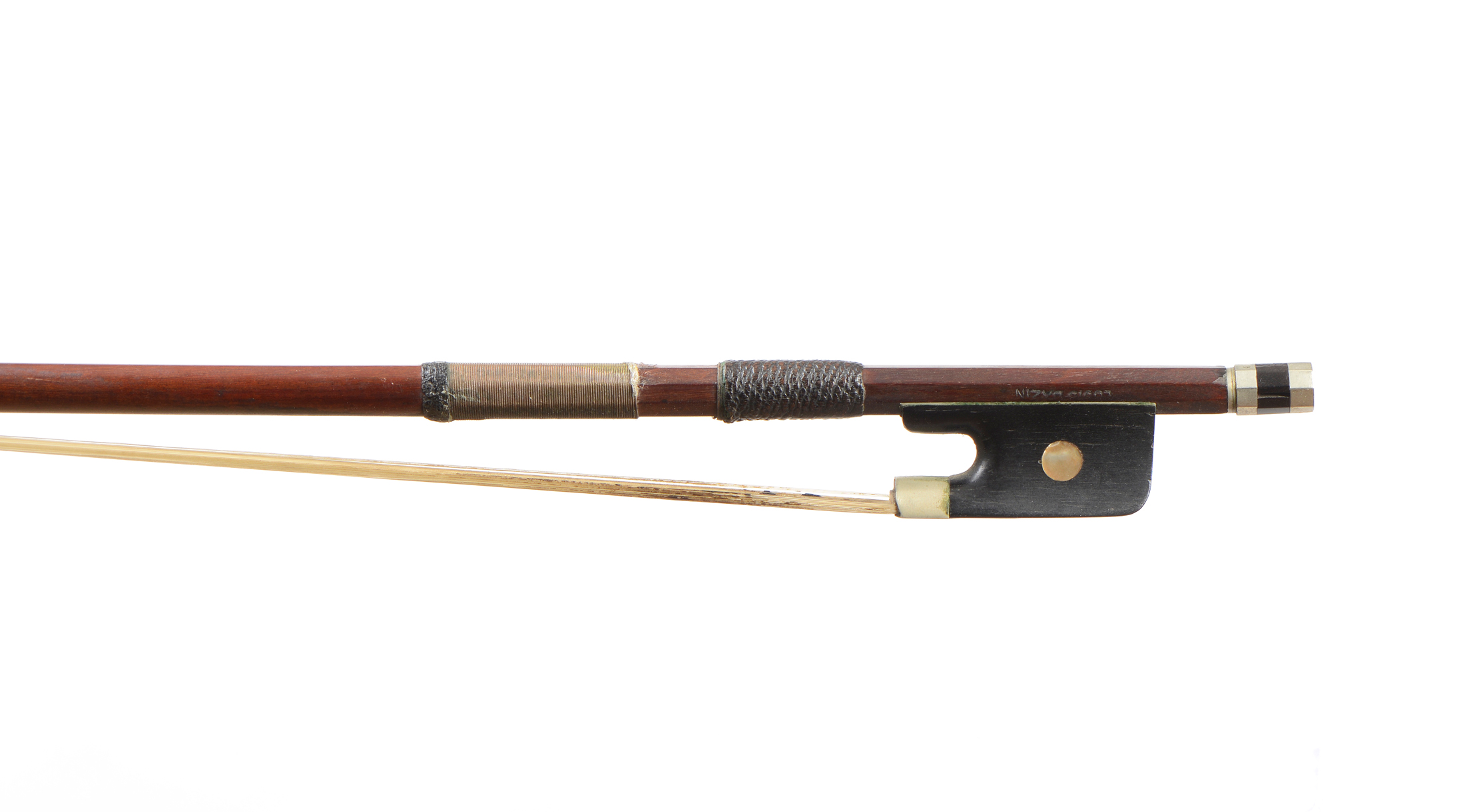 portant une marque au fer de LOUIS BAZIN. Baguette ronde en bois de pernambouc. La Hausse est en ébène montée maillechort. 727 mm. 60g.