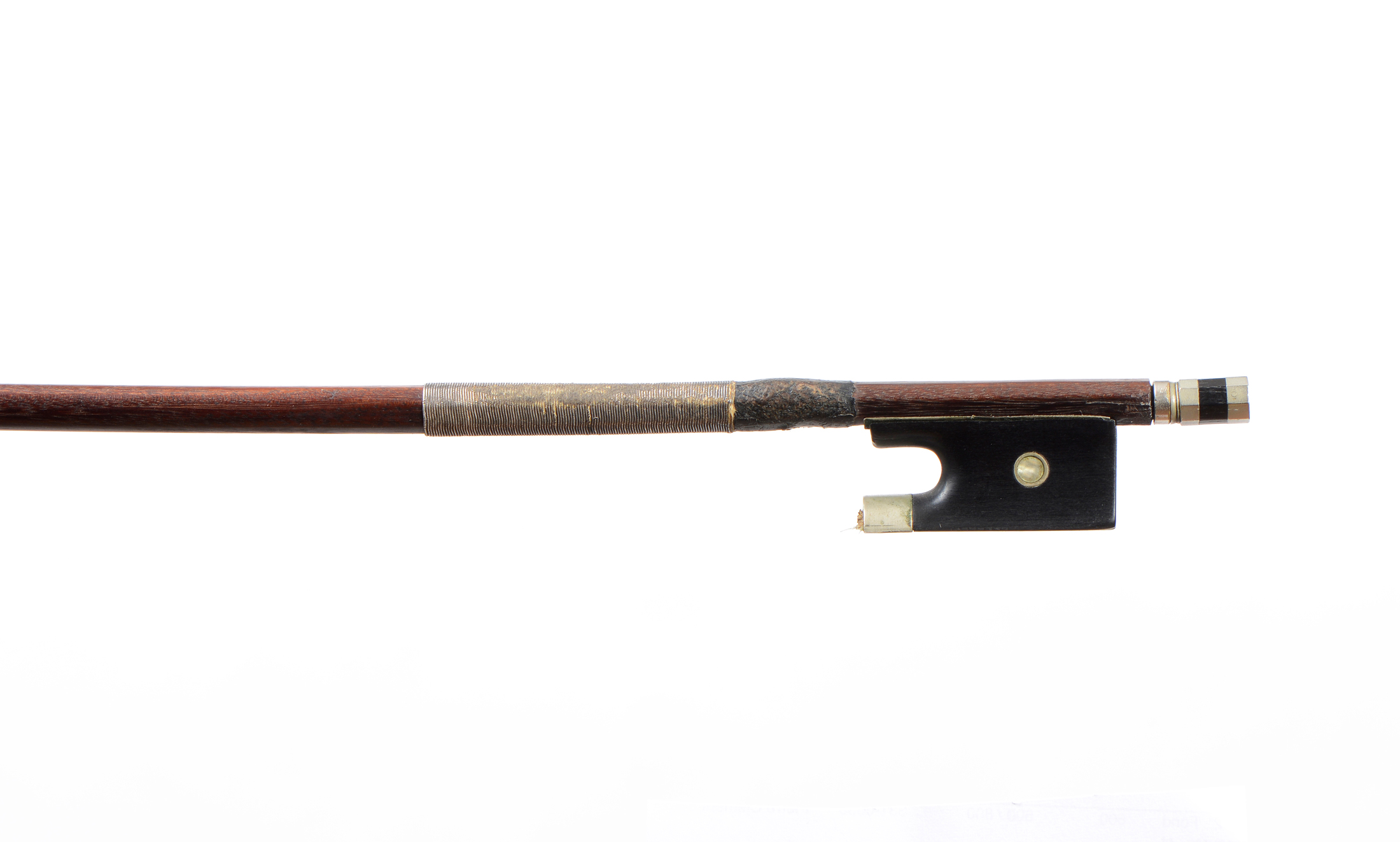 fait à la fin du XIXe. Français Anonyme. Baguette en pernambouc. Hausse ébène montée maillechort. 729 mm. Bouton plus récent. 54 g sans mèche, ni garniture.